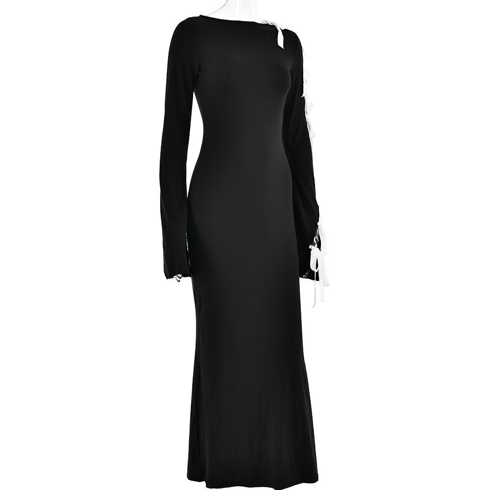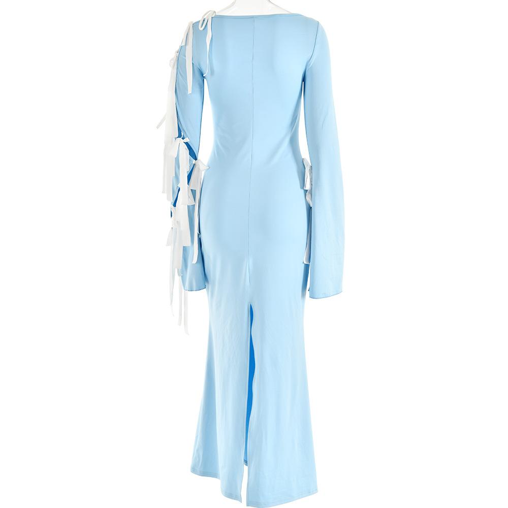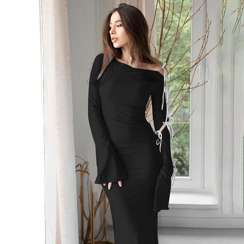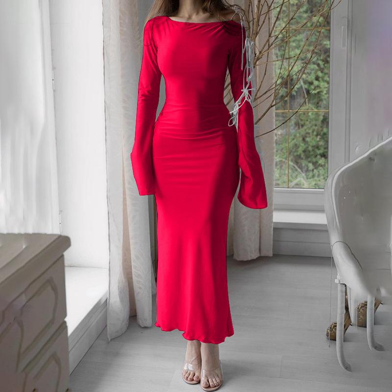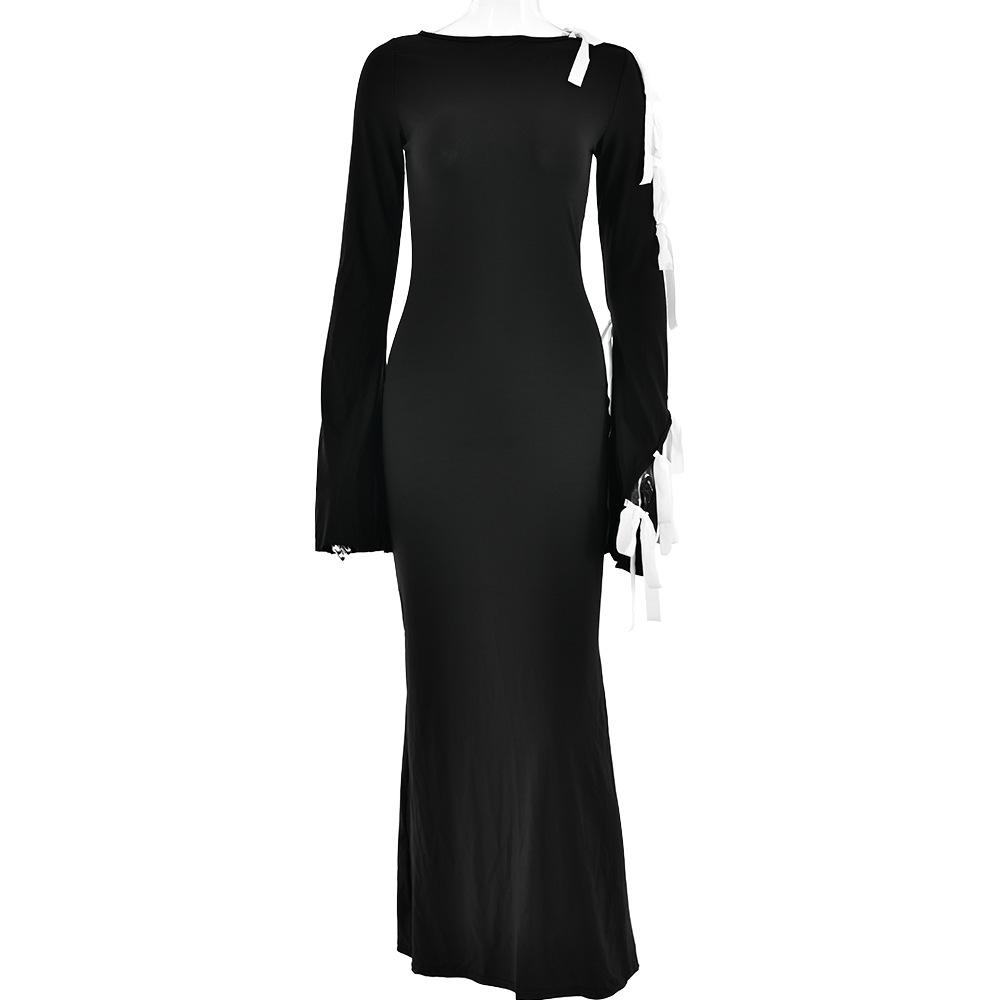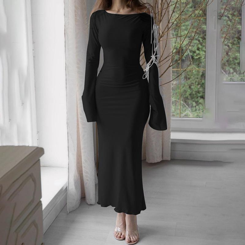 Nuevo vestido largo de vaina con abertura, de encaje con costuras, manga larga acampanada con hombros descubiertos, moda sexy transfronteriza europea y americana para mujer