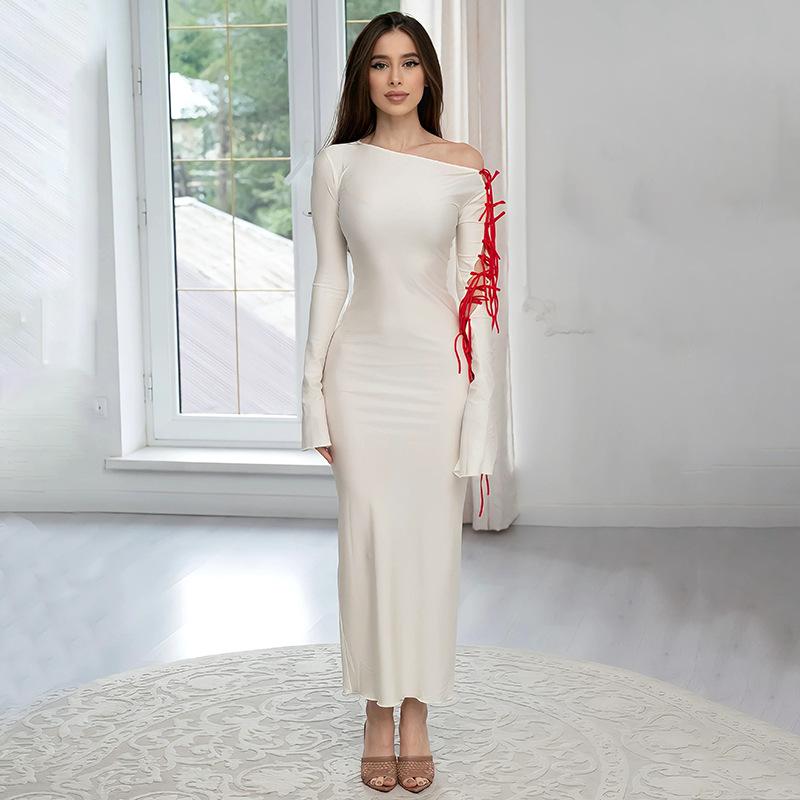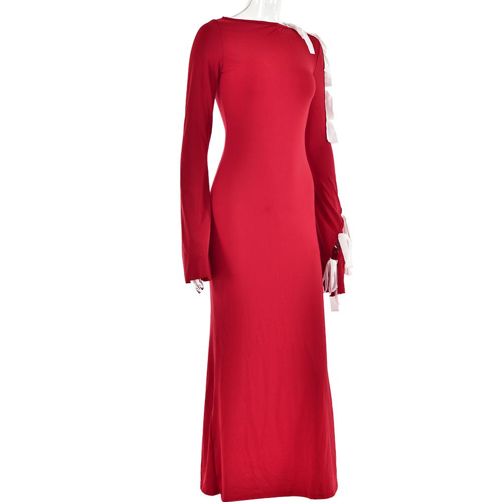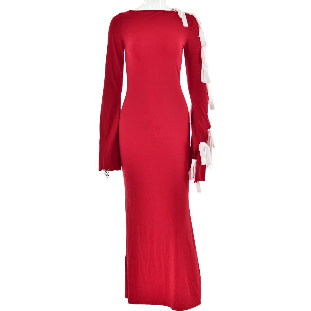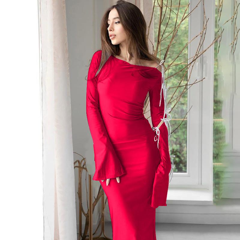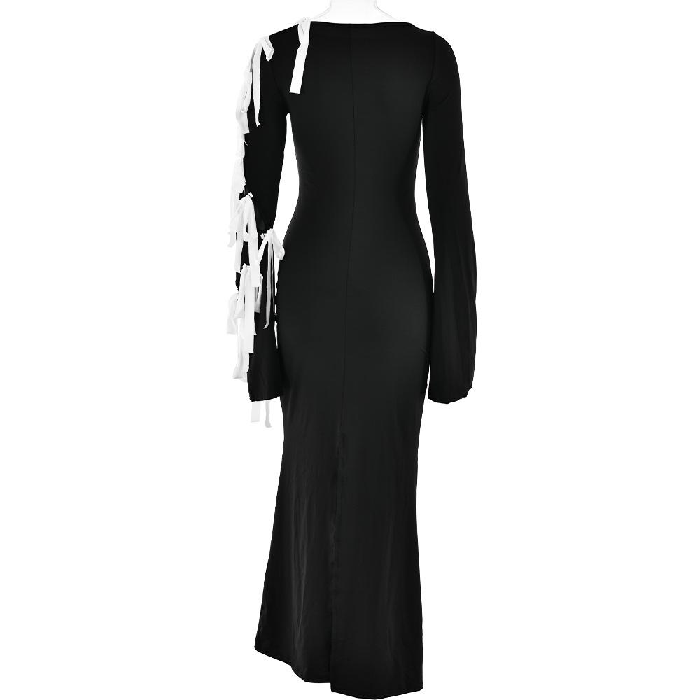 Nuevo vestido largo de vaina con abertura, de encaje con costuras, manga larga acampanada con hombros descubiertos, moda sexy transfronteriza europea y americana para mujer