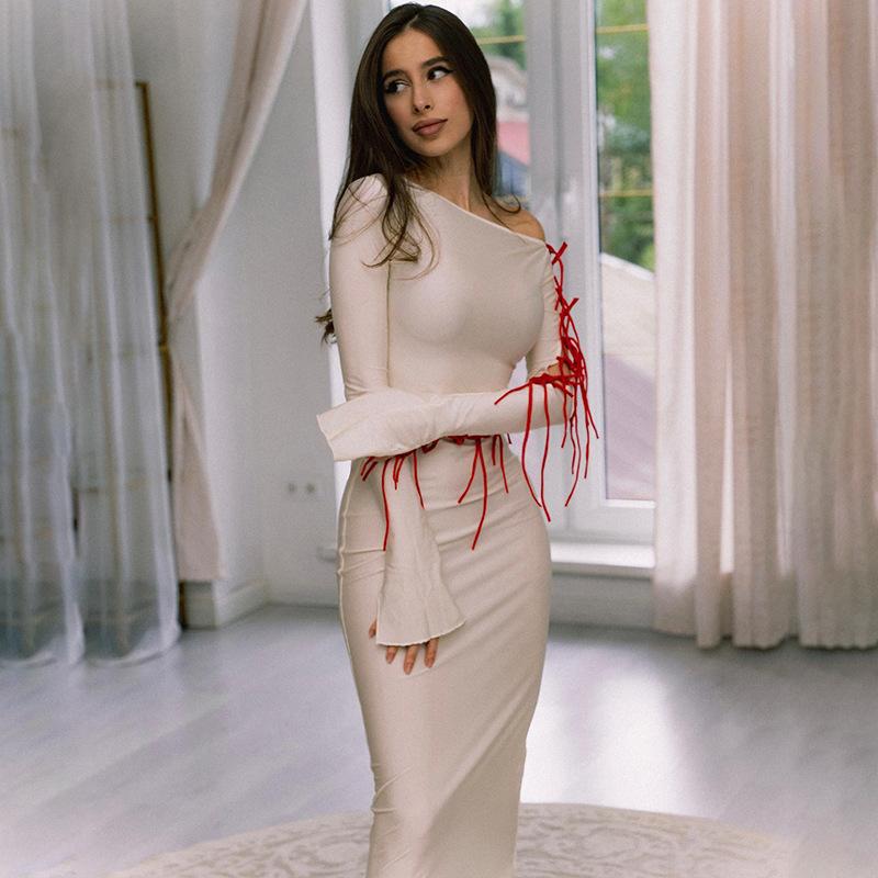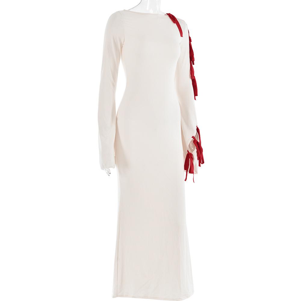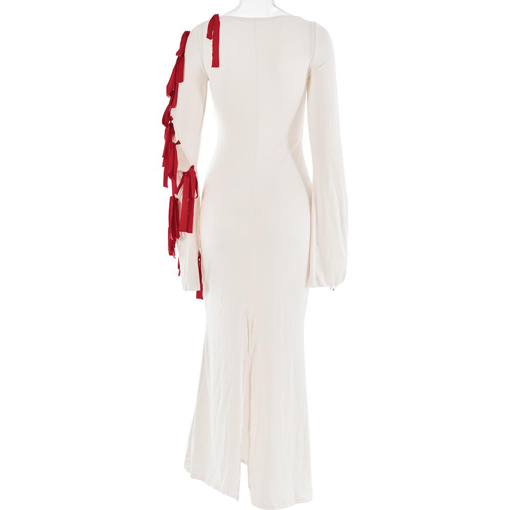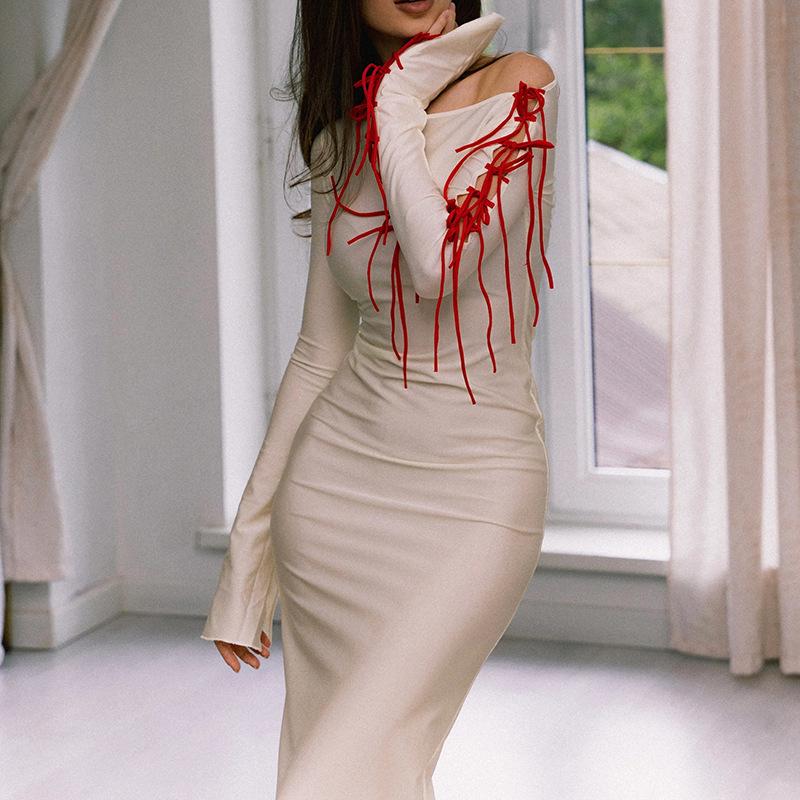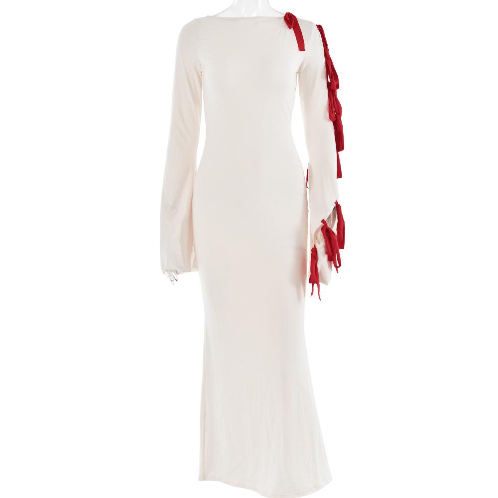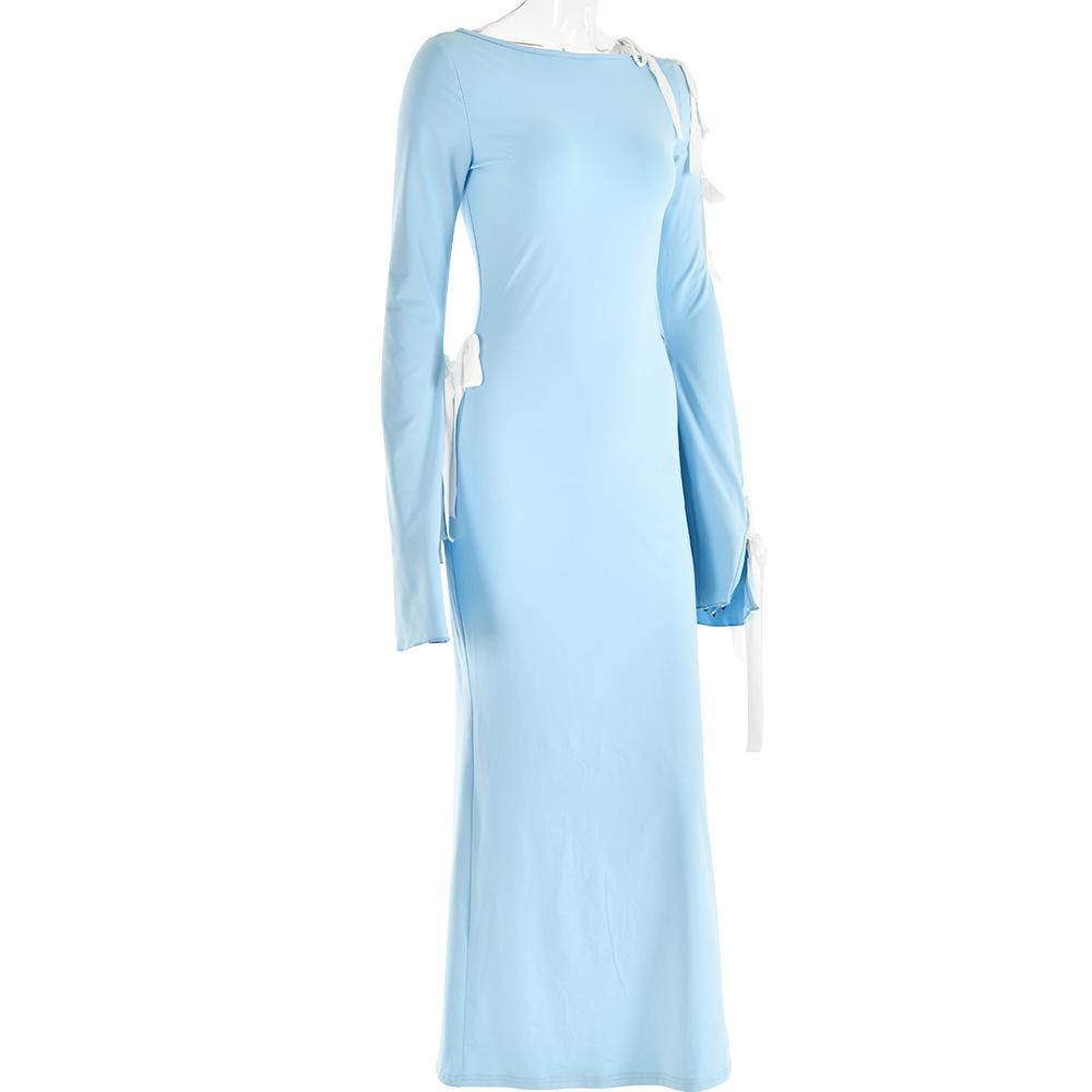 Nuevo vestido largo de vaina con abertura, de encaje con costuras, manga larga acampanada con hombros descubiertos, moda sexy transfronteriza europea y americana para mujer