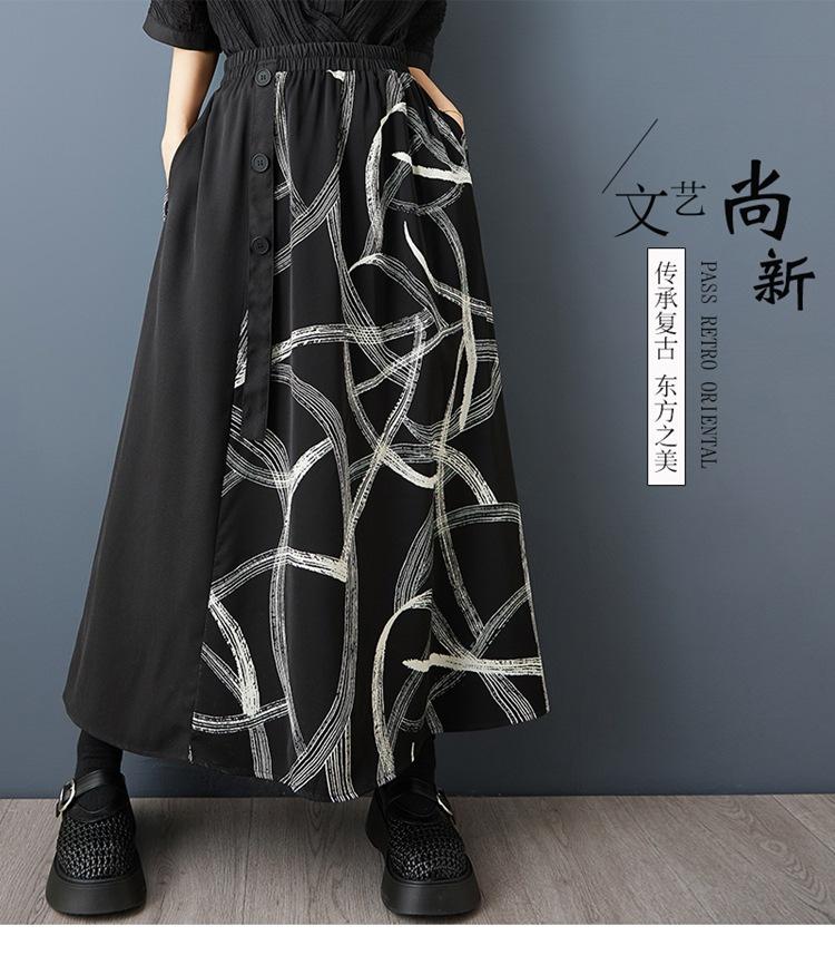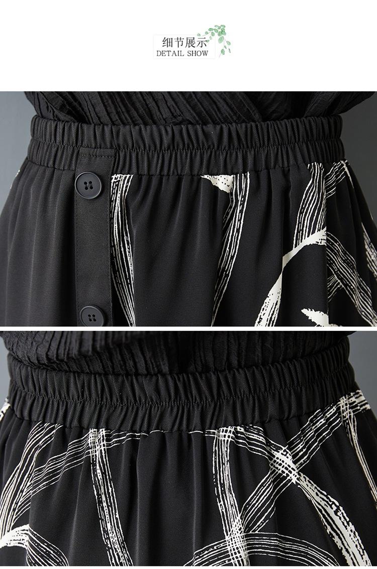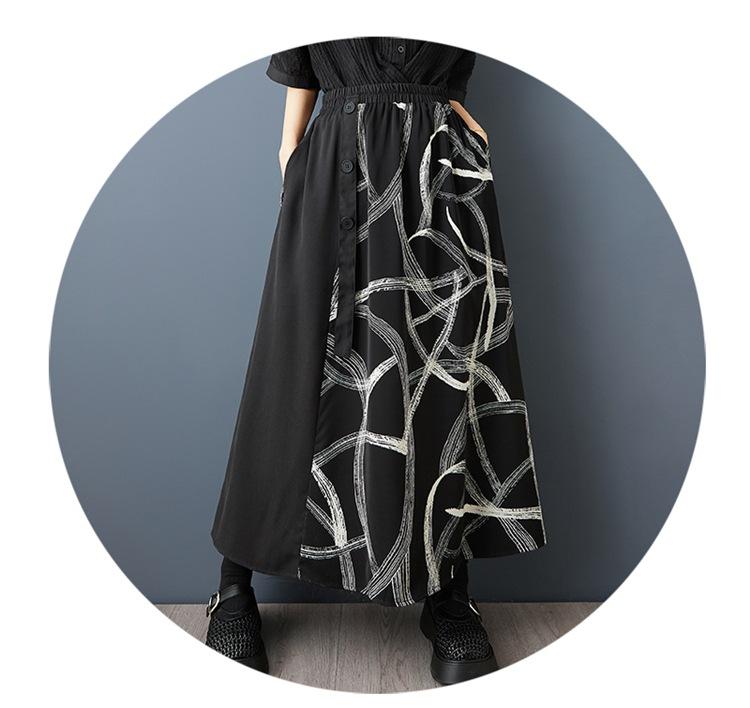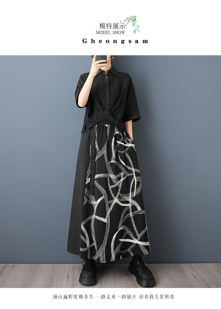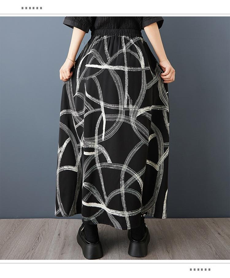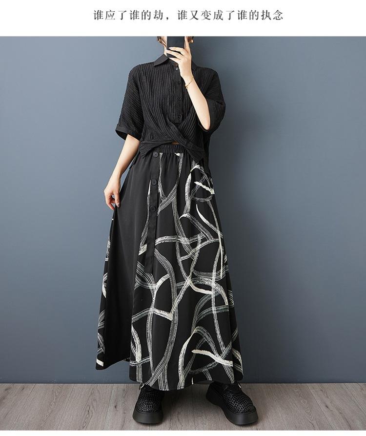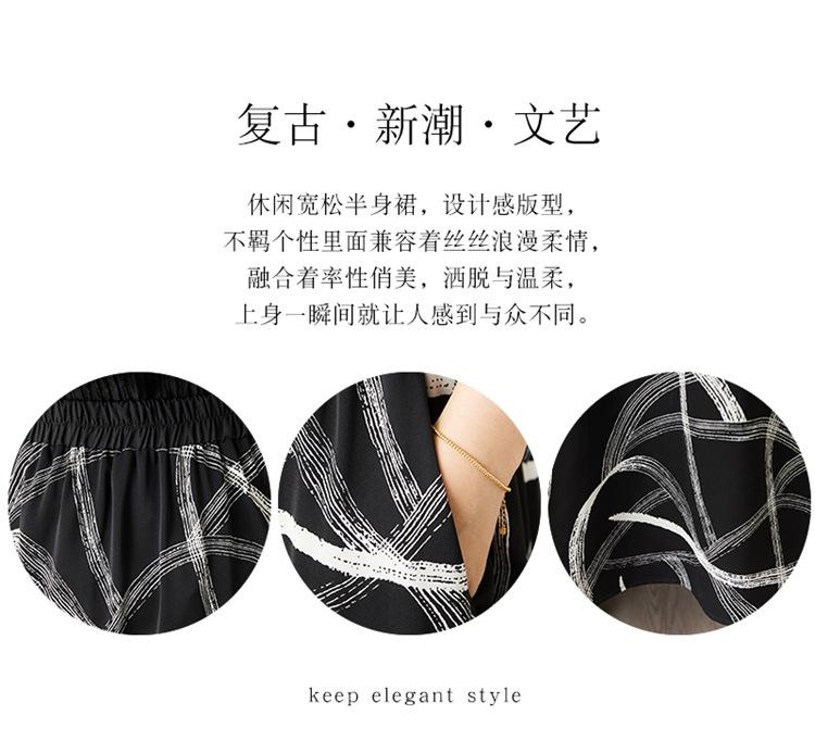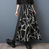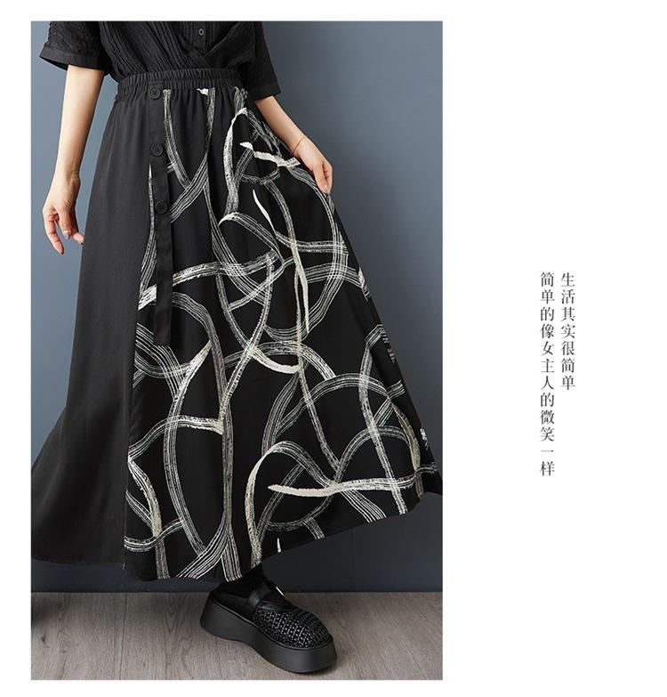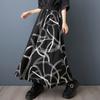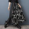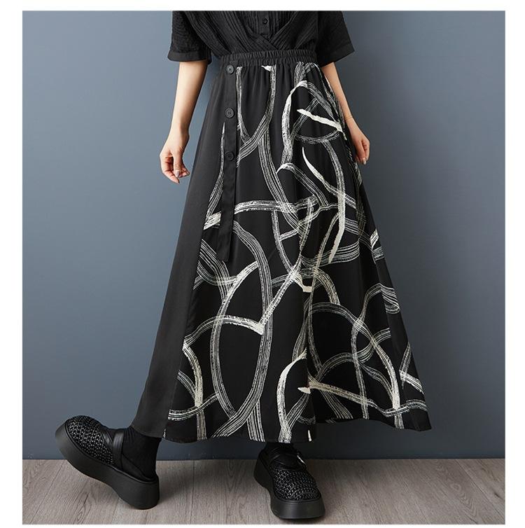 2025 Nuevo Estilo de Verano Falda Literaria Midi Acampanada Suelta y Ajustada Negra Estampado Geométrico Estilo Empalmado