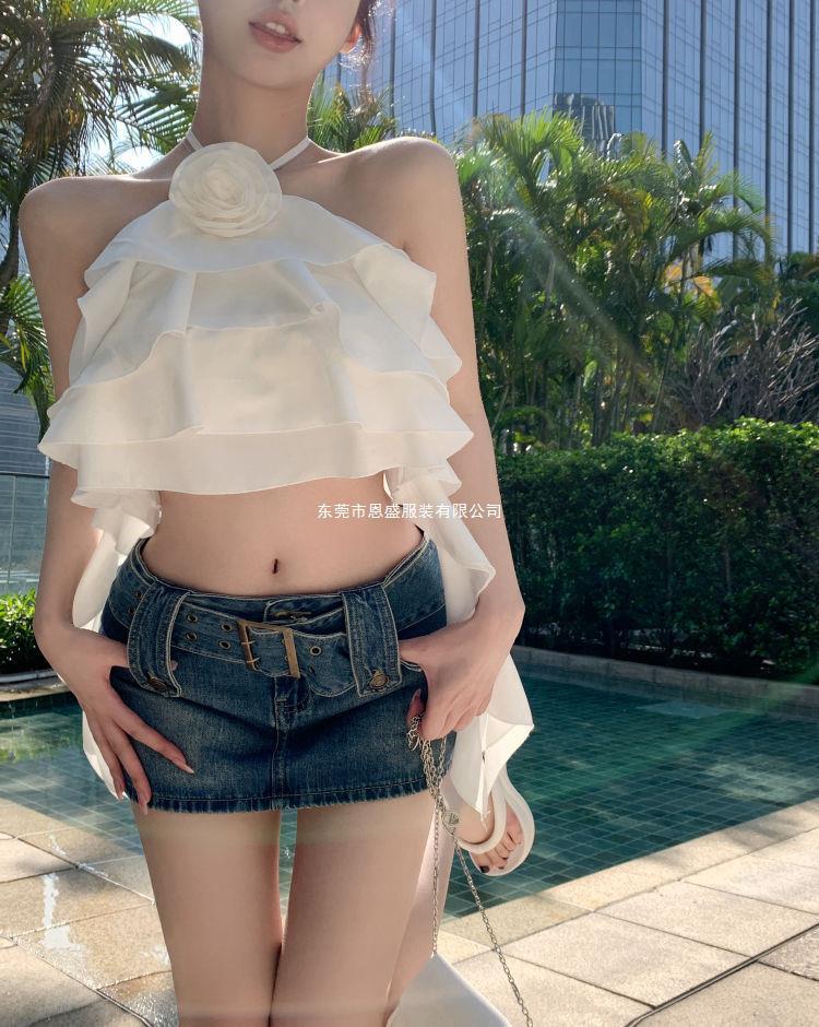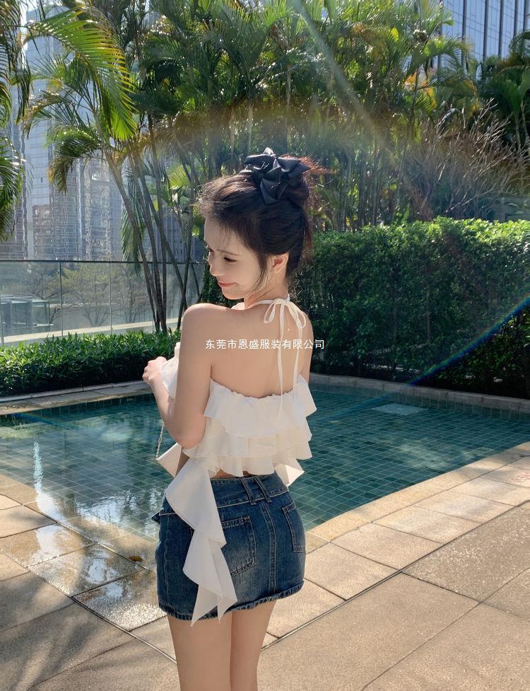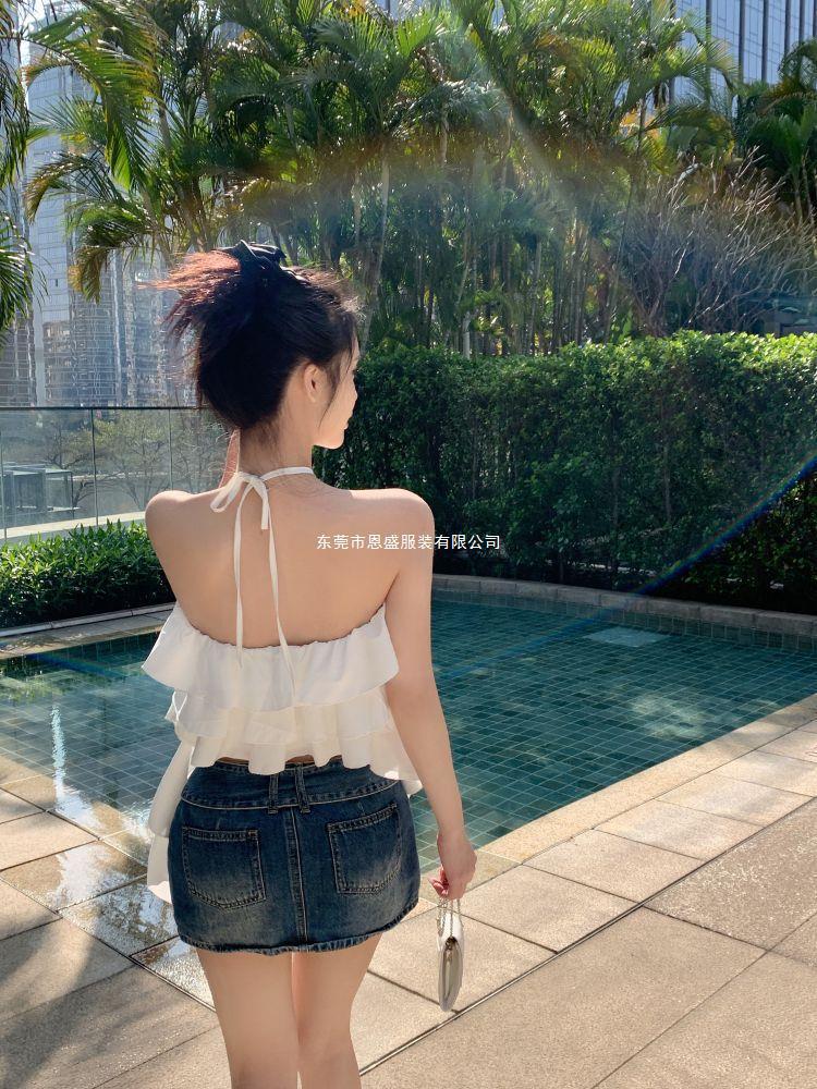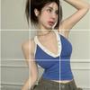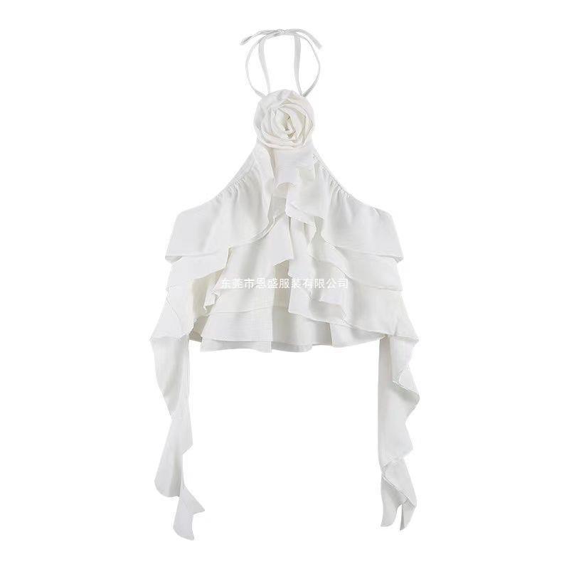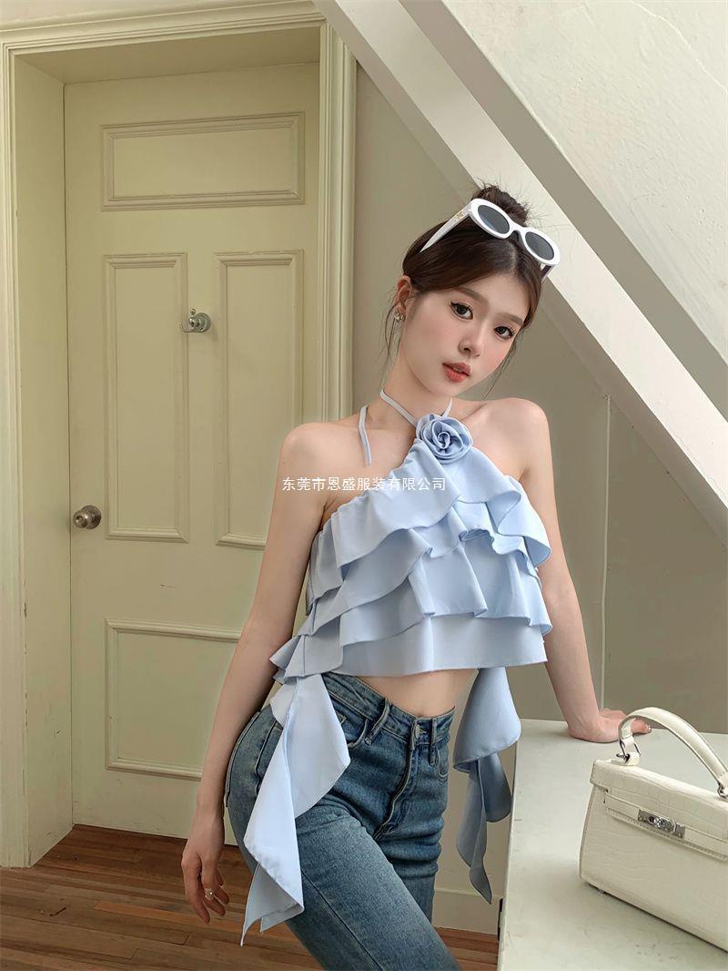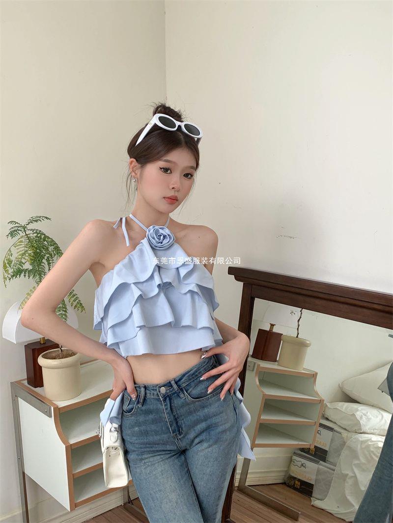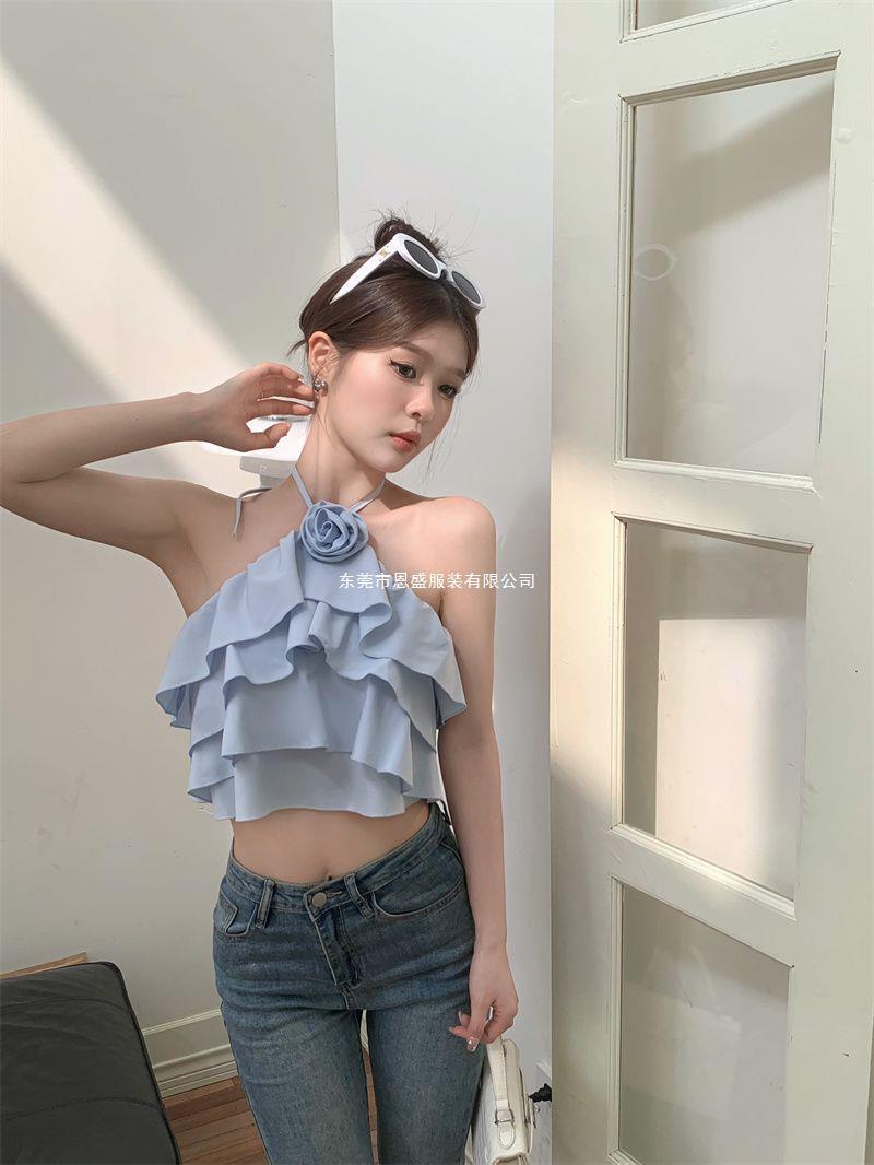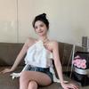 Camisola halter de color sólido con volantes en la espalda descubierta y tirantes finos, nueva de verano, sexy, corta tipo tubo, sin mangas para mujer