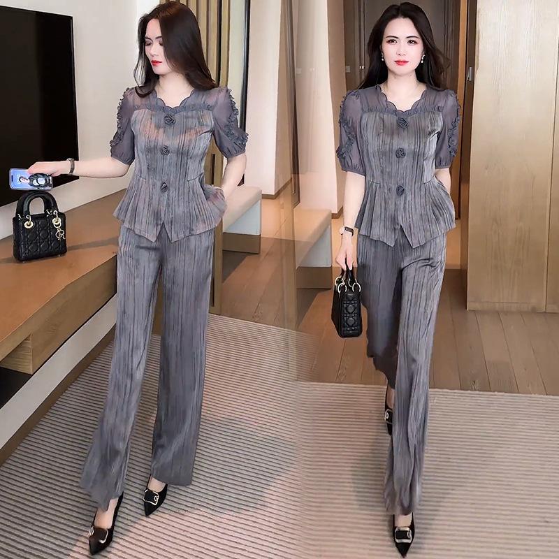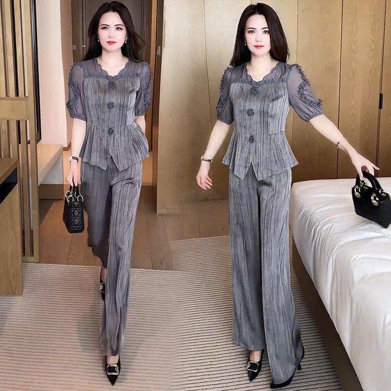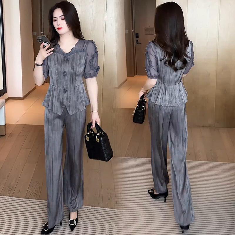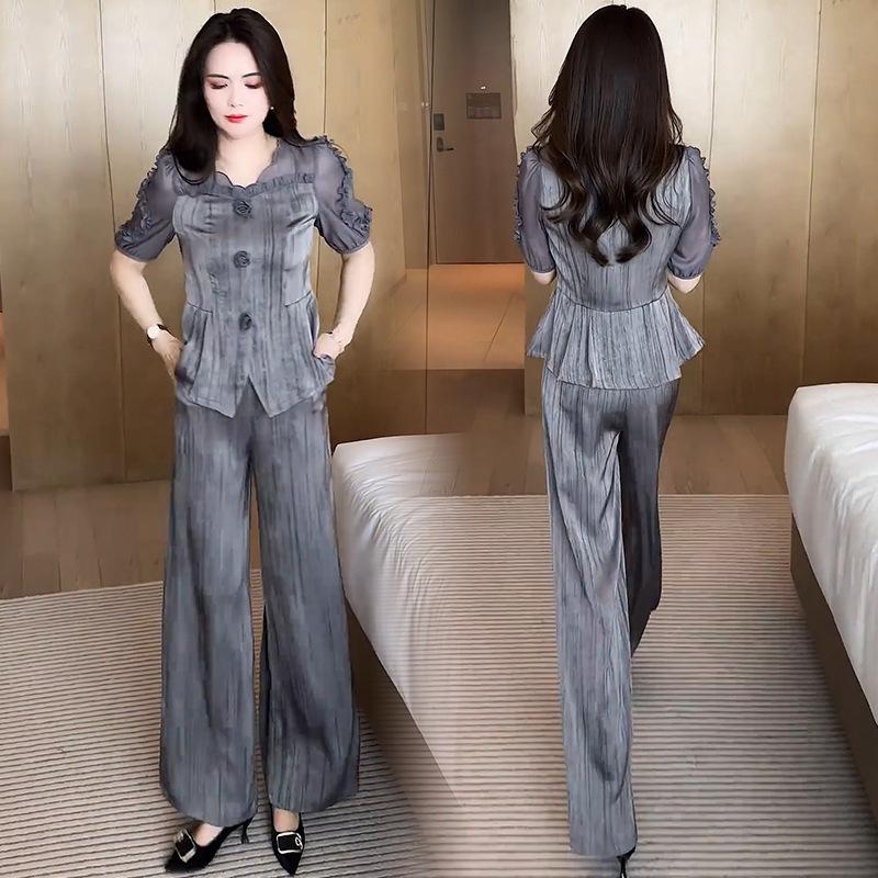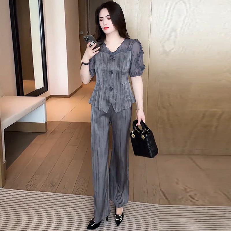 Traje de moda para mujer 2025 Verano Nueva Llegada Occidental Elegante Top de Manga Corta Pantalones de Pierna Ancha Ropa que Reduce la Edad Conjunto de Dos Piezas