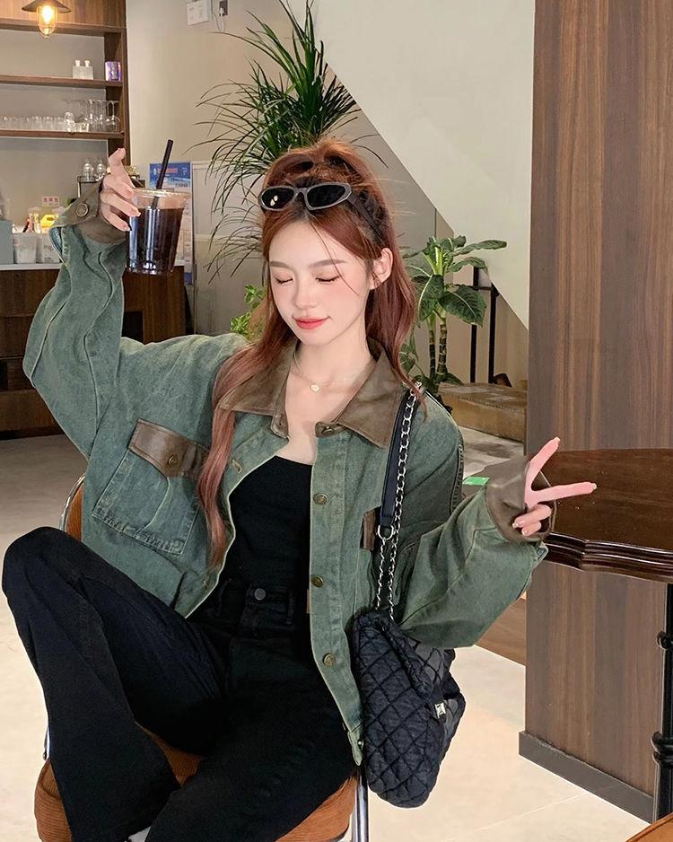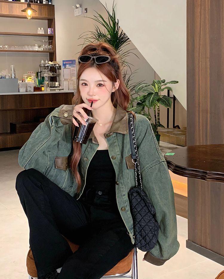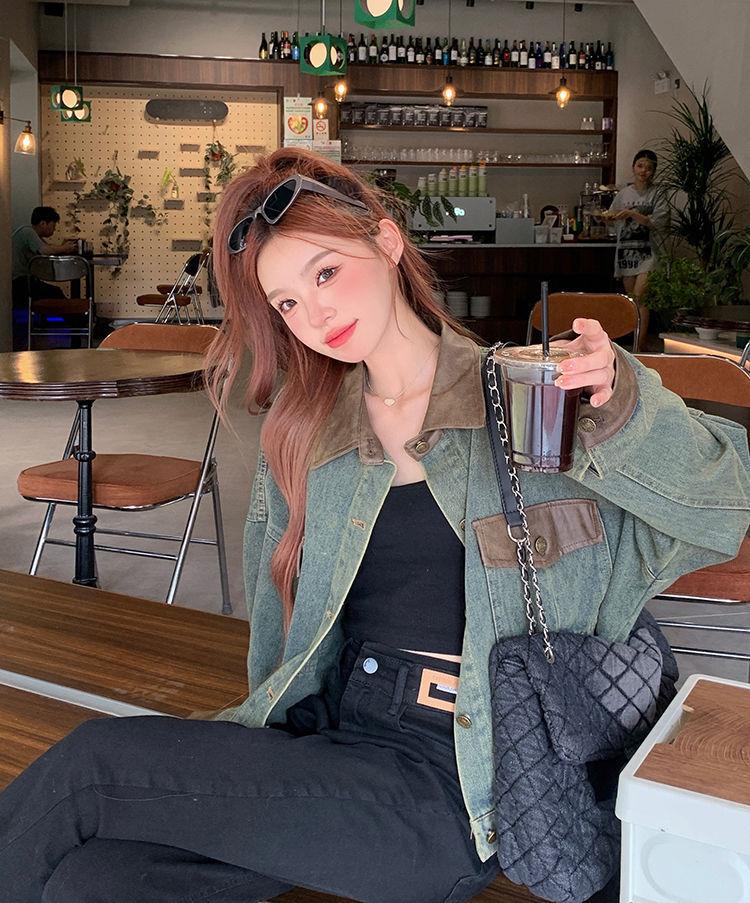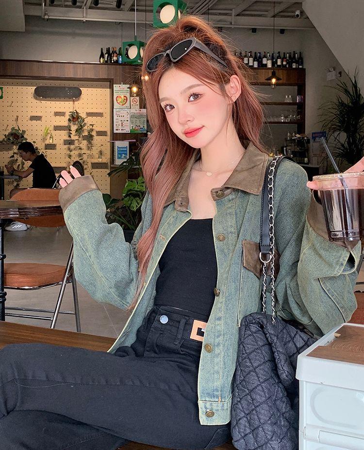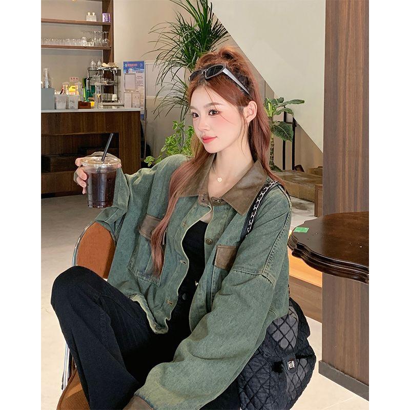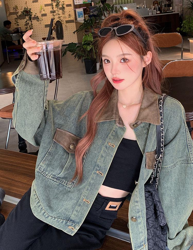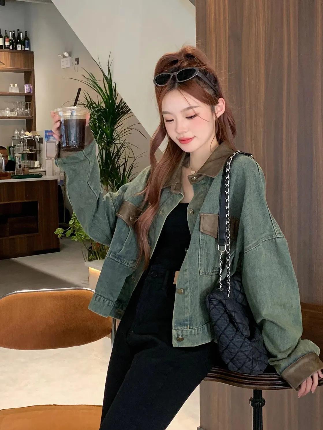 Estilo americano retro chic de ropa de trabajo Abrigo de mezclilla para mujer otoño 2023 nuevo dulce cool chica hot costuras top holgado