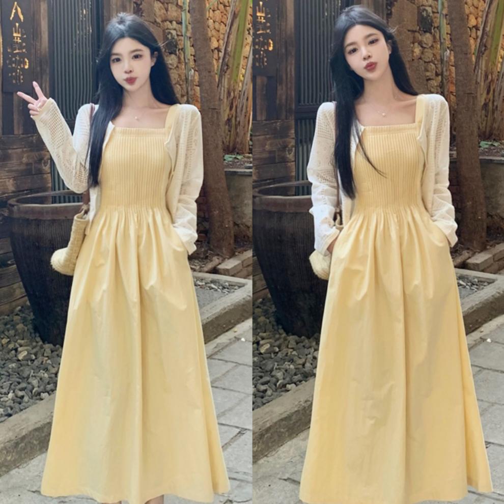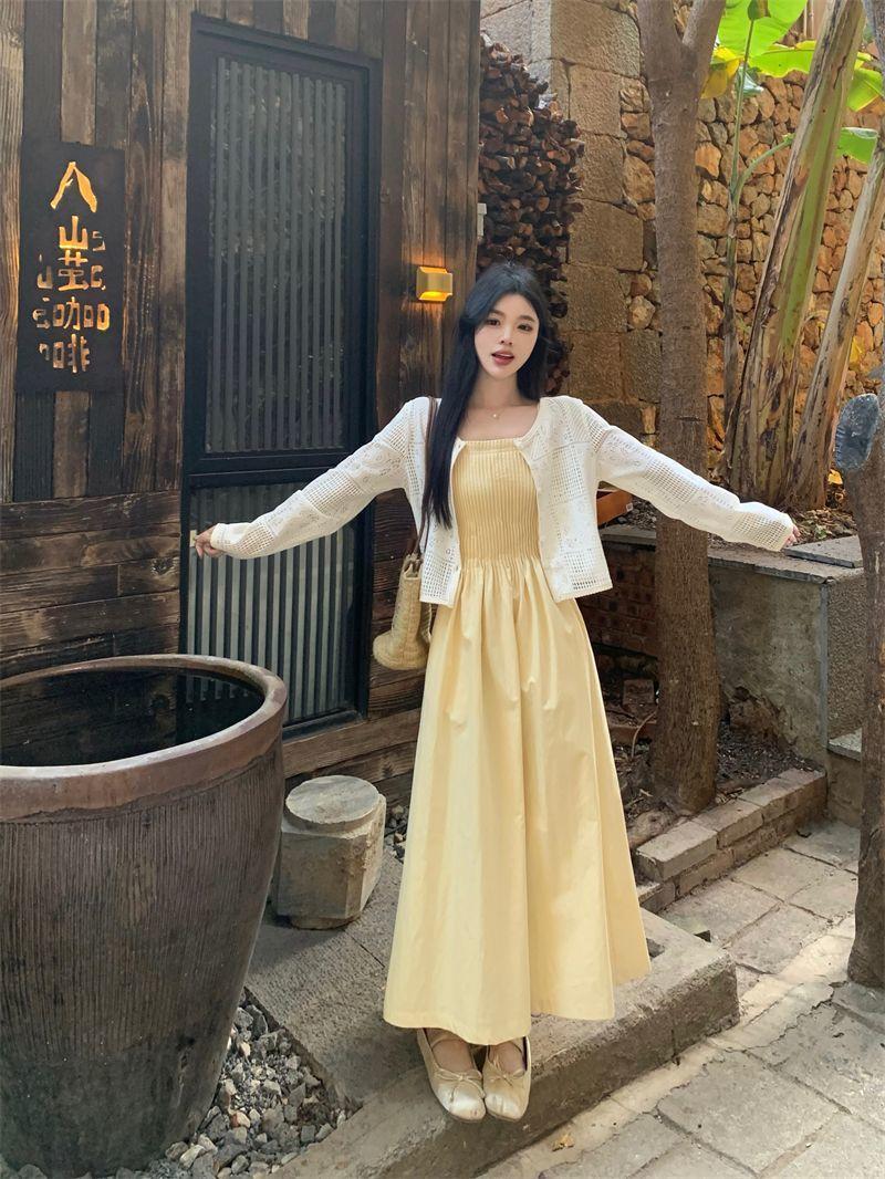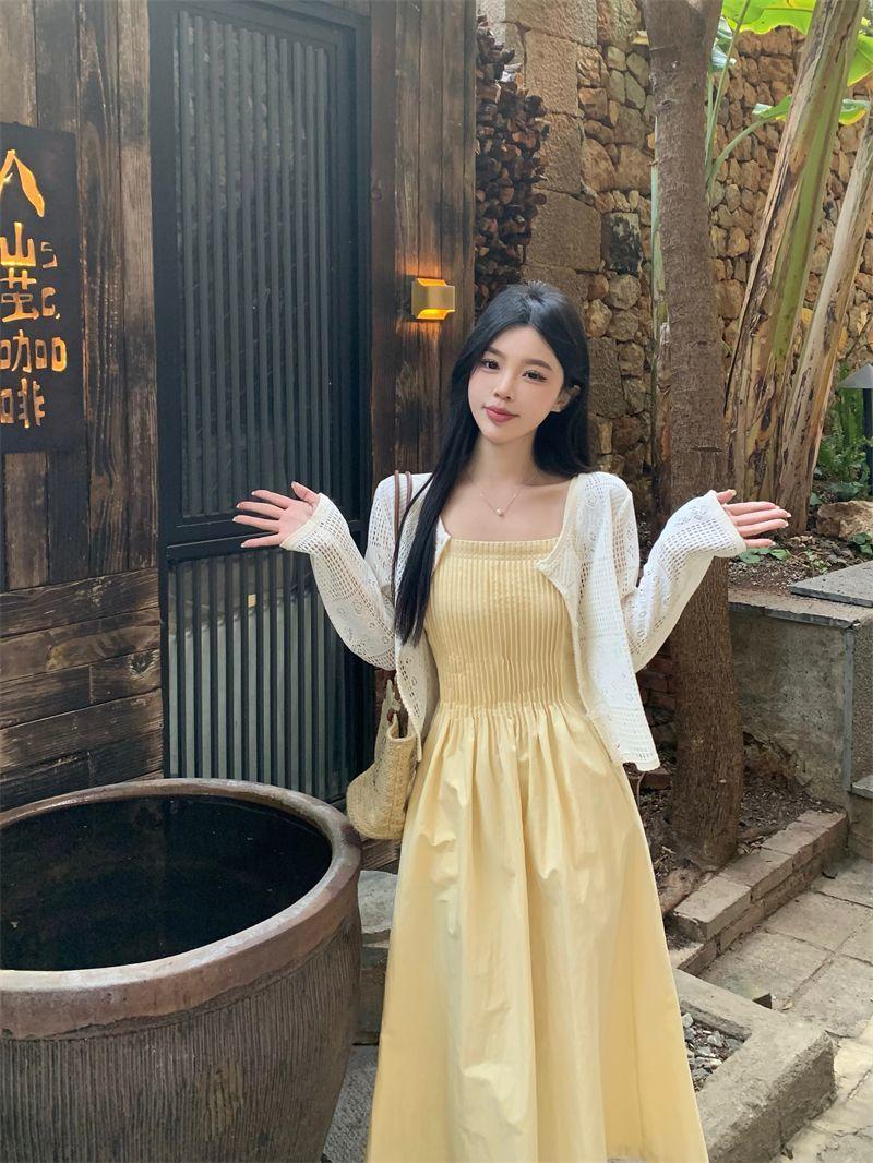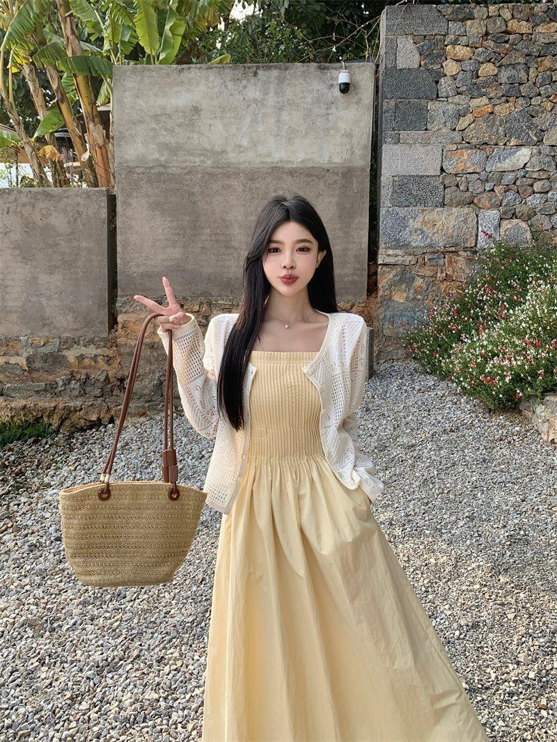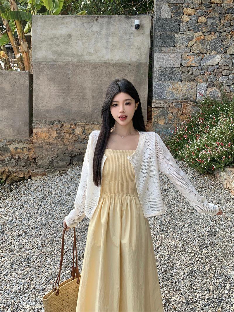 Vestido de Tirantes Huecos Suave Estilo Francés Coreano Talla Grande Traje de Cárdigan de Verano Protección Solar Moda Dos Piezas