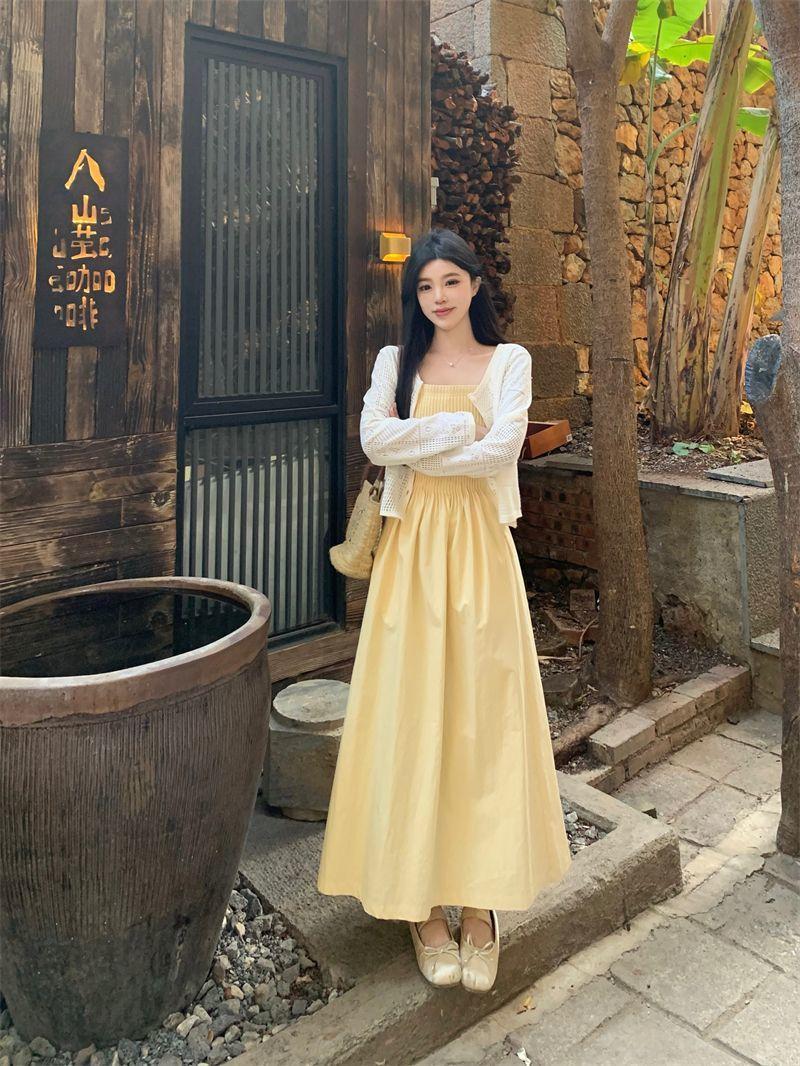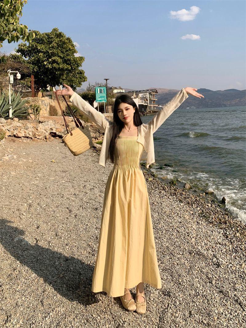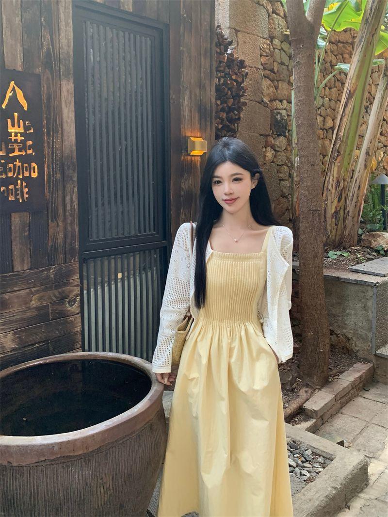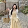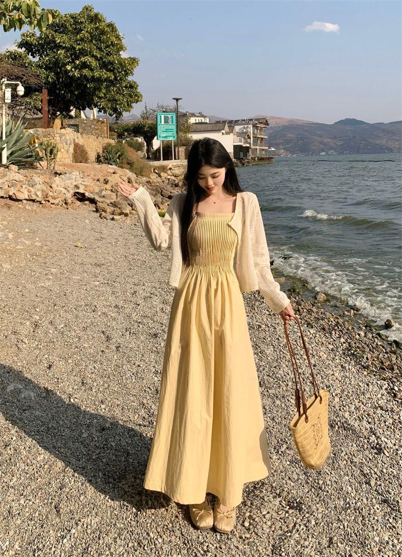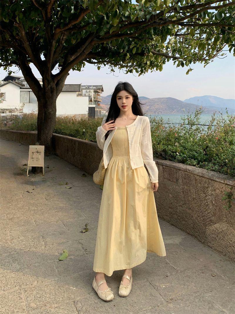 Vestido de Tirantes Huecos Suave Estilo Francés Coreano Talla Grande Traje de Cárdigan de Verano Protección Solar Moda Dos Piezas