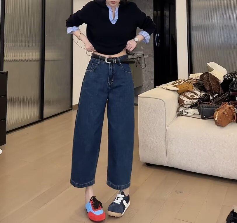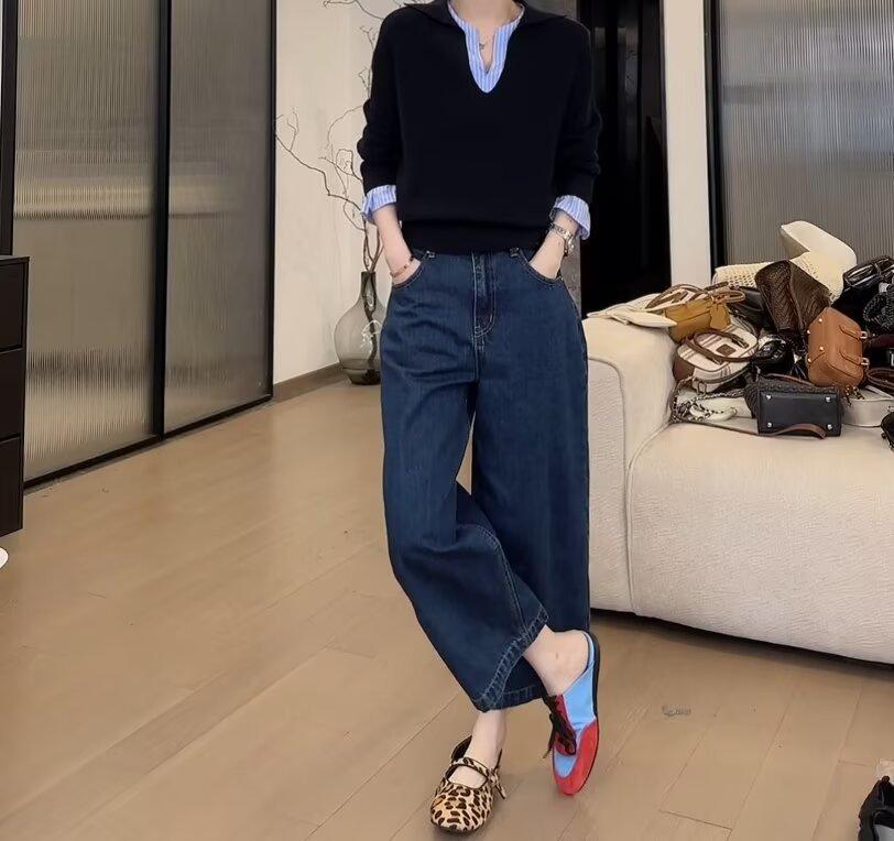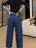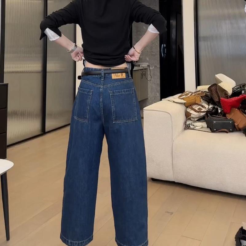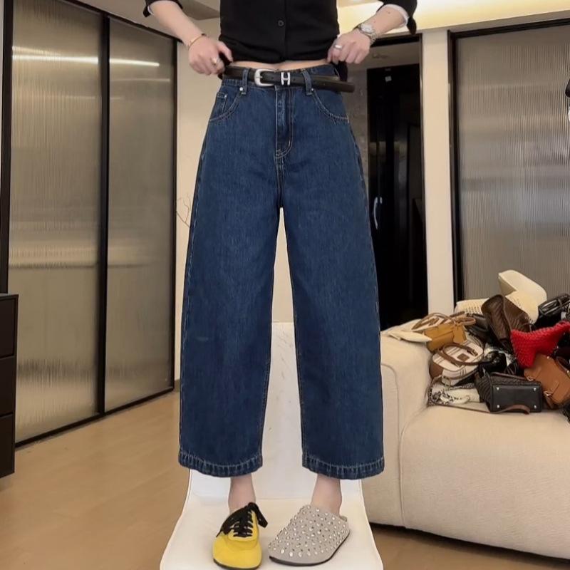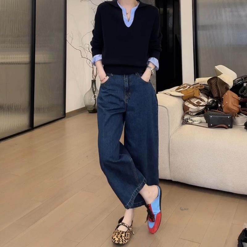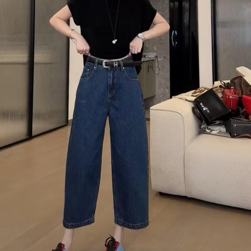 Pantalones Nueve Puntos Jeans Rectos para Mujer 2025 Verano Nuevo Estilo Coreano Cintura Alta Adelgazantes Sueltos Versátiles Azul Oscuro Pantalones Pierna Ancha