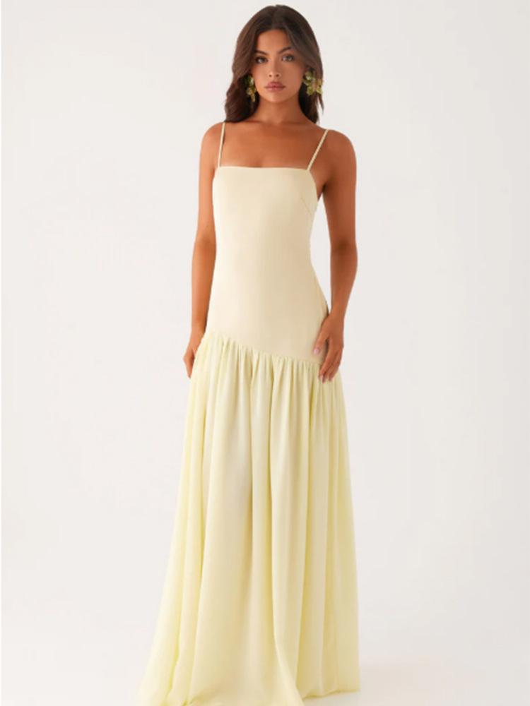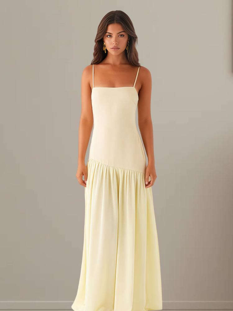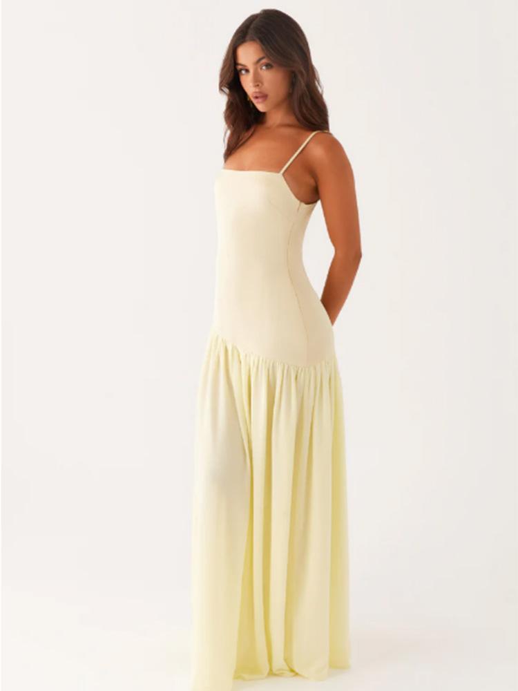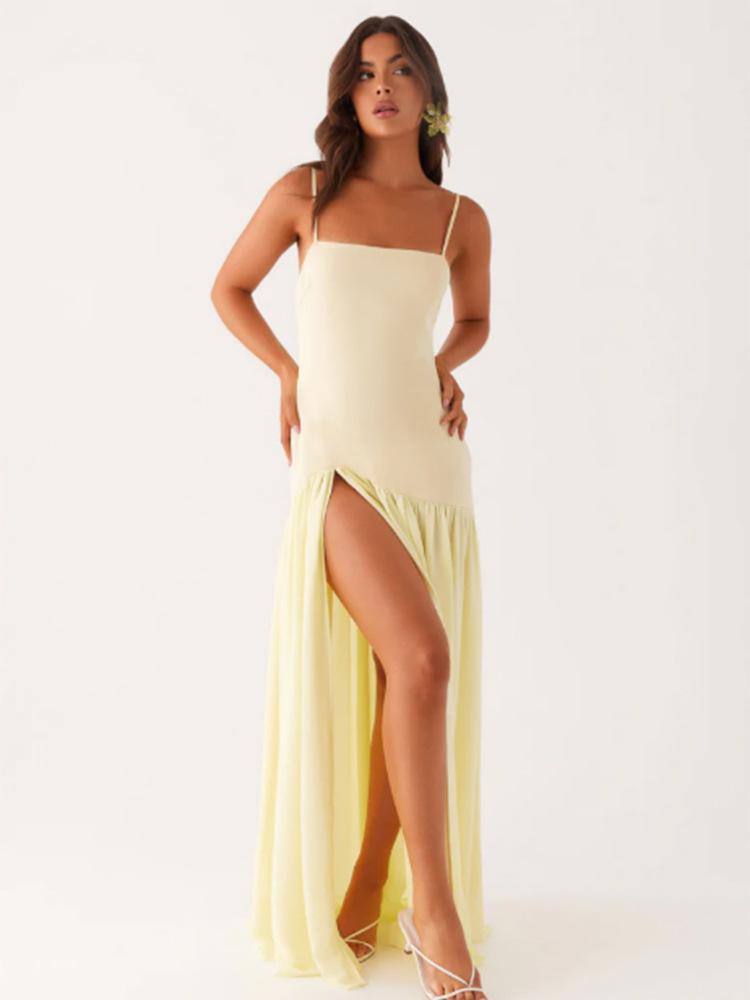 Vestido Europeo y Americano de Color Puro sin Mangas con Empalme de Tirantes para Mujer 2025 Verano Nuevo Diseño Abertura Cintura Falda Larga