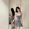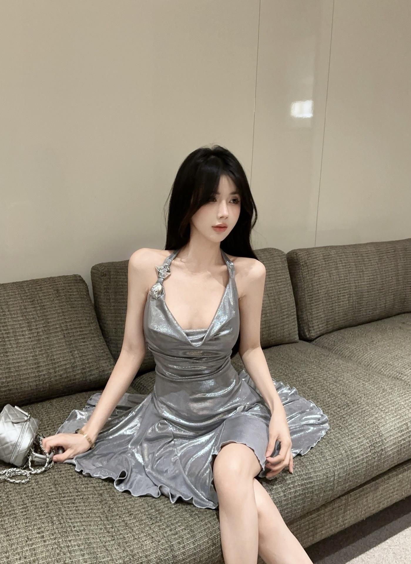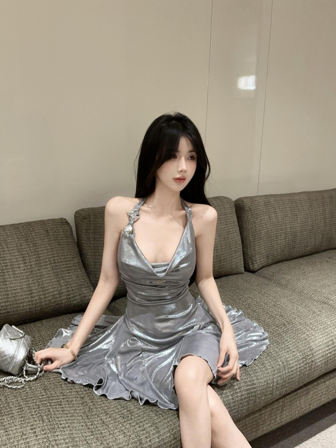 Deseo Puro Chica Caliente Cuello Halter Cintura Baja Adelgazante Falda Corta Plateada Diseño sin Espalda Moda Escénica Vestido Sexy