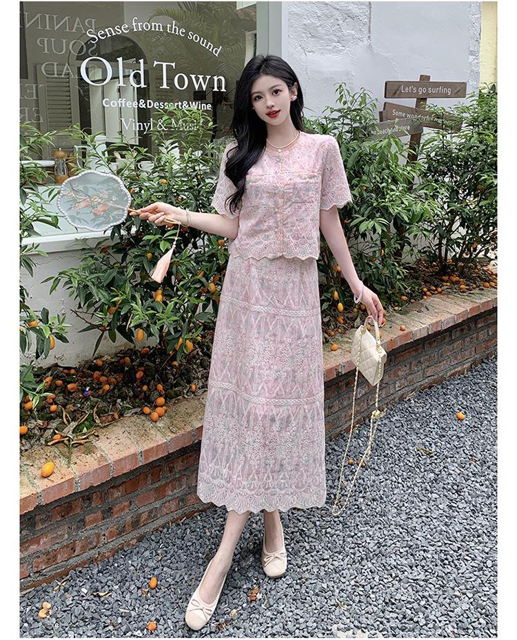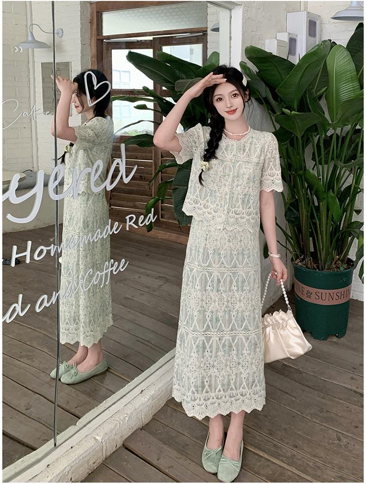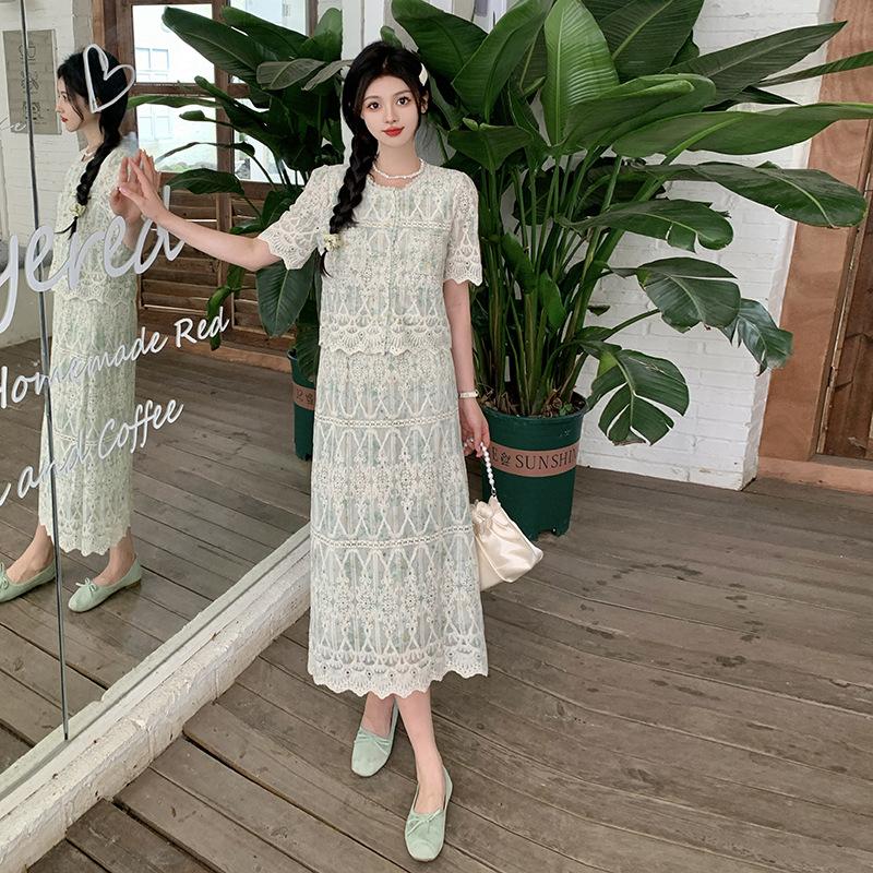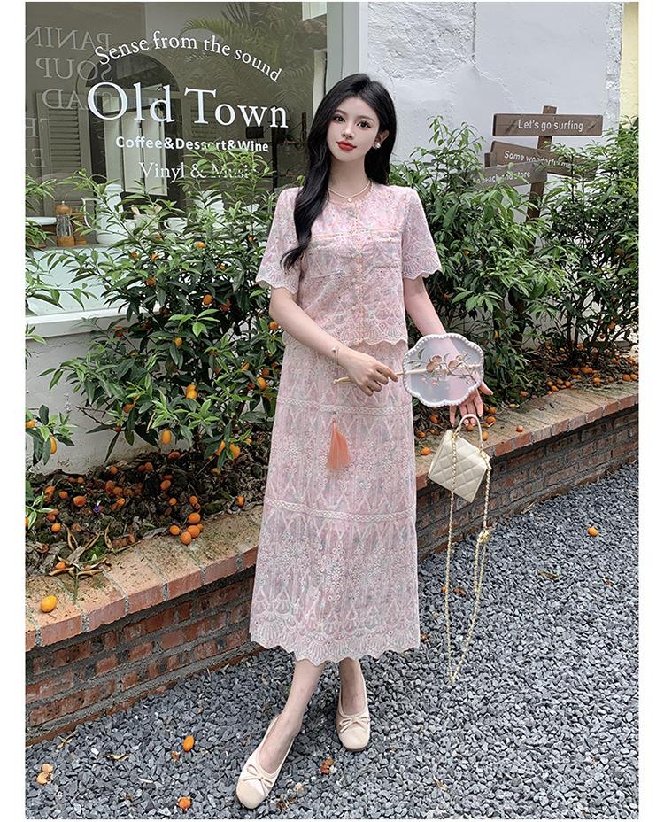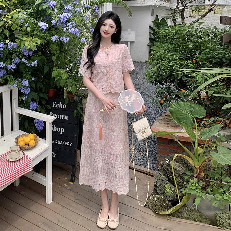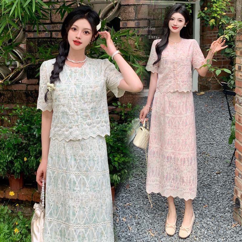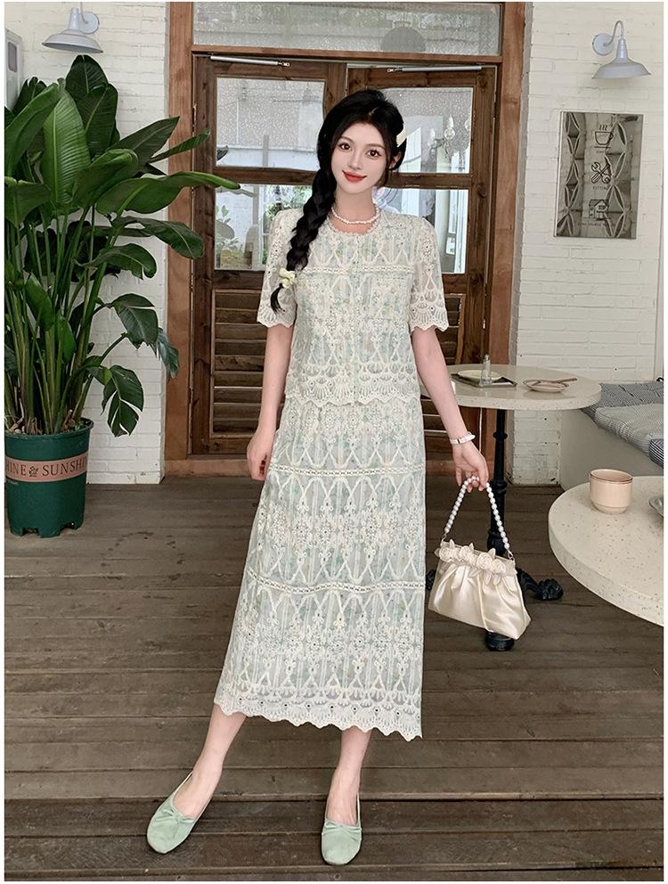Talla grande para mujer Verano Francés Bordado Manga corta Top Falda de encaje Adelgazante Elegante Moda Vestido de dos piezas