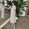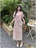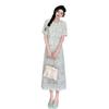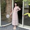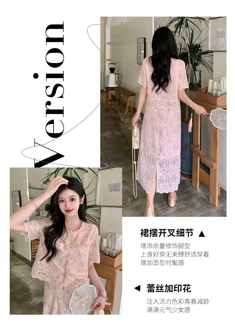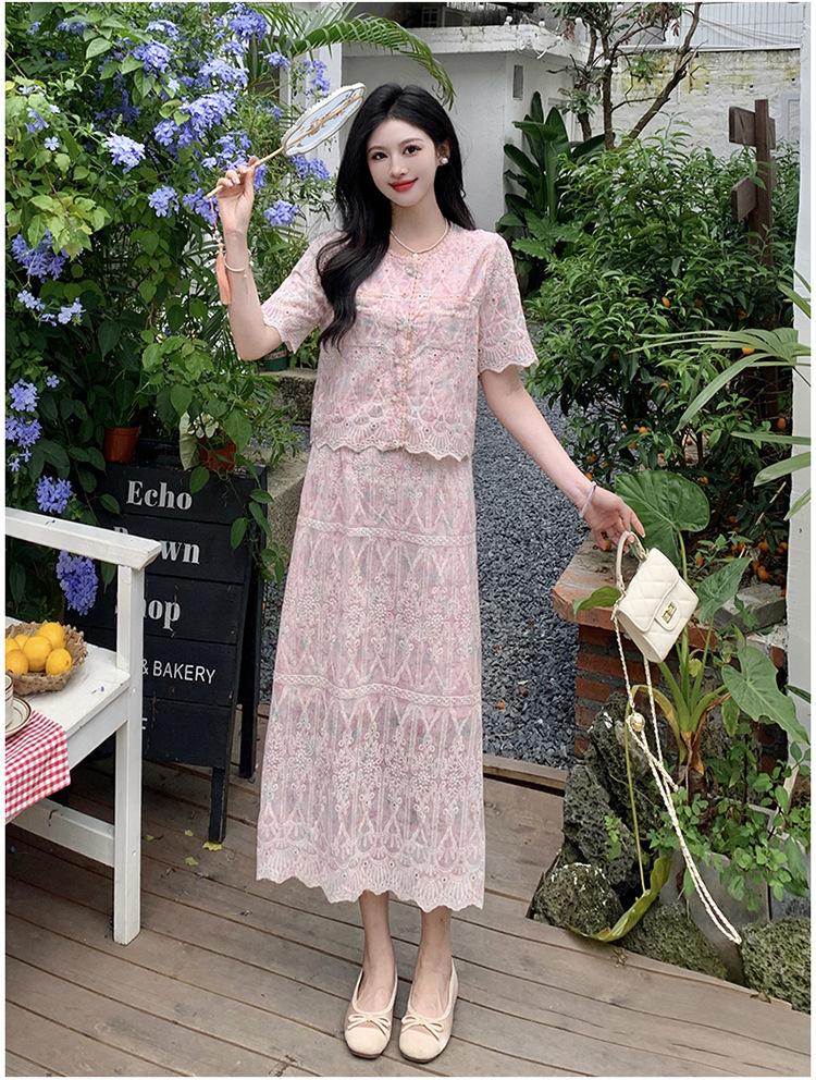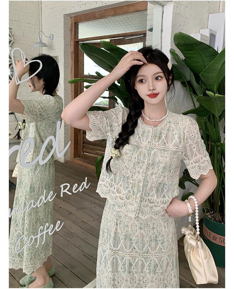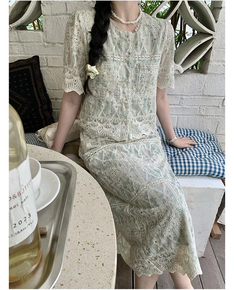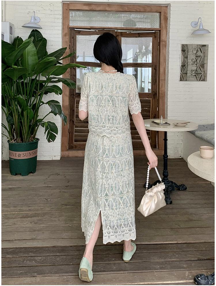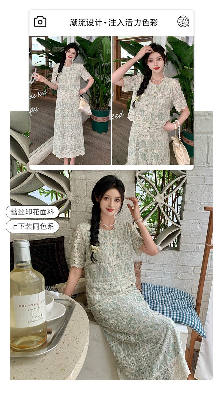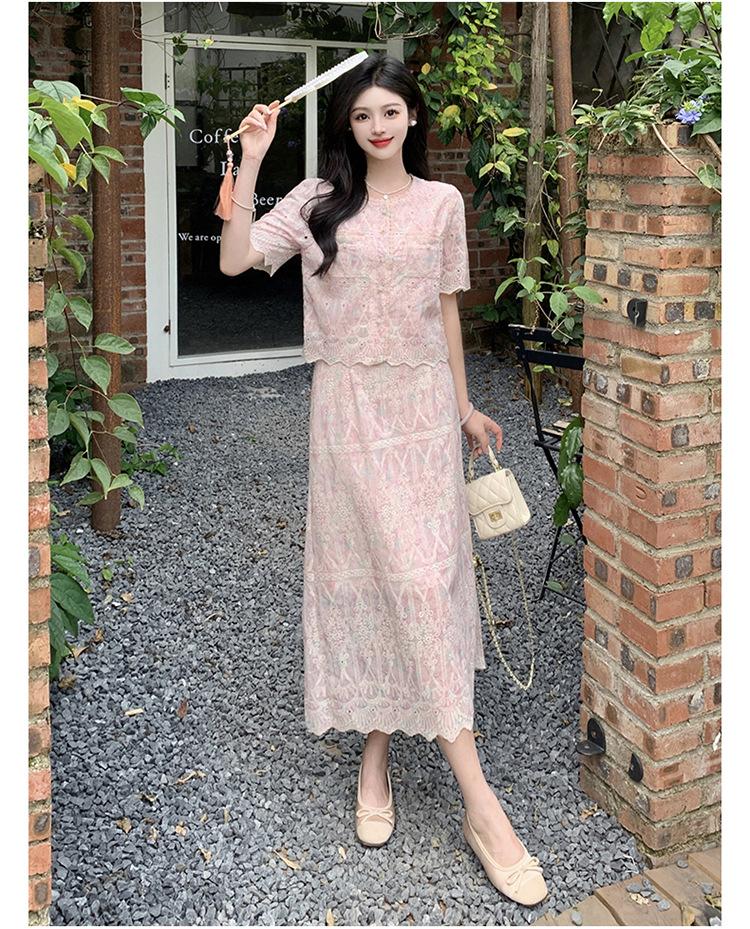 Talla grande para mujer Verano Francés Bordado Manga corta Top Falda de encaje Adelgazante Elegante Moda Vestido de dos piezas