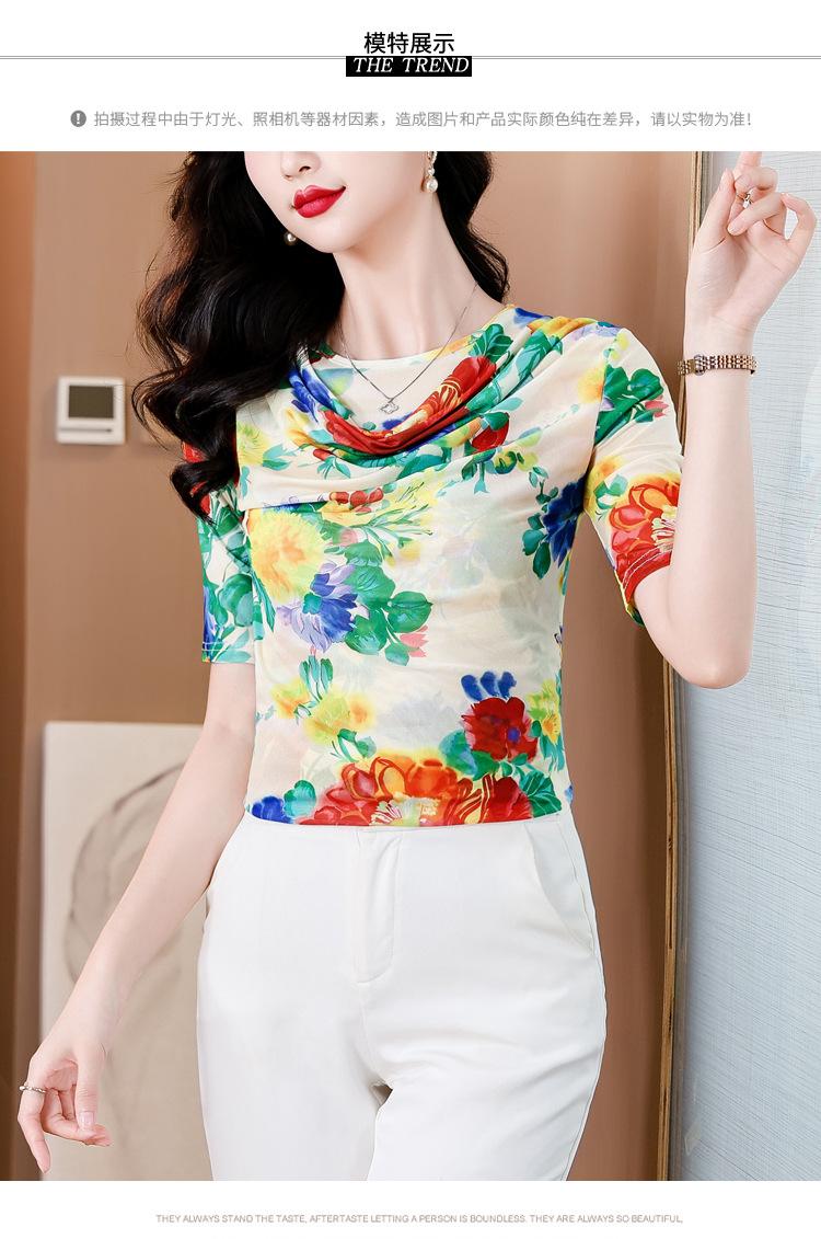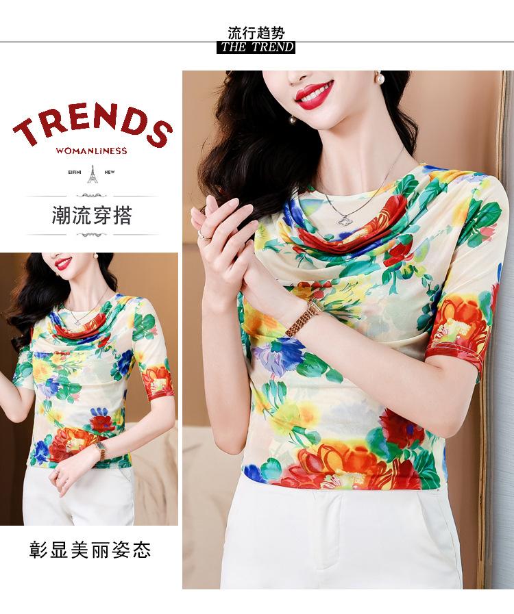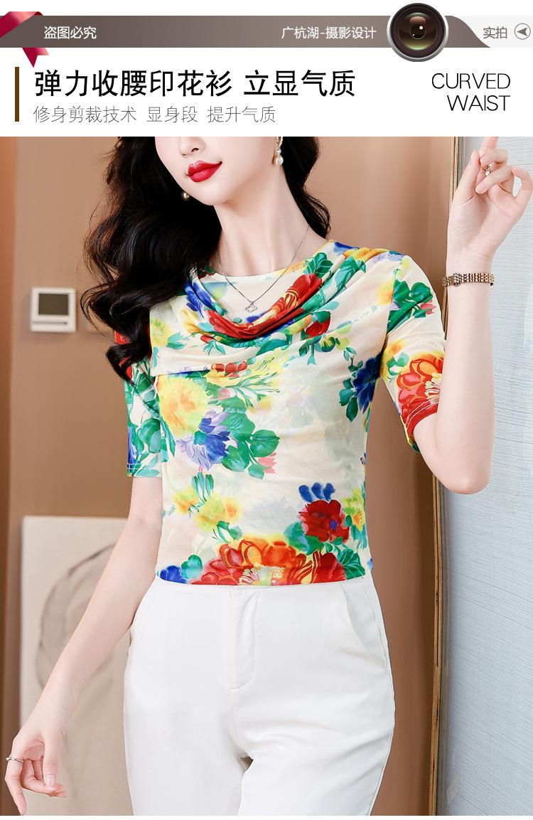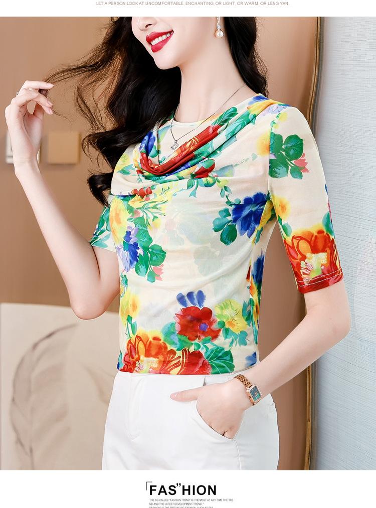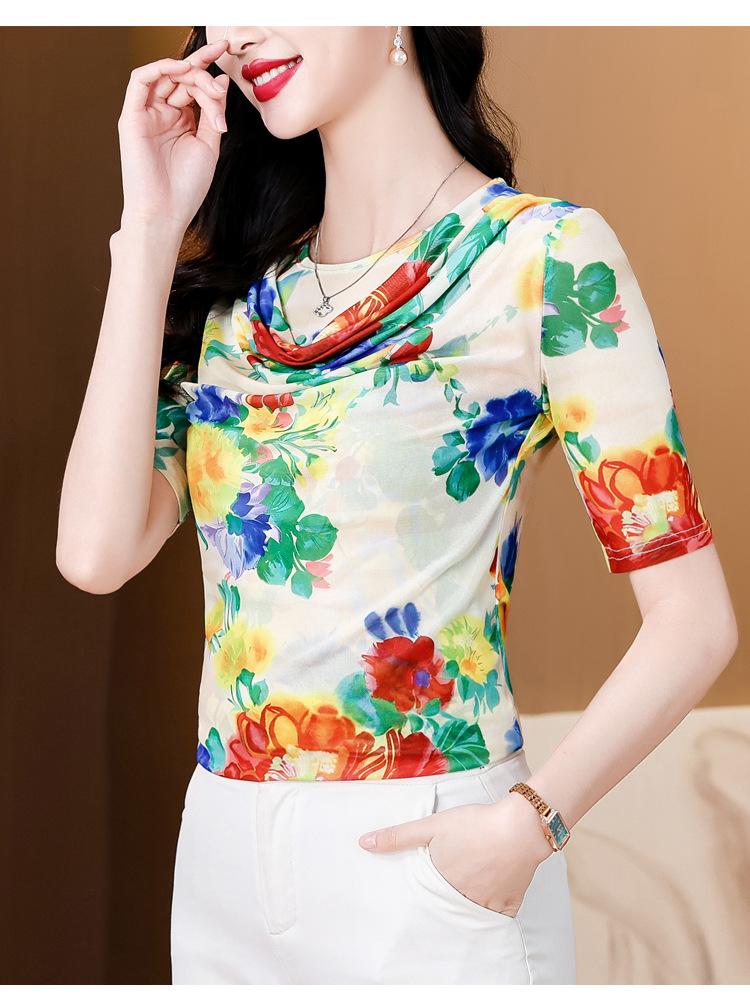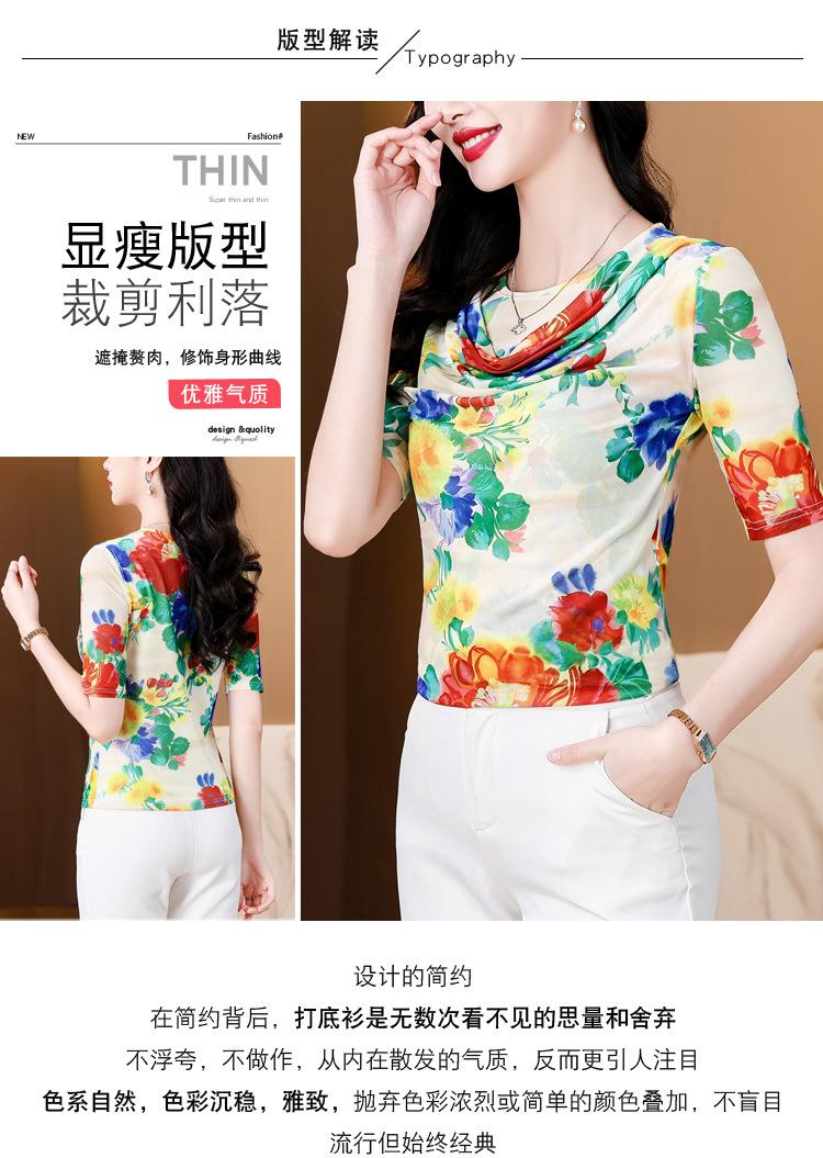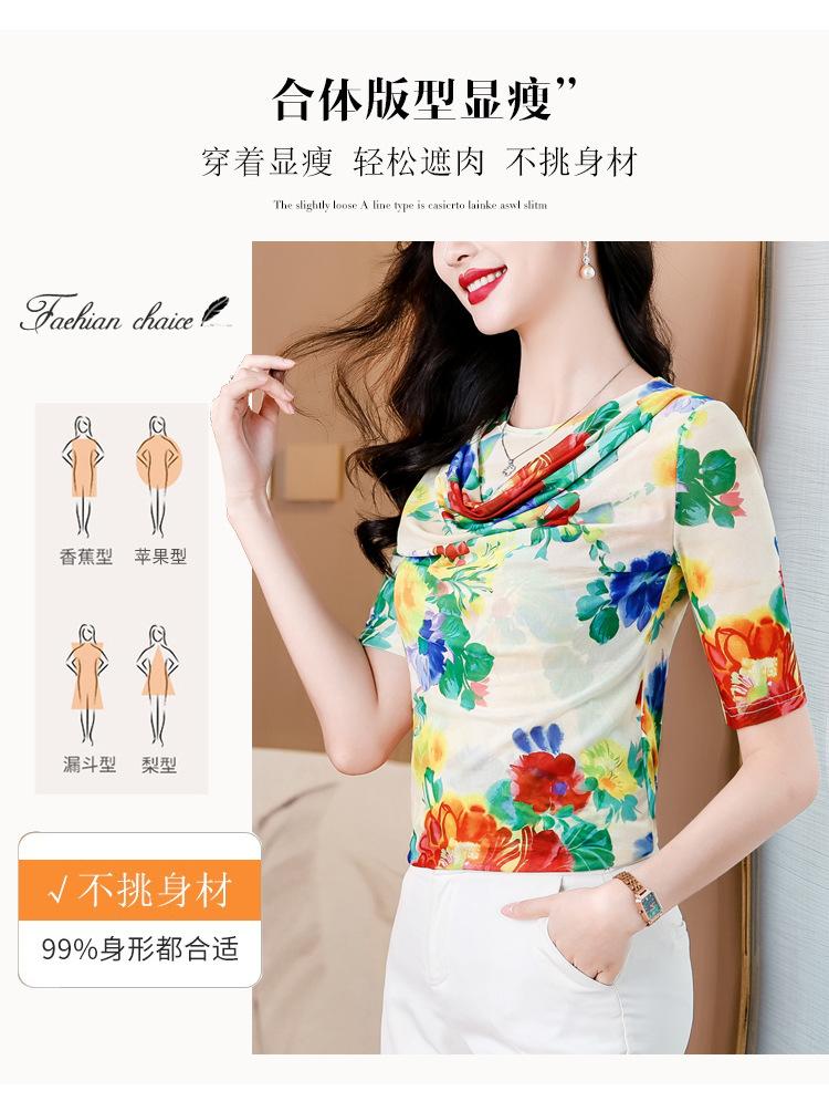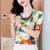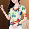 Camiseta estampada de manga corta con cuello alto para mujer Verano 2025 Nueva Slim-fit Adelgazante Combinable Camisa de media manga Top de malla