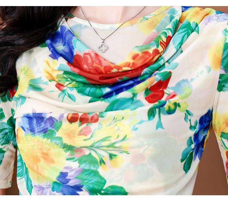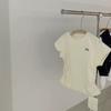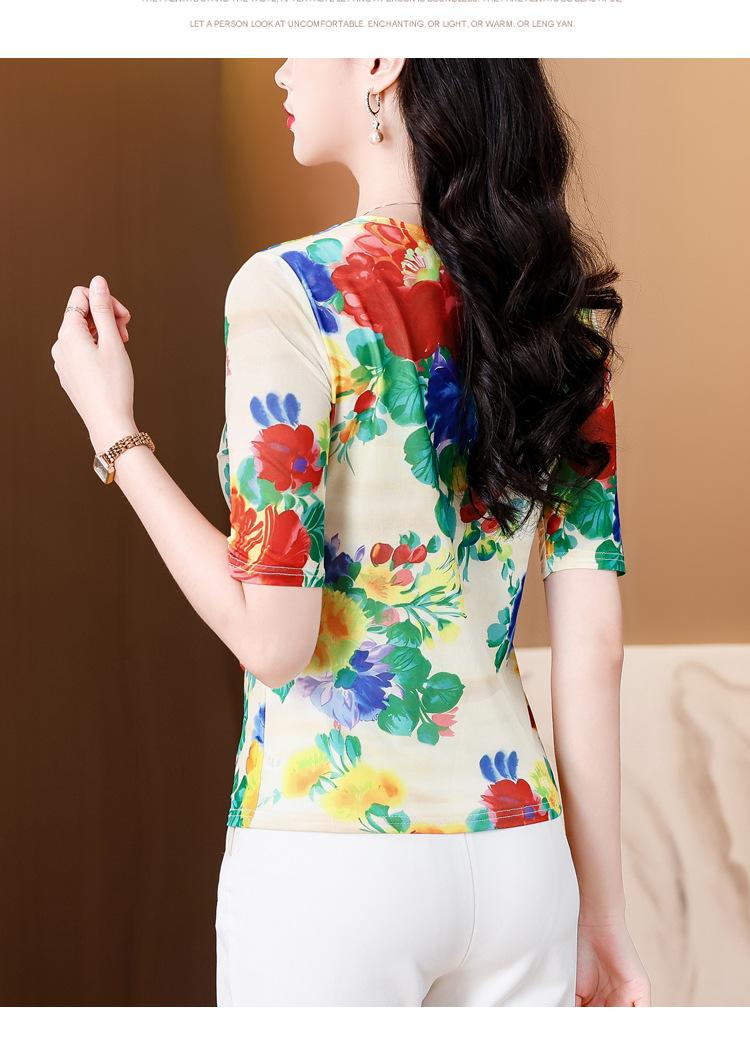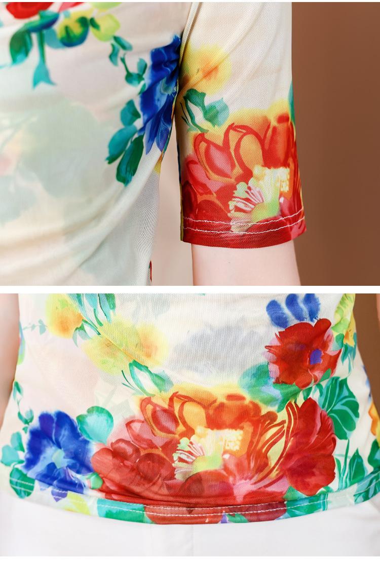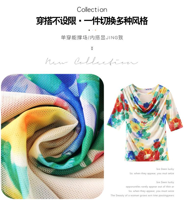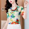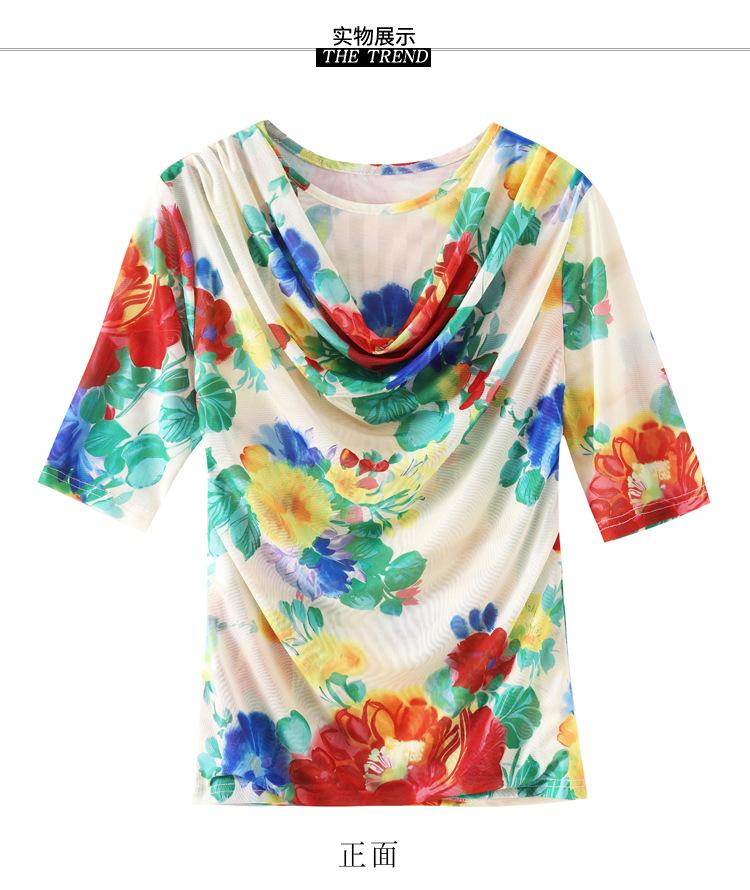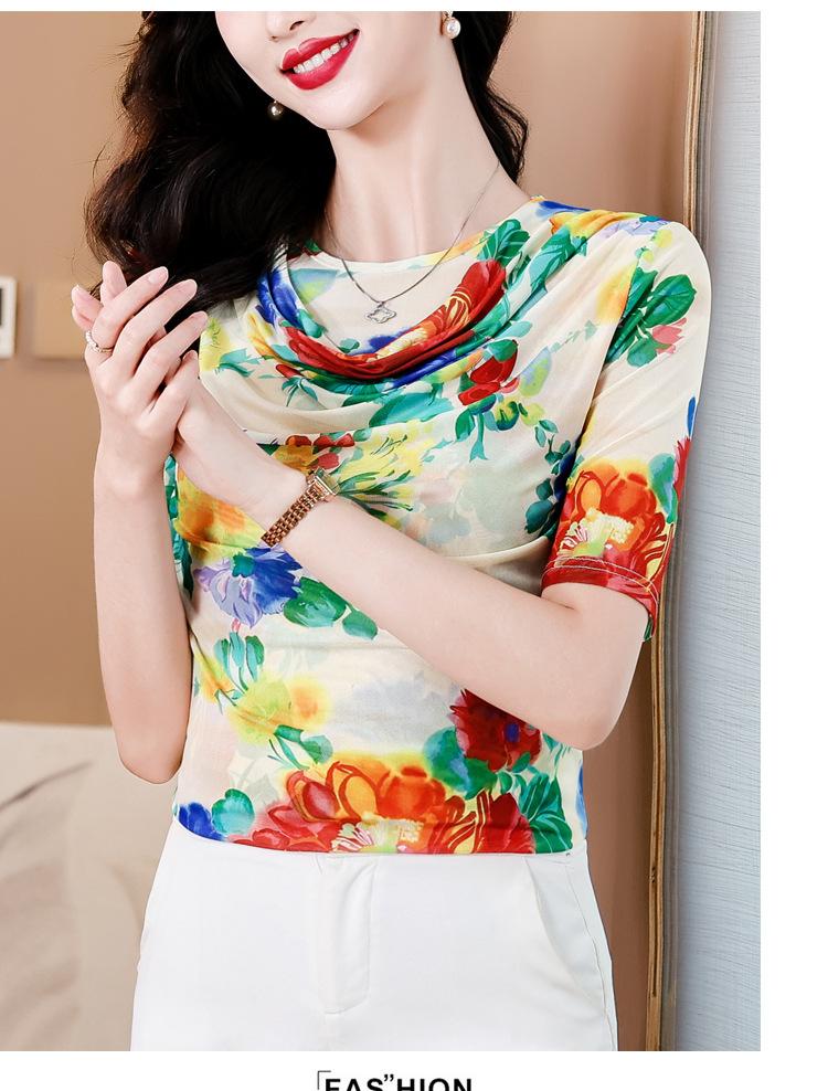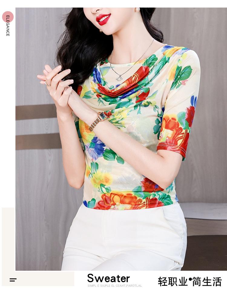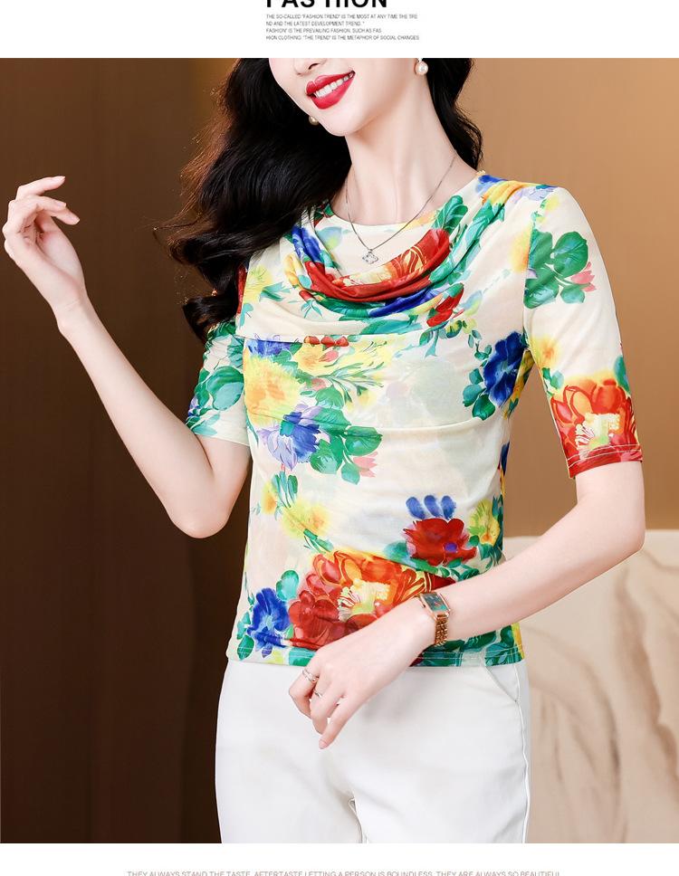Camiseta estampada de manga corta con cuello alto para mujer Verano 2025 Nueva Slim-fit Adelgazante Combinable Camisa de media manga Top de malla