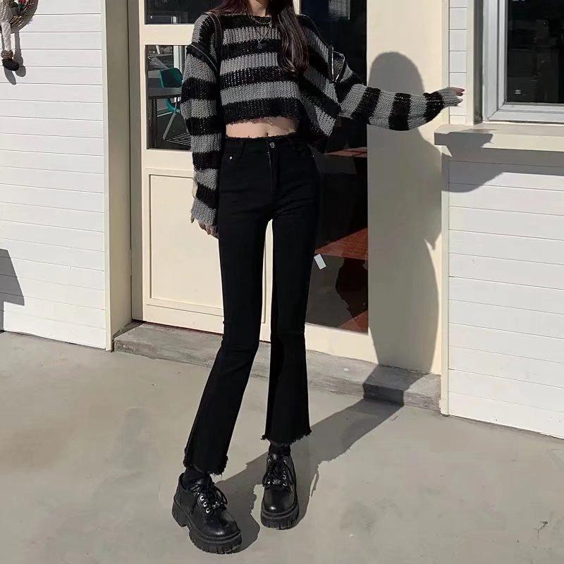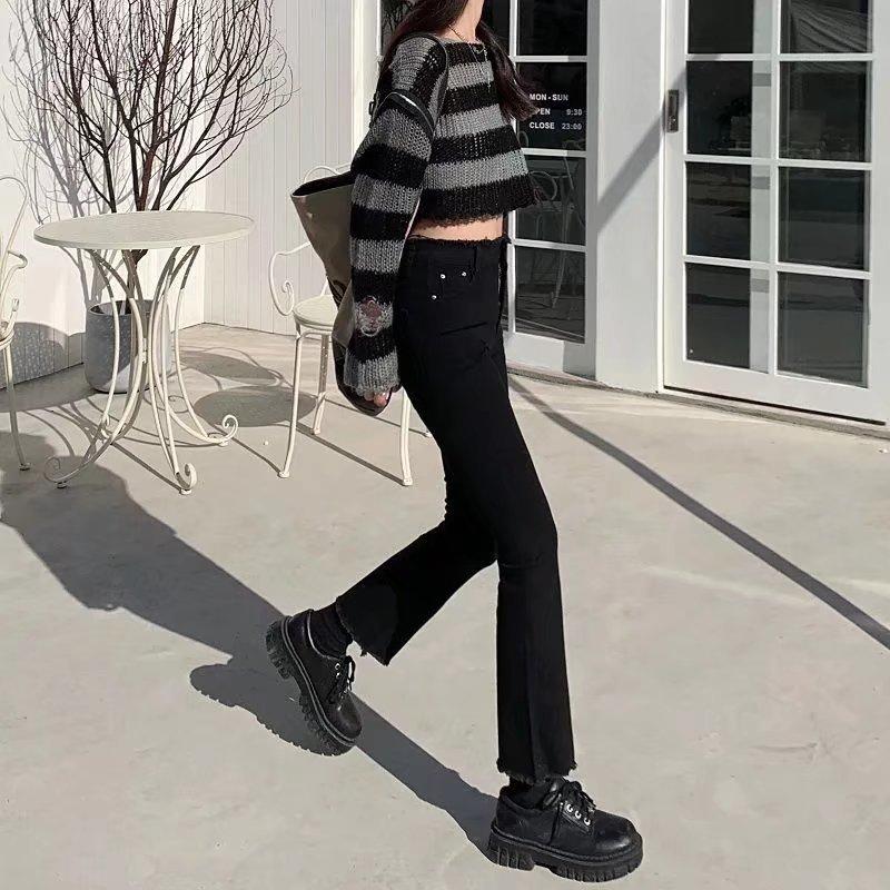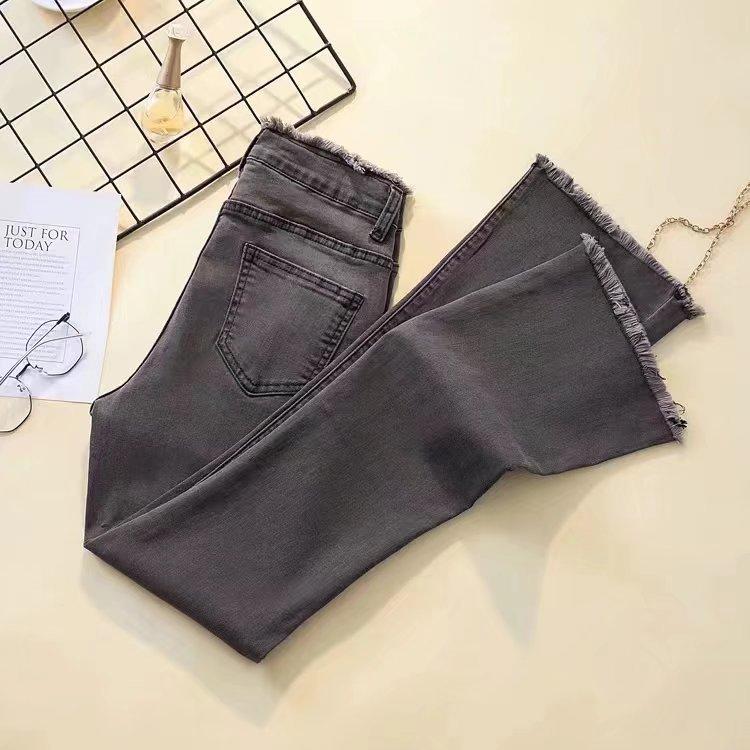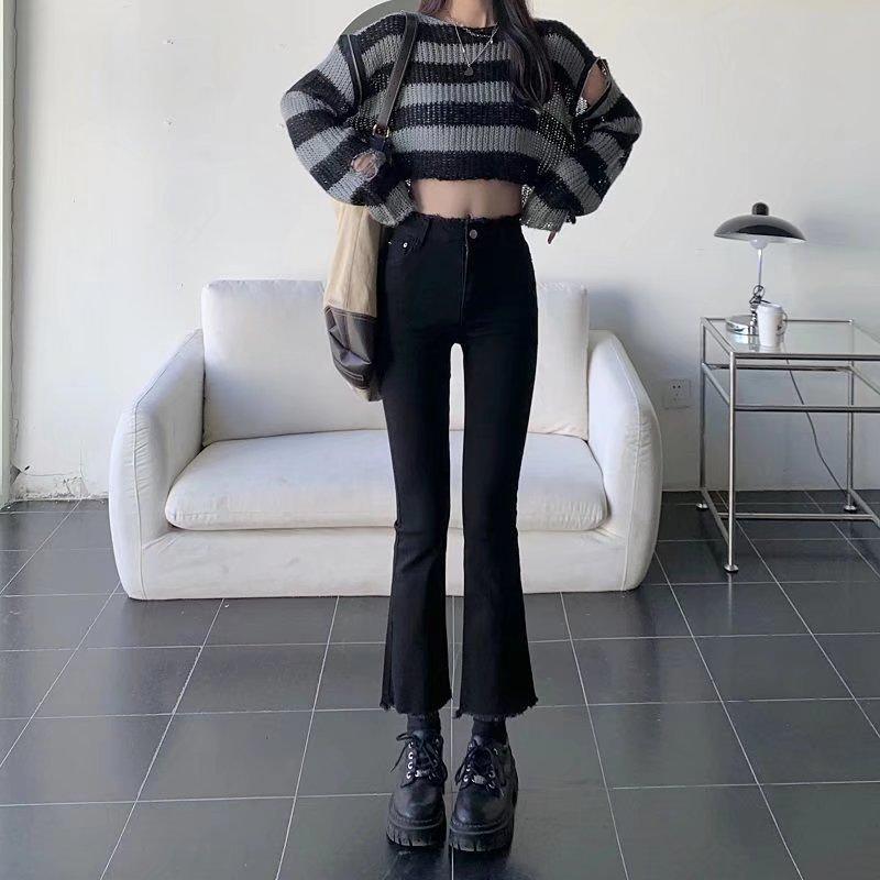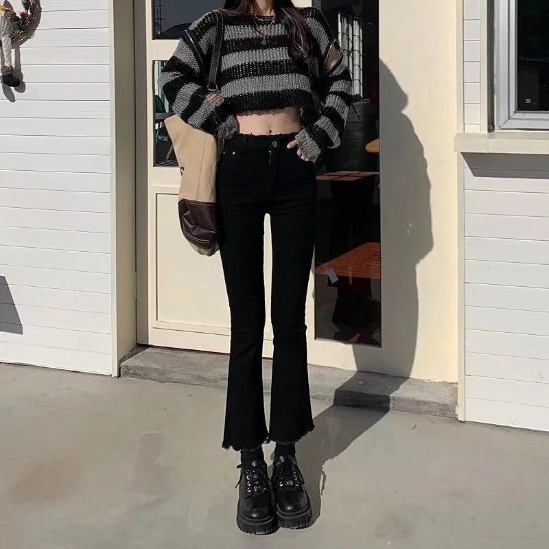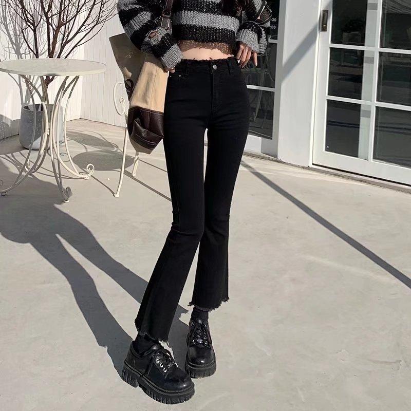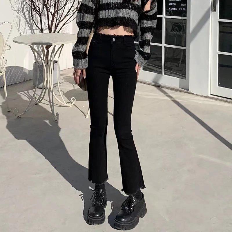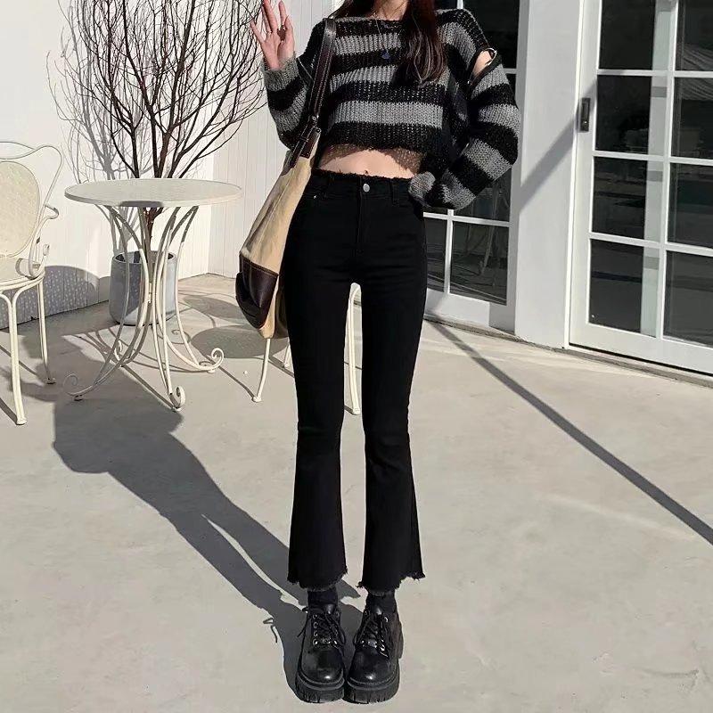 Micro-Lar Jeans Pantalones Cortos de Primavera para Mujer Elásticos Estudiante Cintura Alta Talla Pequeña Adelgazantes Negros Acampanados