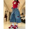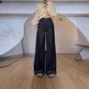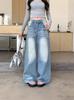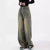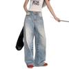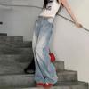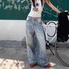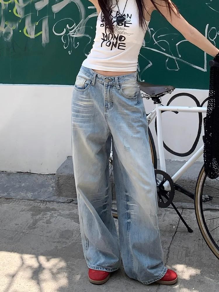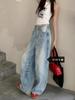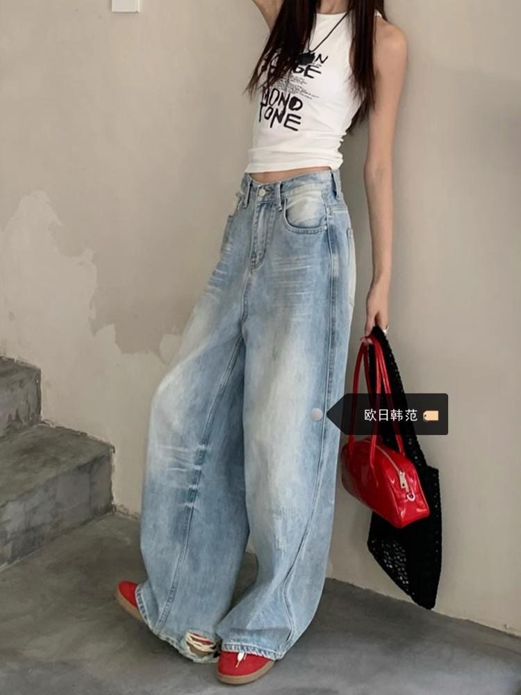 Pantalones Rectos de Mezclilla Americana Retro Desgastada y Agrietada de Talla Grande para Mujer Verano Cintura Alta Sueltos Adelgazantes Hasta el Piso de Pierna Ancha