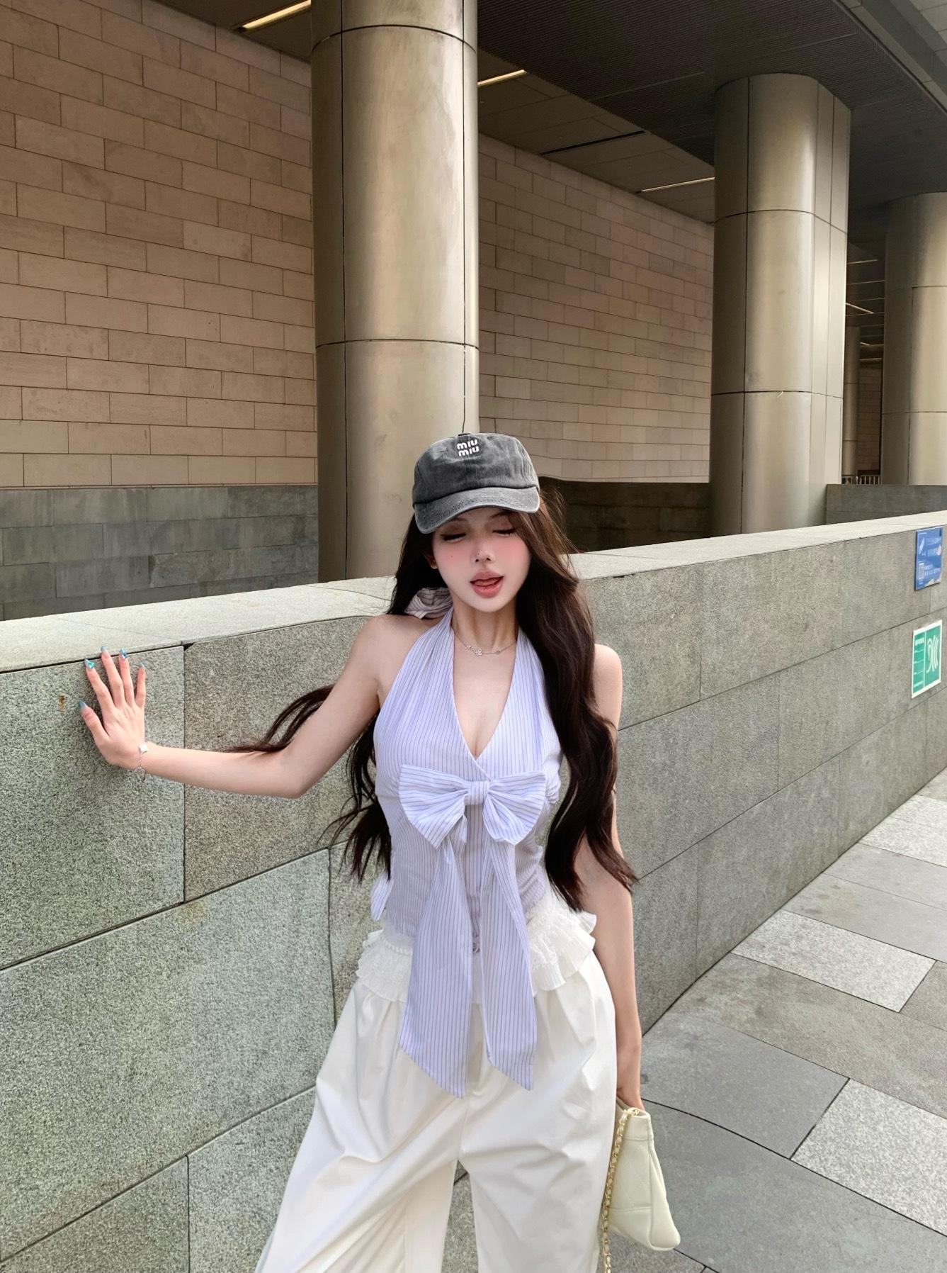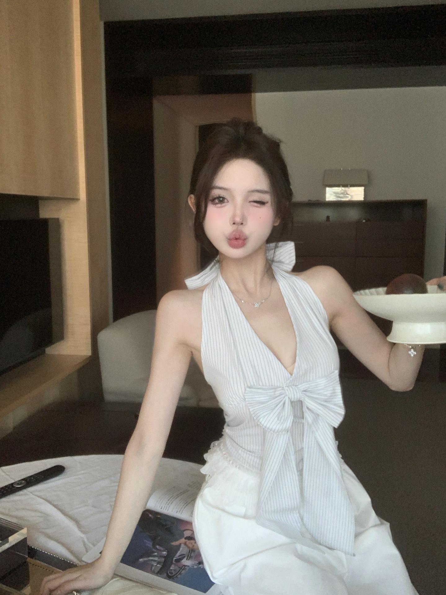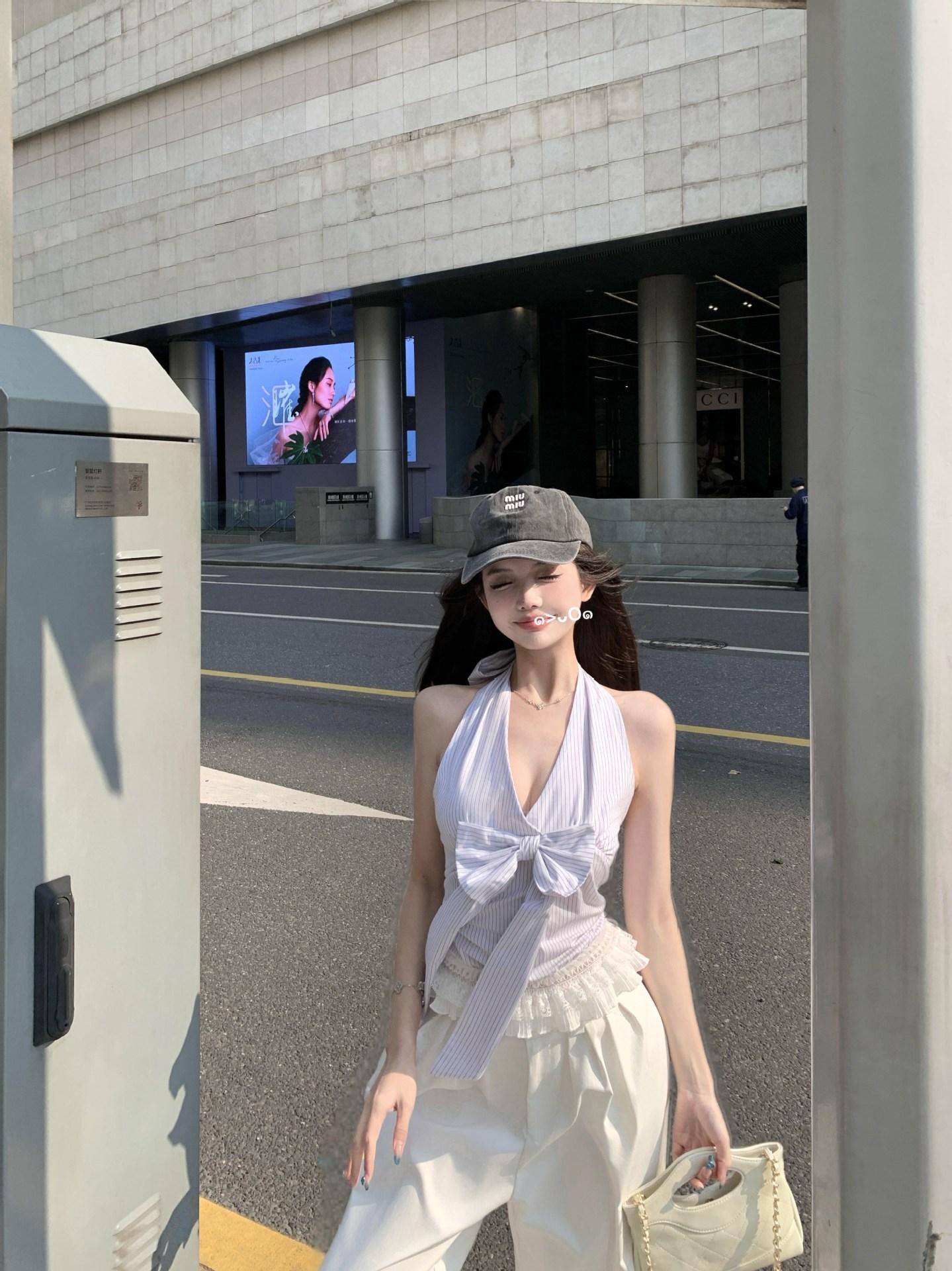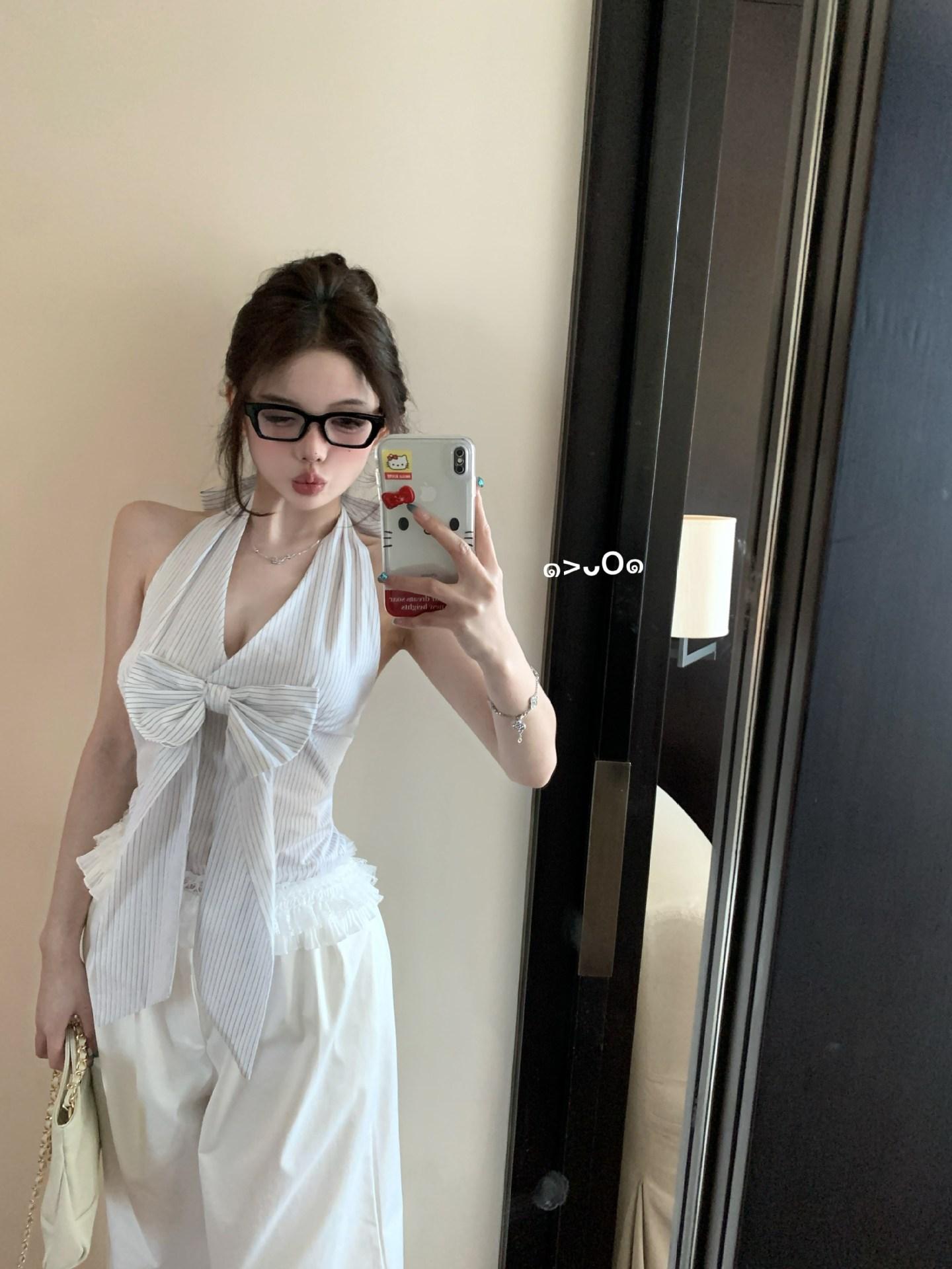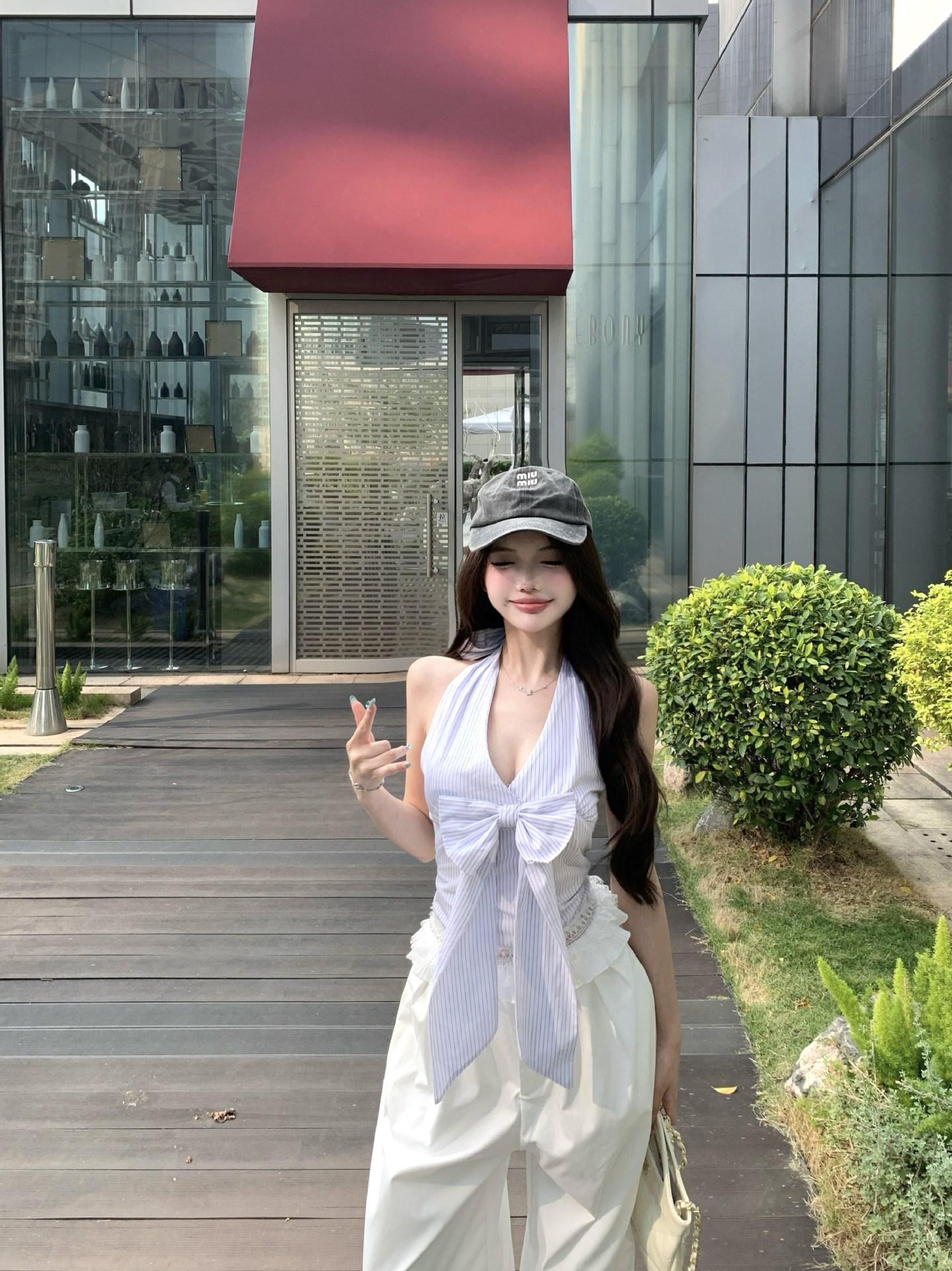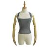 Moda Chaleco con Diseño de Lazo y Rayas de Cuello en V Profundo Verano Estilo Chica Dulce y Picante Top Corto Ajustado sin Mangas