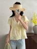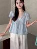 Camisa de Encaje de Estilo Dulce y Delicado con Cordones Falso de Dos Piezas de Manga Corta para Mujer 2025 Verano Nuevo Diseño Nicho Top Reductor de Edad
