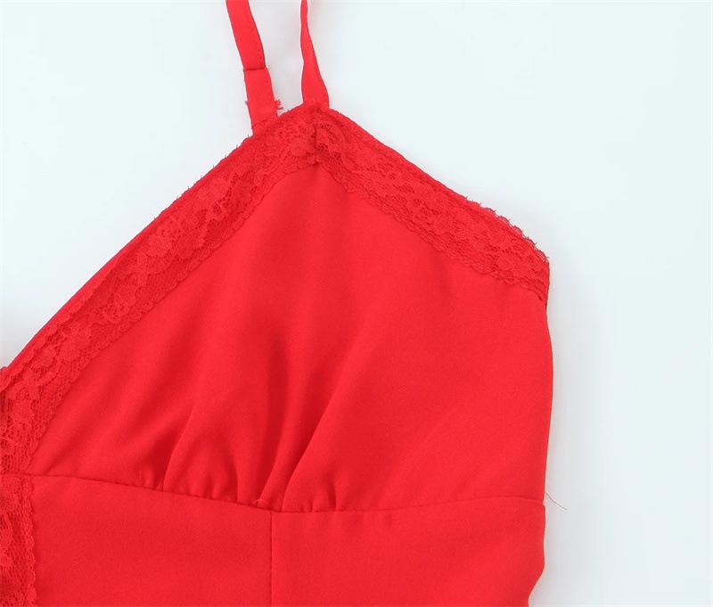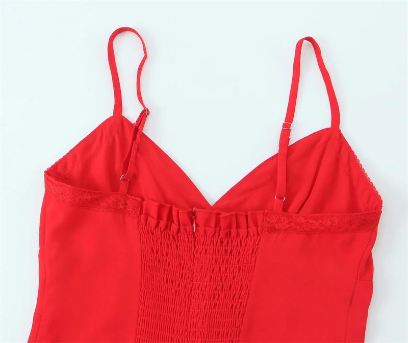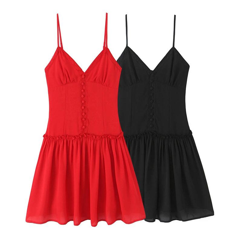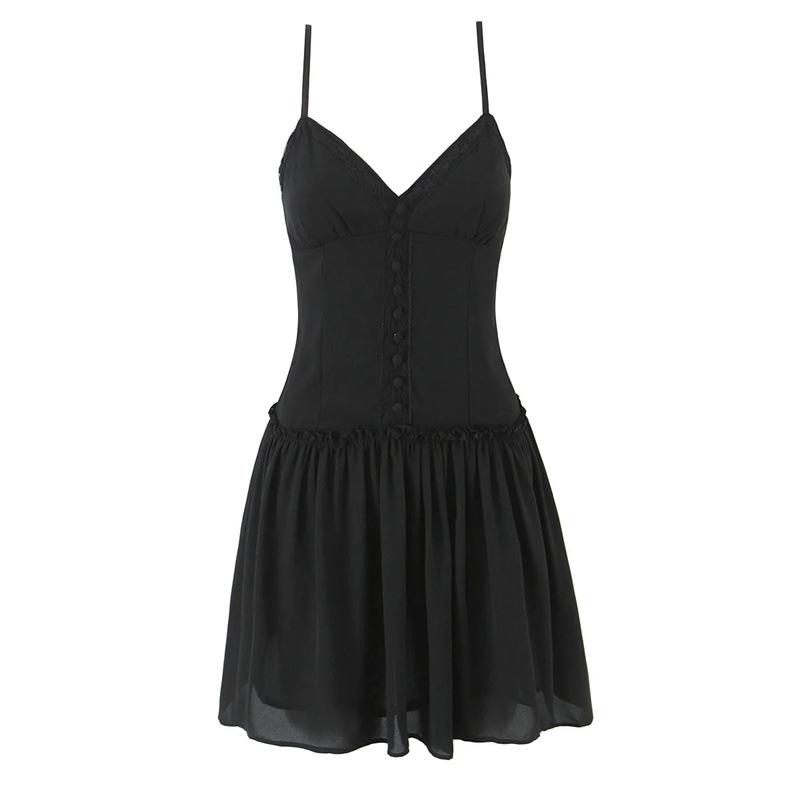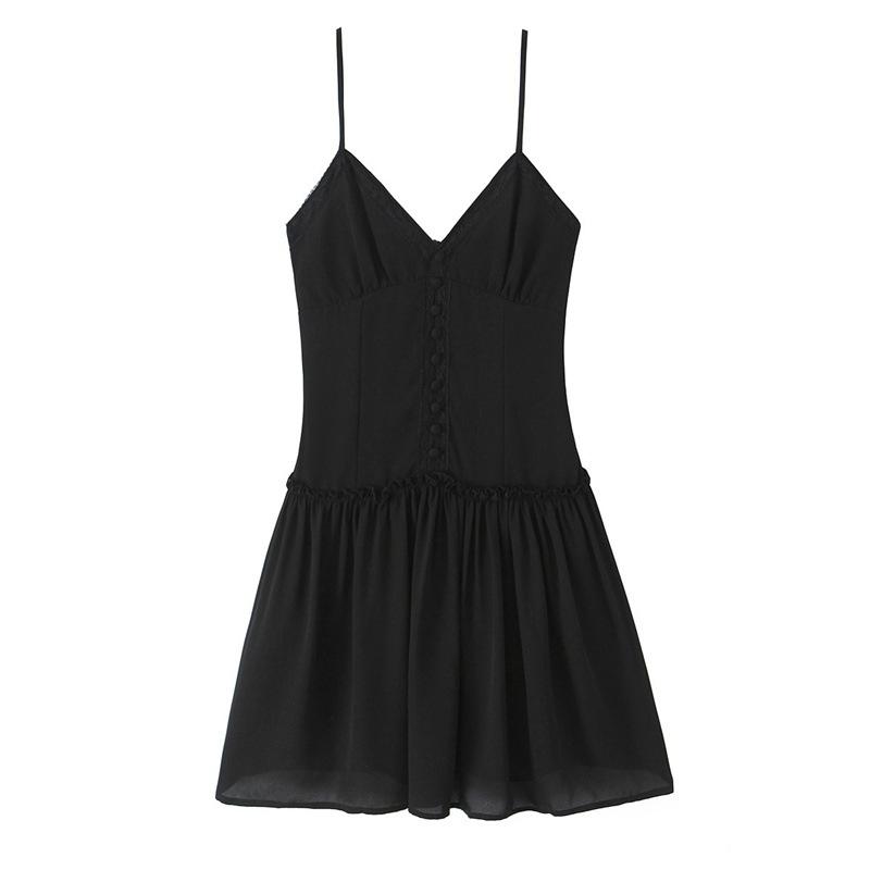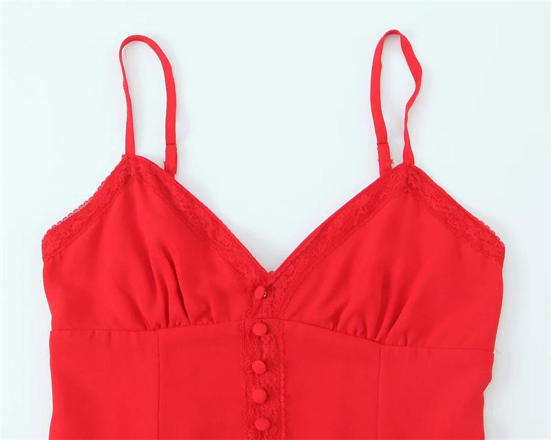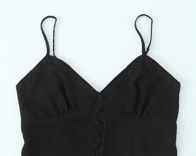 Vestido de fiesta sexy francés con escote en V y botones decorativos en la cintura con tirantes y encaje