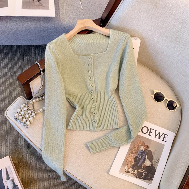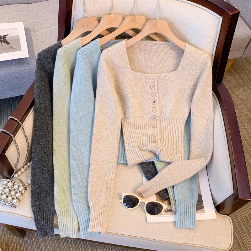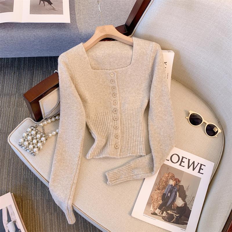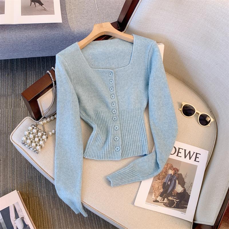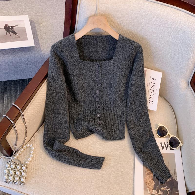 Suéter Corto de Manga Larga Ajustado con Cuello Cuadrado para Mujer Otoño e Invierno 2025 Nuevo Versátil Ajustado Cárdigan Top