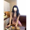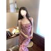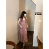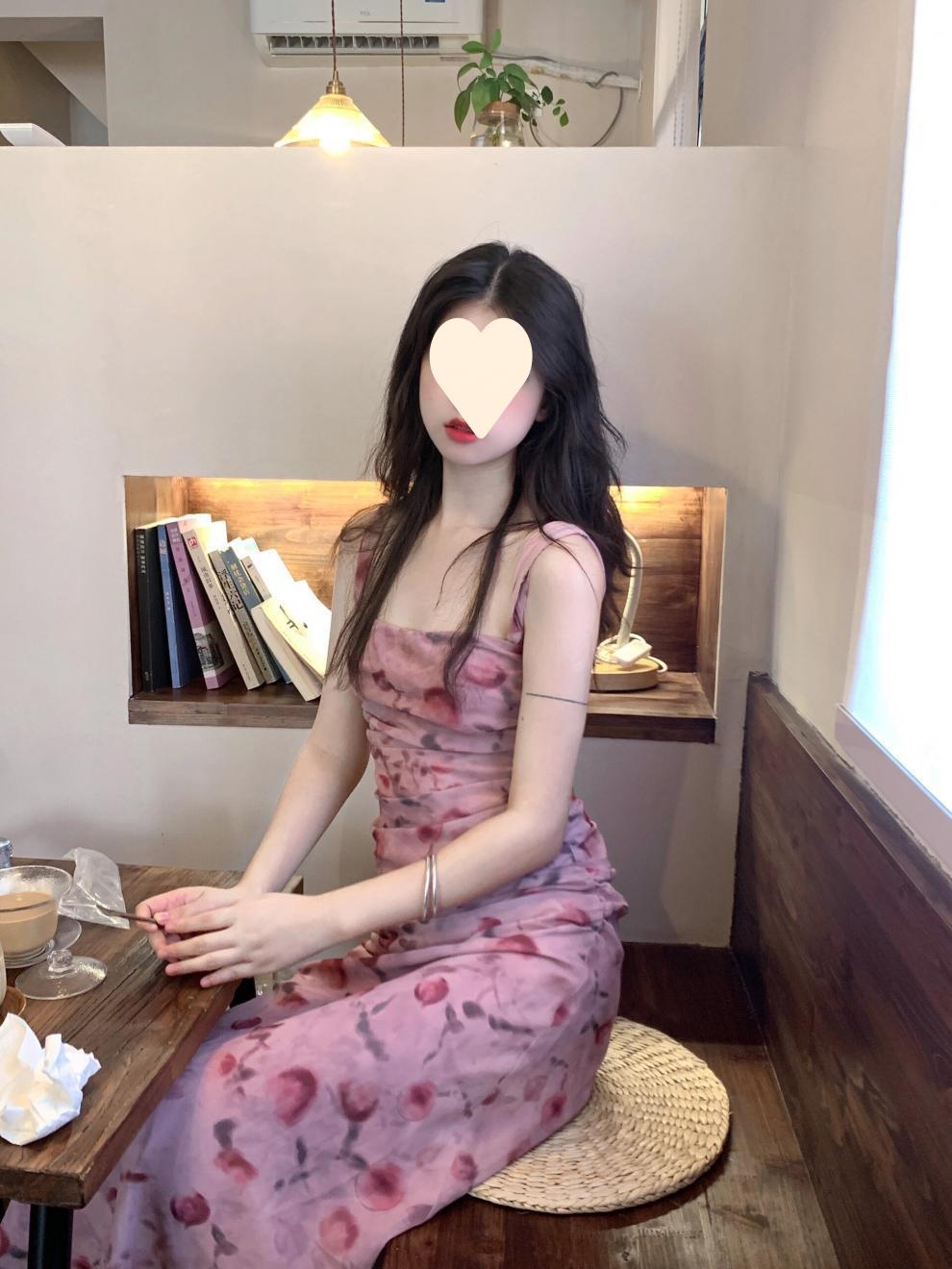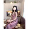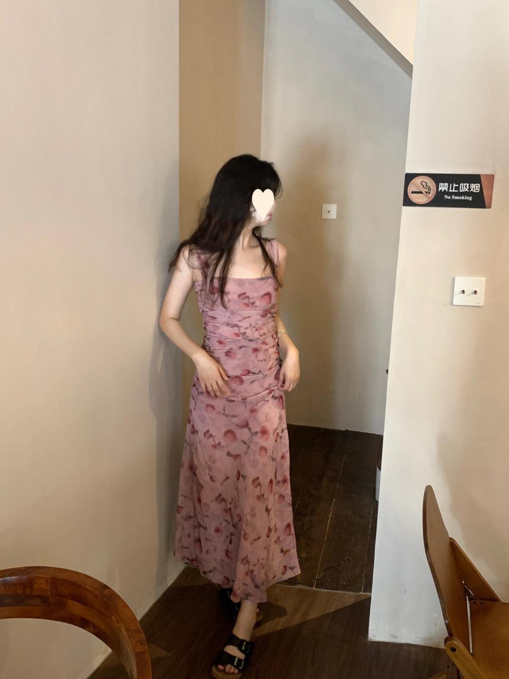 Dulce vestido rosa floral de malla con tirantes estilo francés para mujer, estilo romántico y suave, hermoso vestido largo para vacaciones junto al mar en verano
