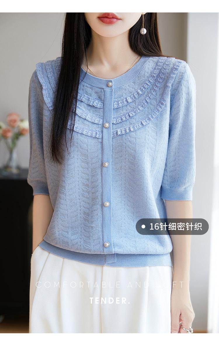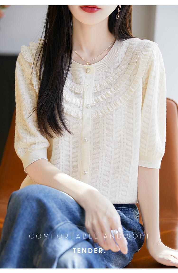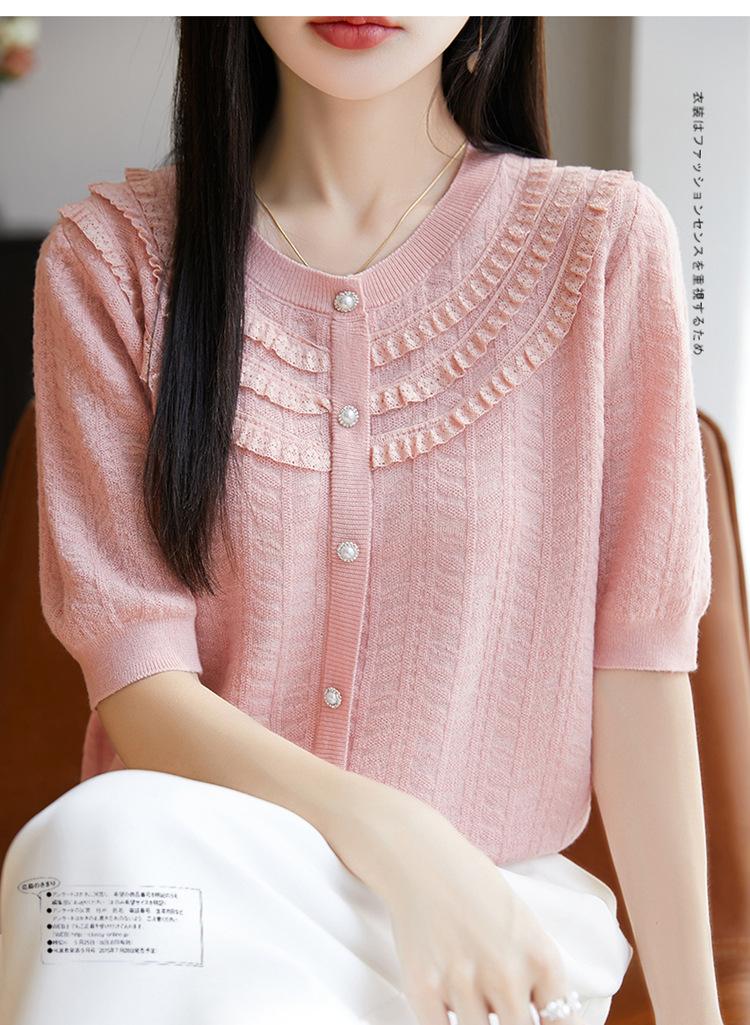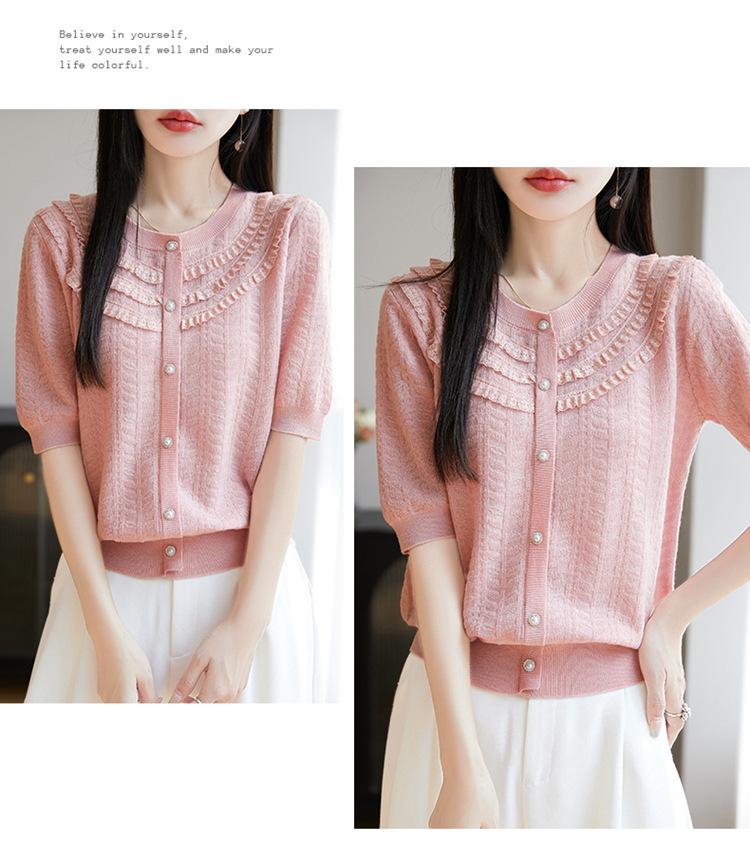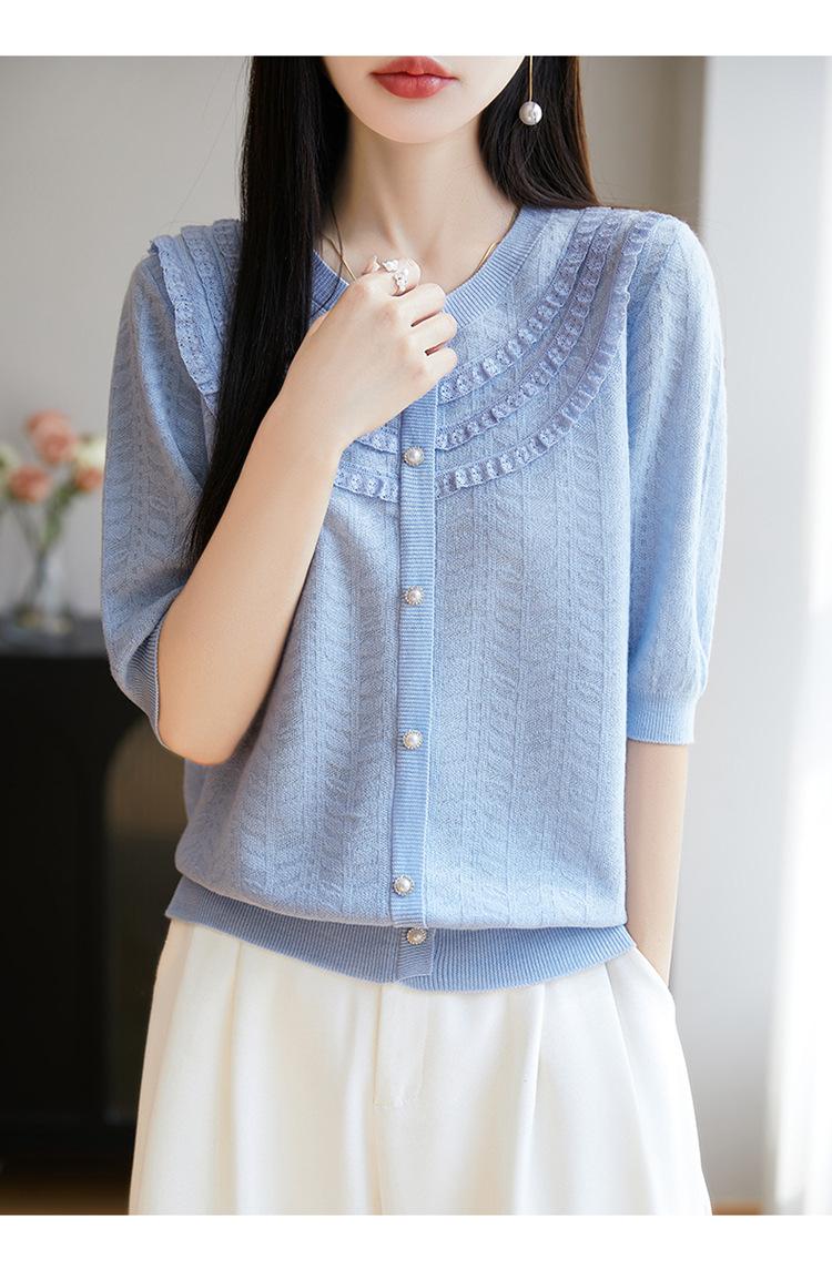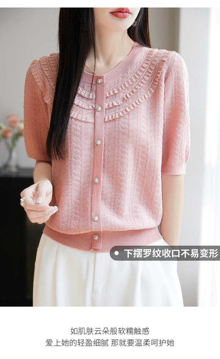 2025 Nueva Moda Camiseta de Manga Corta Holgada Casual Tejido de Lana Diseño de Verano Top con Borde de Hongo de Encaje