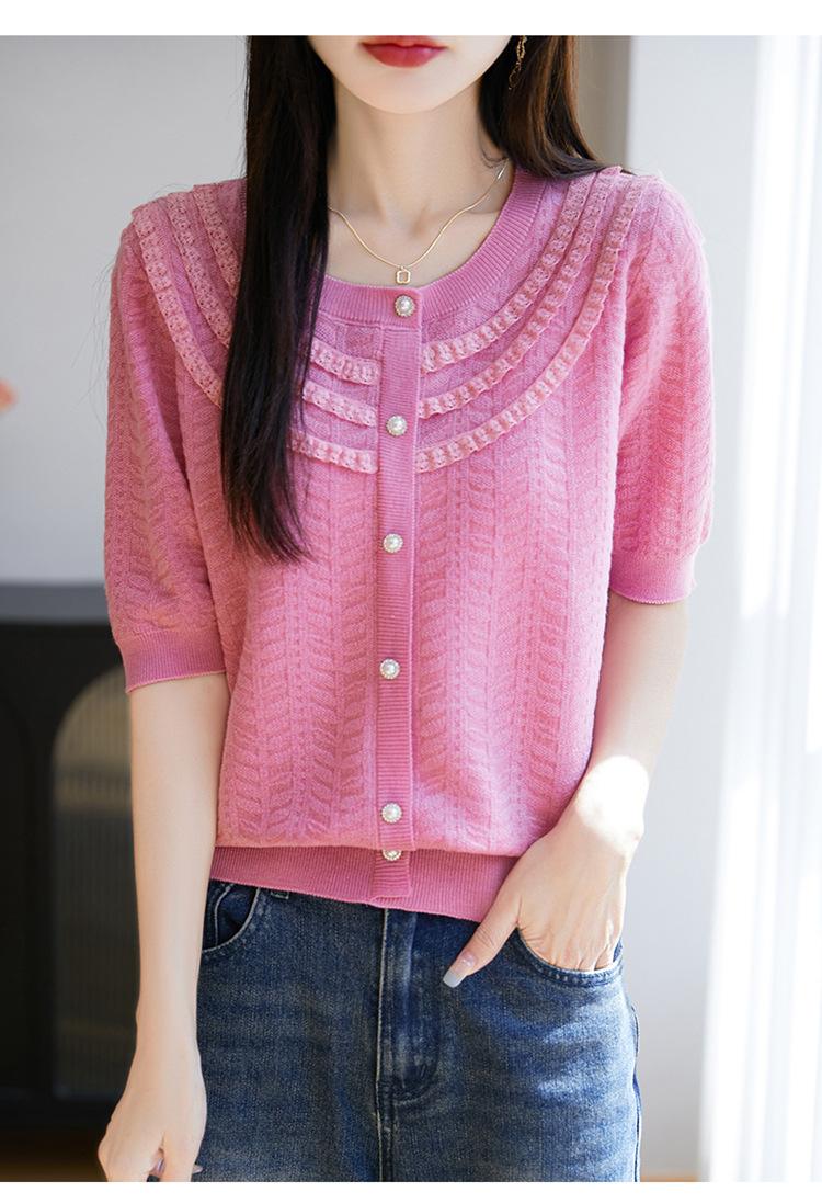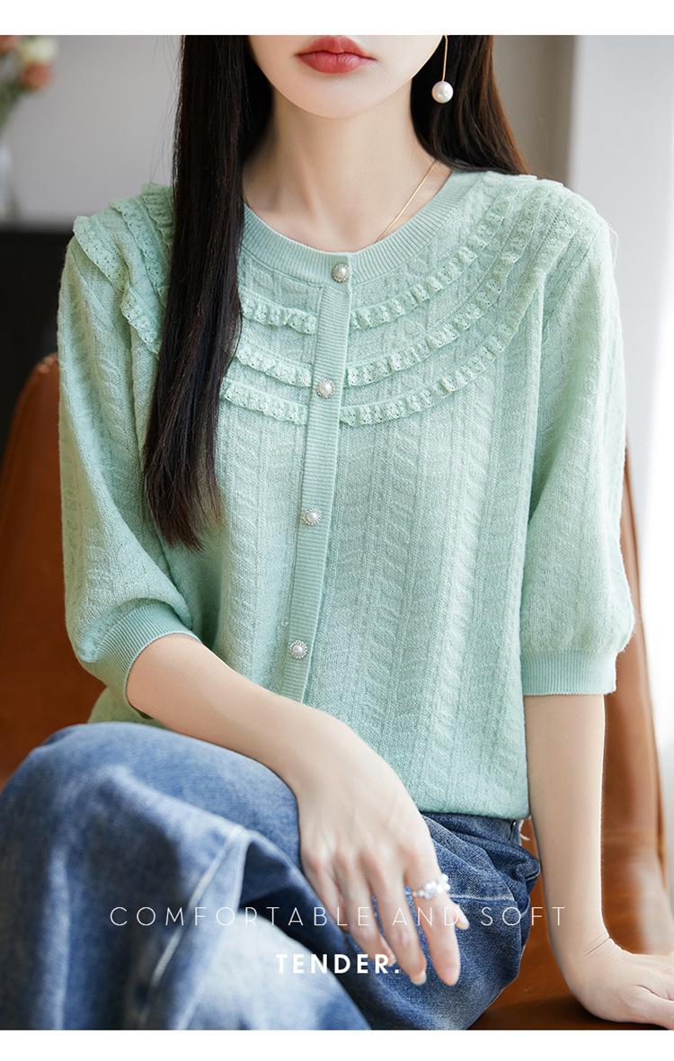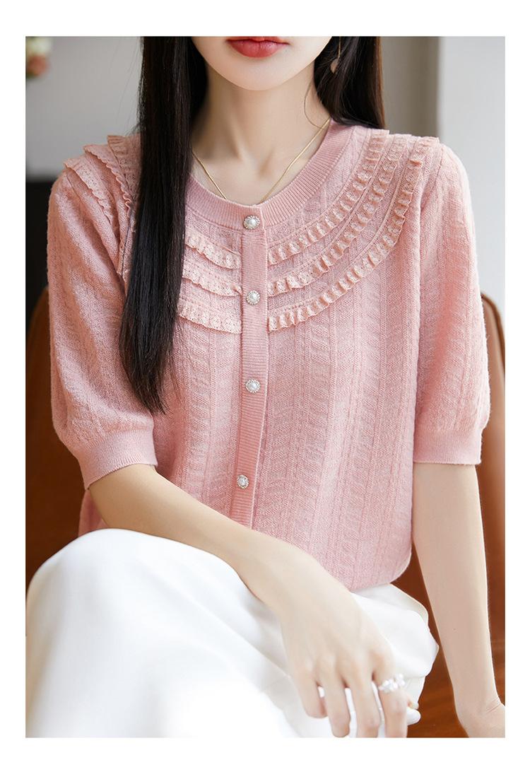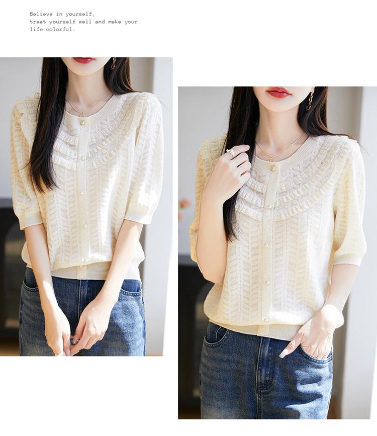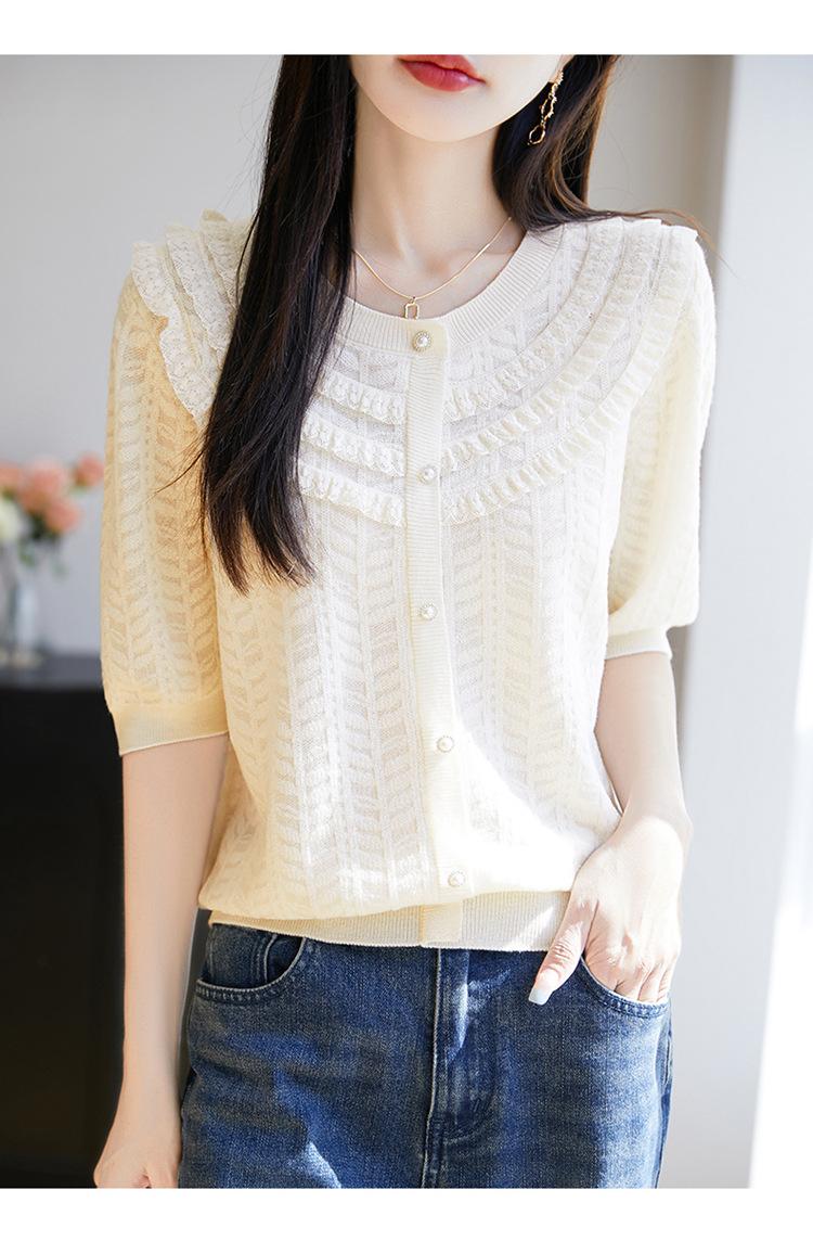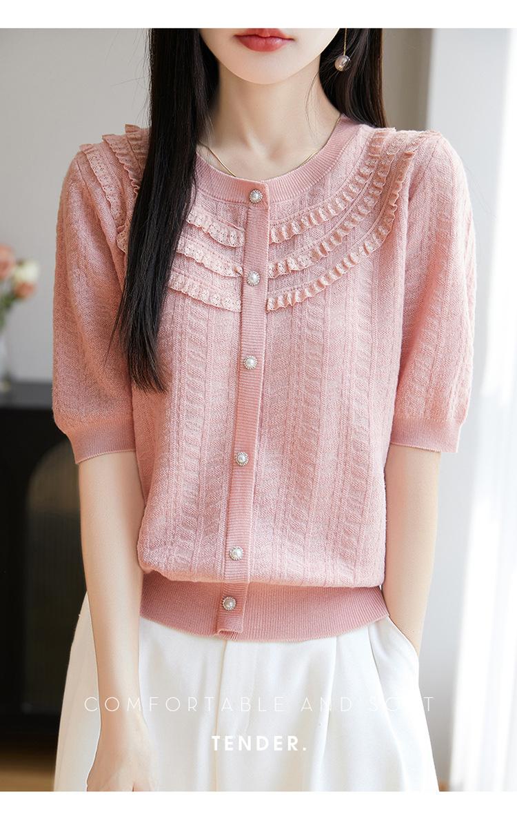 2025 Nueva Moda Camiseta de Manga Corta Holgada Casual Tejido de Lana Diseño de Verano Top con Borde de Hongo de Encaje