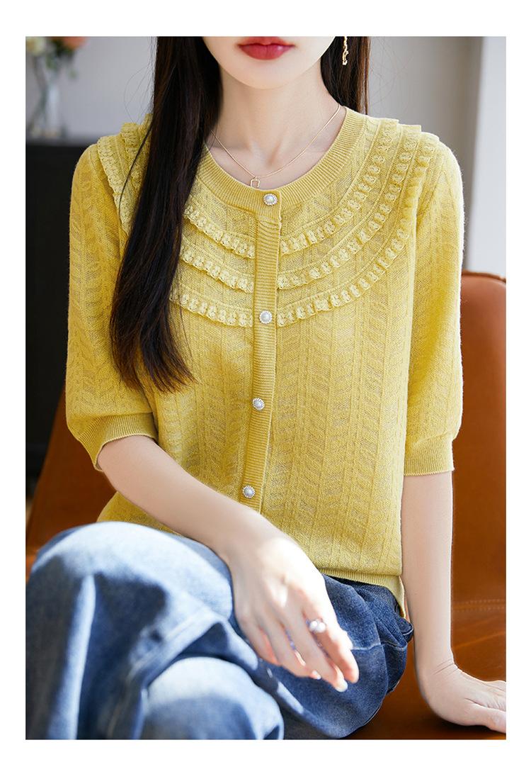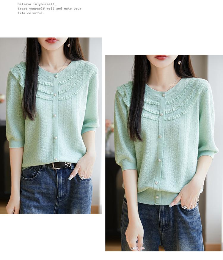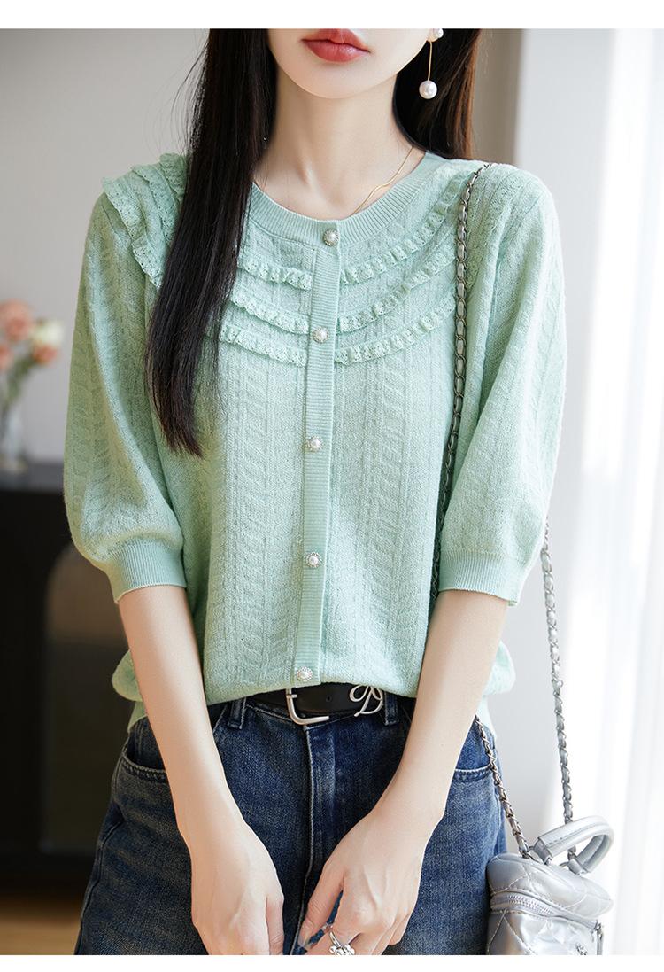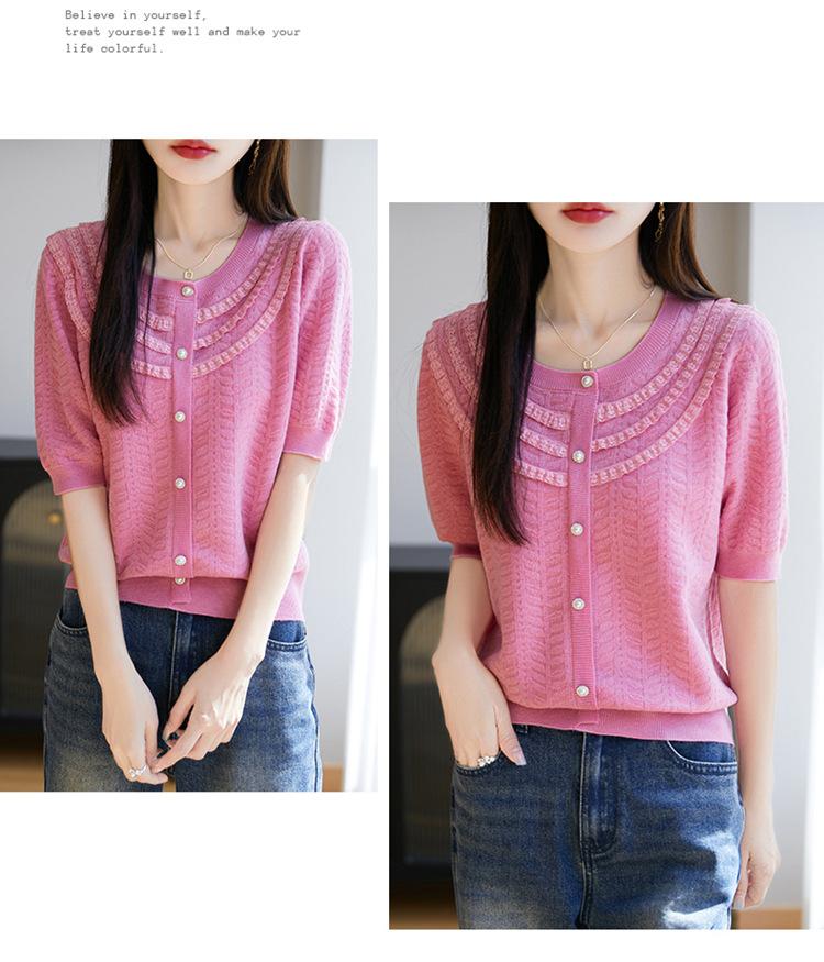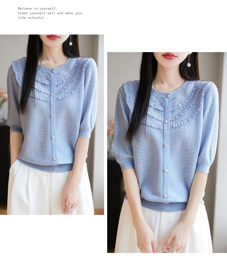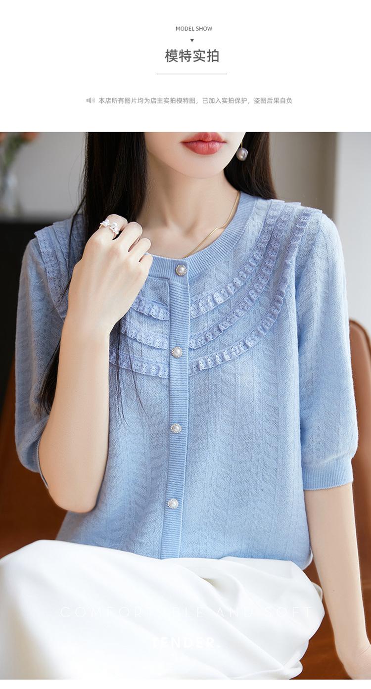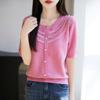 2025 Nueva Moda Camiseta de Manga Corta Holgada Casual Tejido de Lana Diseño de Verano Top con Borde de Hongo de Encaje