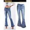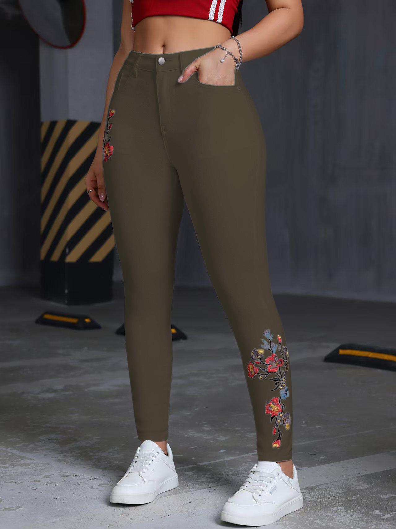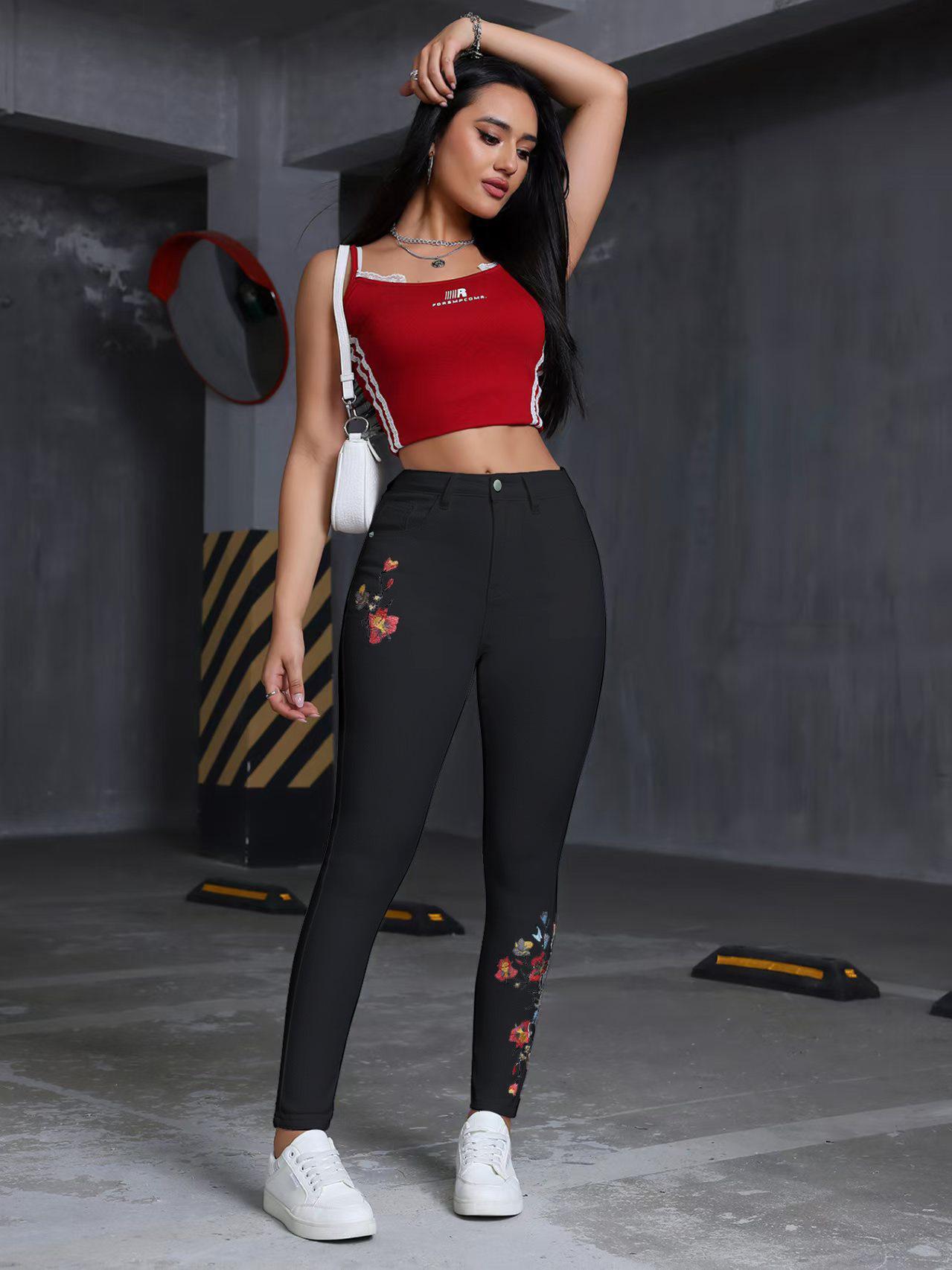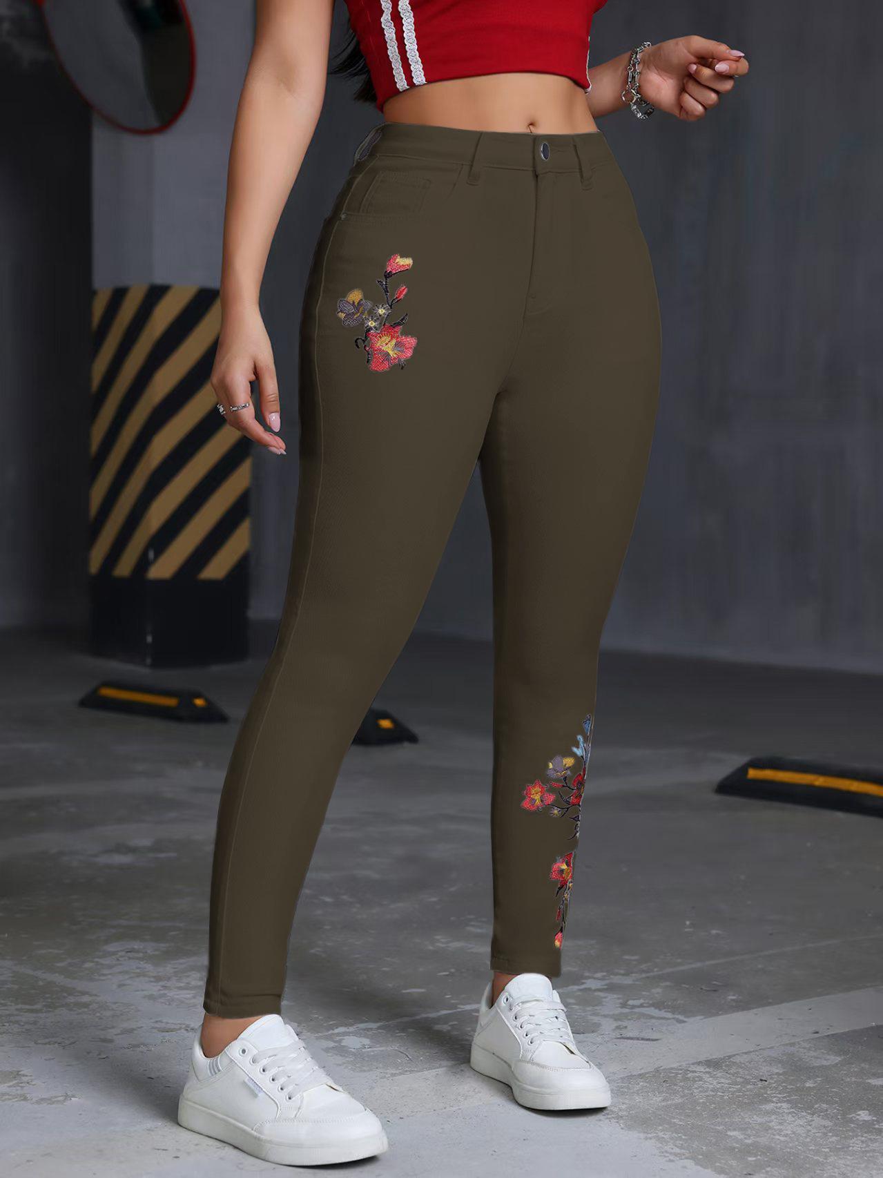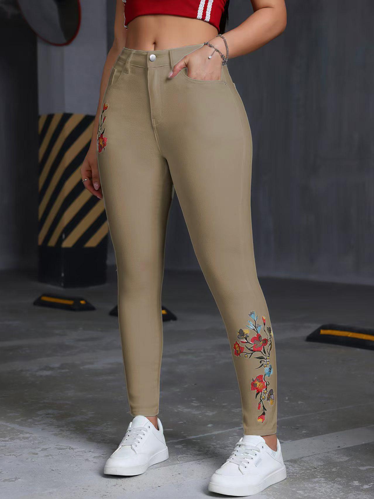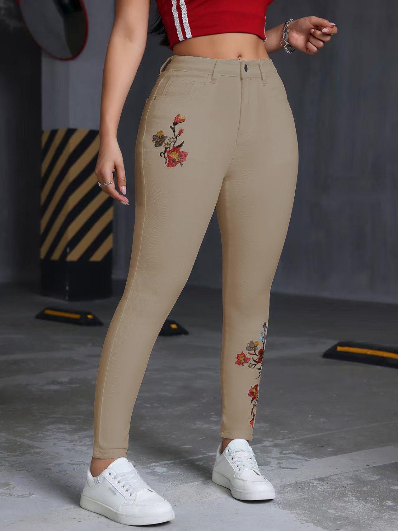Jeans ajustados elásticos bordados con flores europeas y americanas transfronterizas, pantalones de mezclilla casuales versátiles para mujer para todas las estaciones
