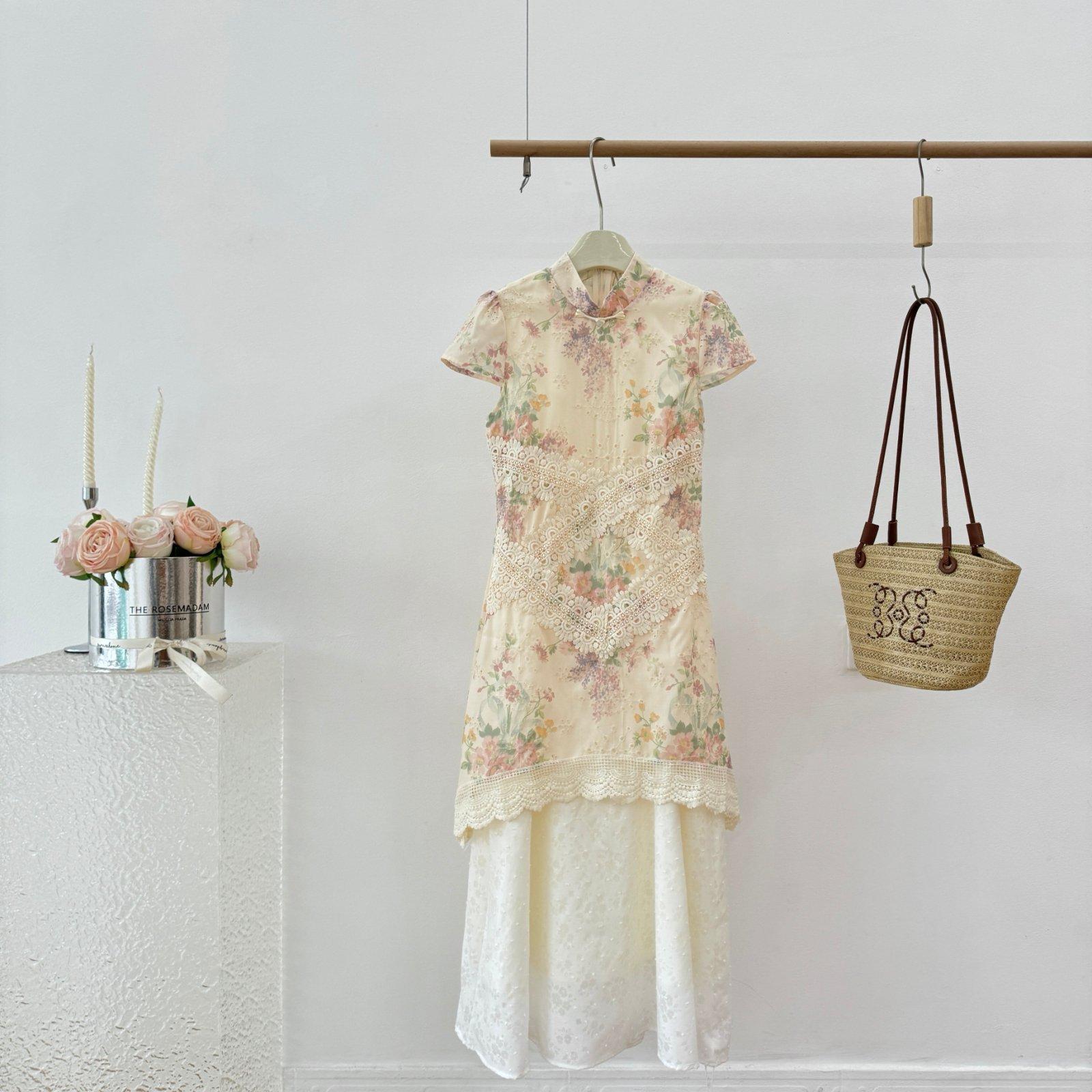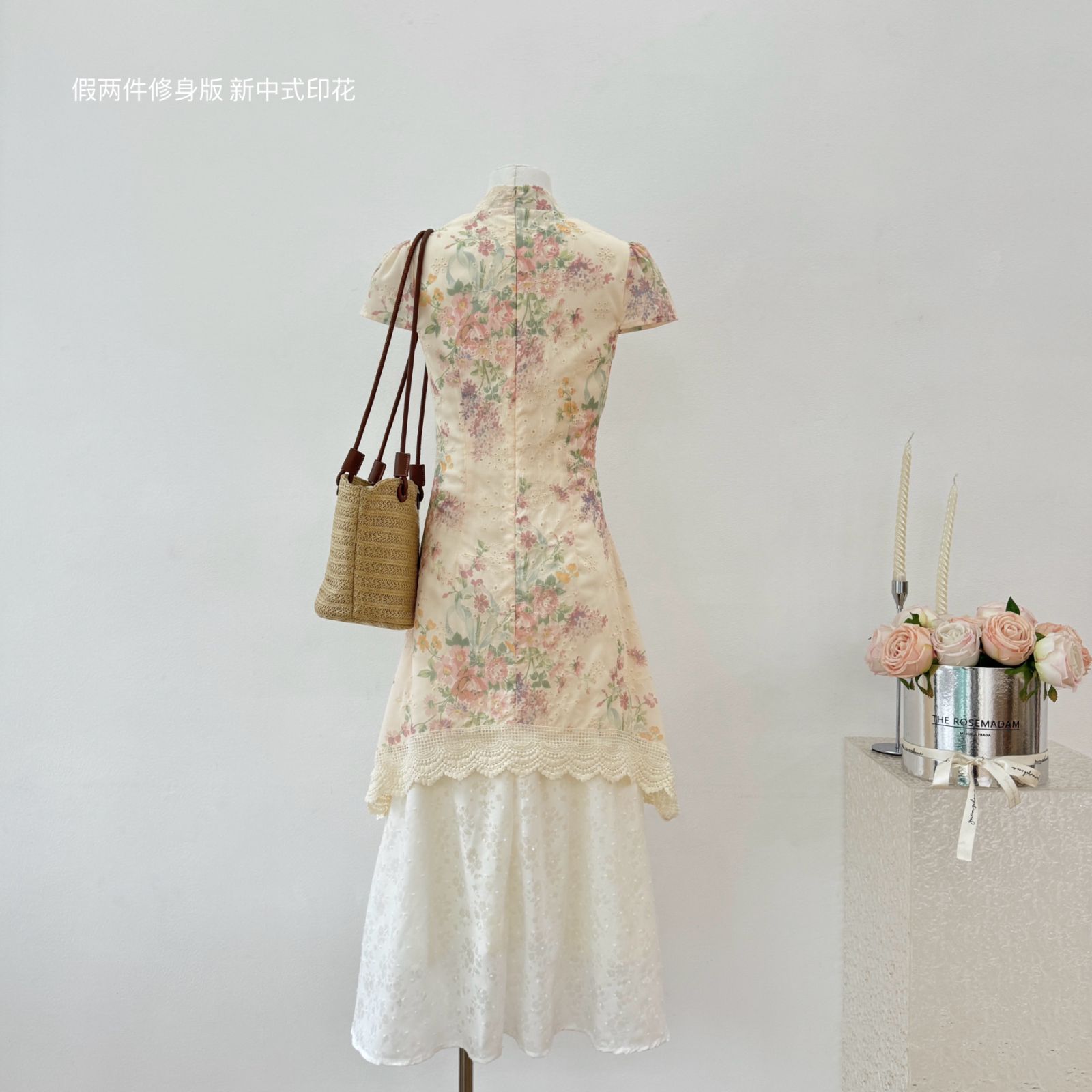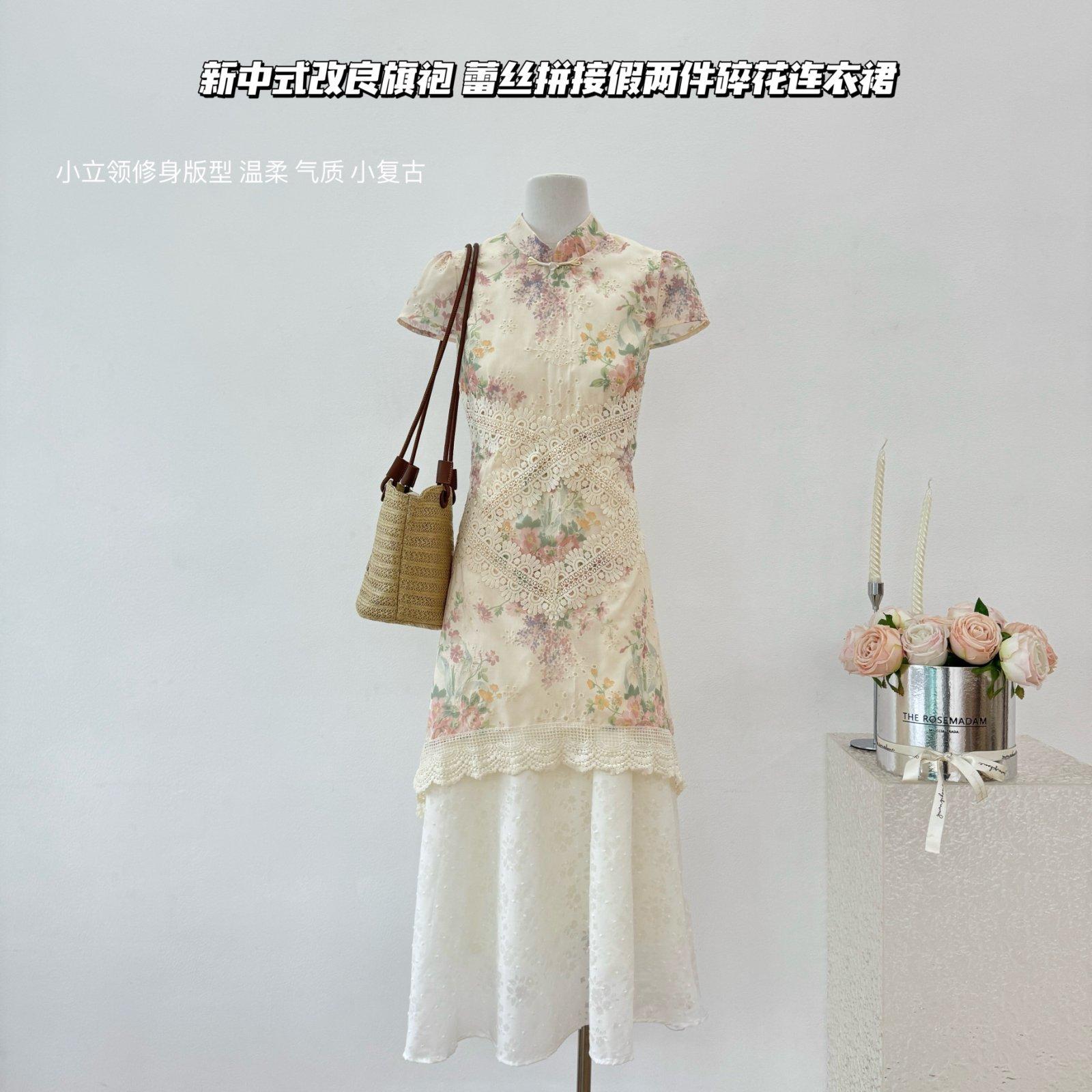 Vestido Cheongsam Retro Modificado de Estilo Chino Nuevo para Mujer 2025 Verano Encaje Costura Cintura Vestido Irregular