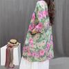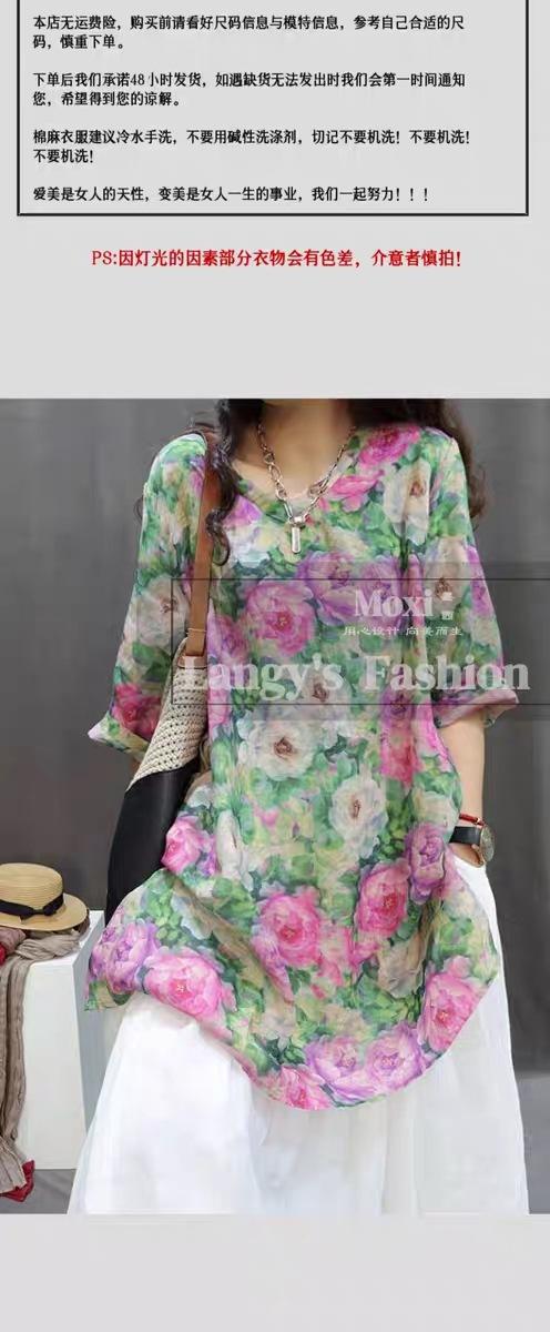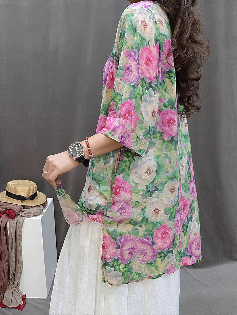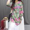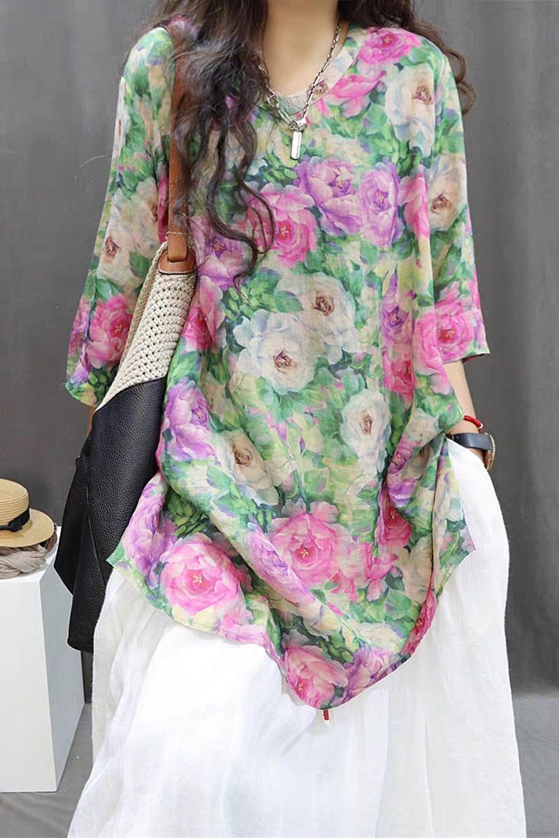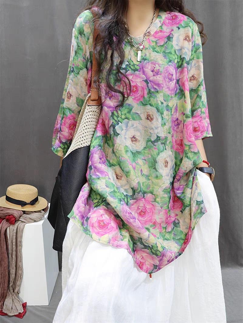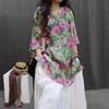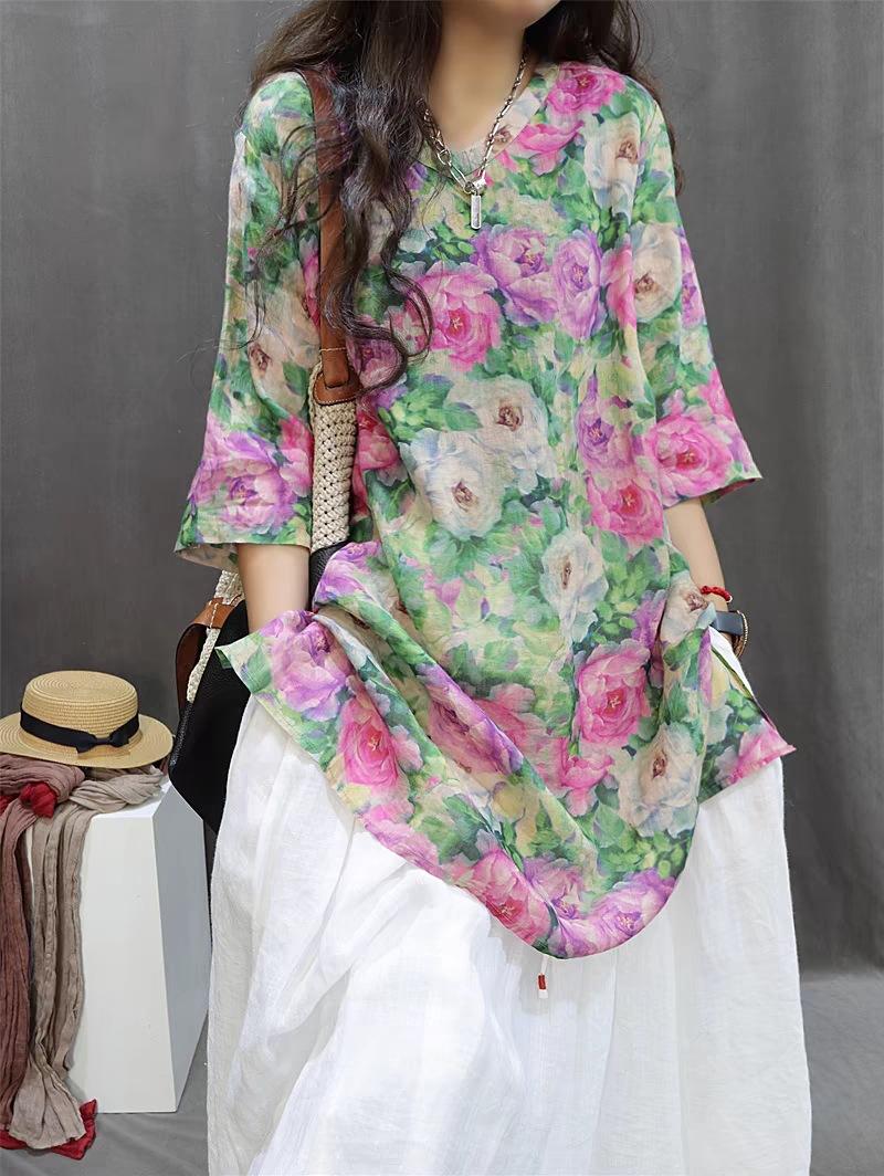 Ropa de Algodón y Lino para Mujer 2025 Primavera y Verano Nuevo Retro Ramio Estampado Cuello en V Pequeño Suelto y Versátil Camiseta Jersey de Manga Media para Mujer