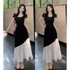 Vestido Negro Estilo Hepburn Francés con Cuello Cuadrado para Mujer Verano Nuevo Estilo Cintura Adelgazante Temperamento Petite Hada Vestido Largo