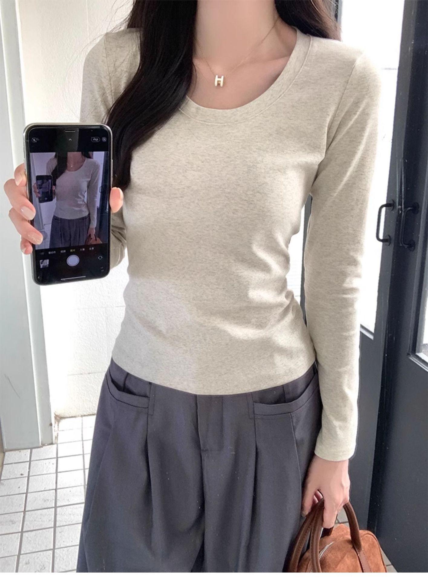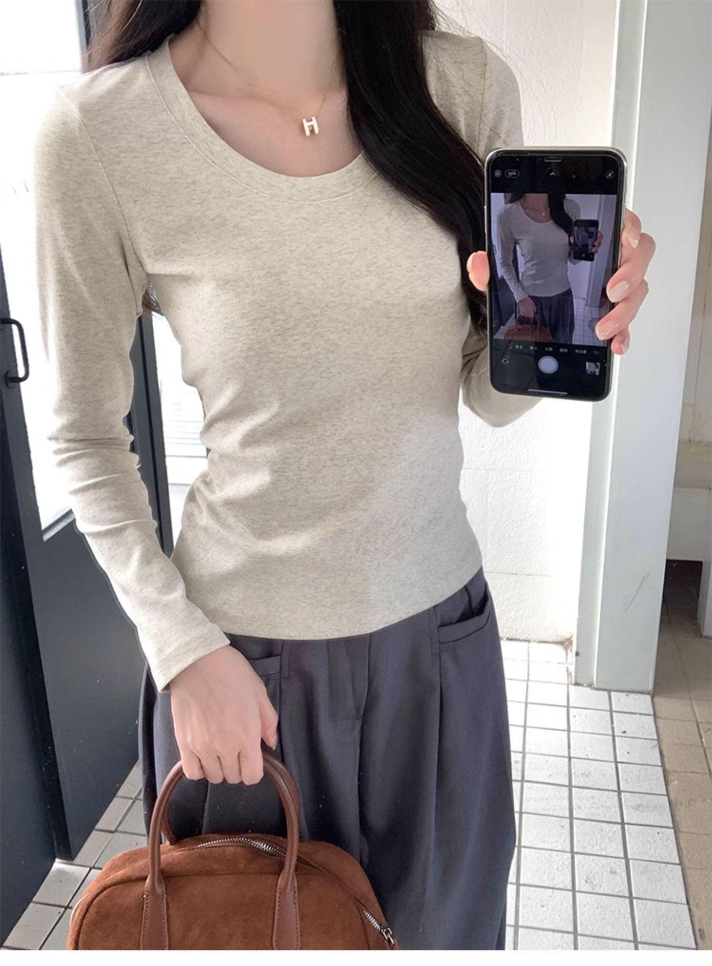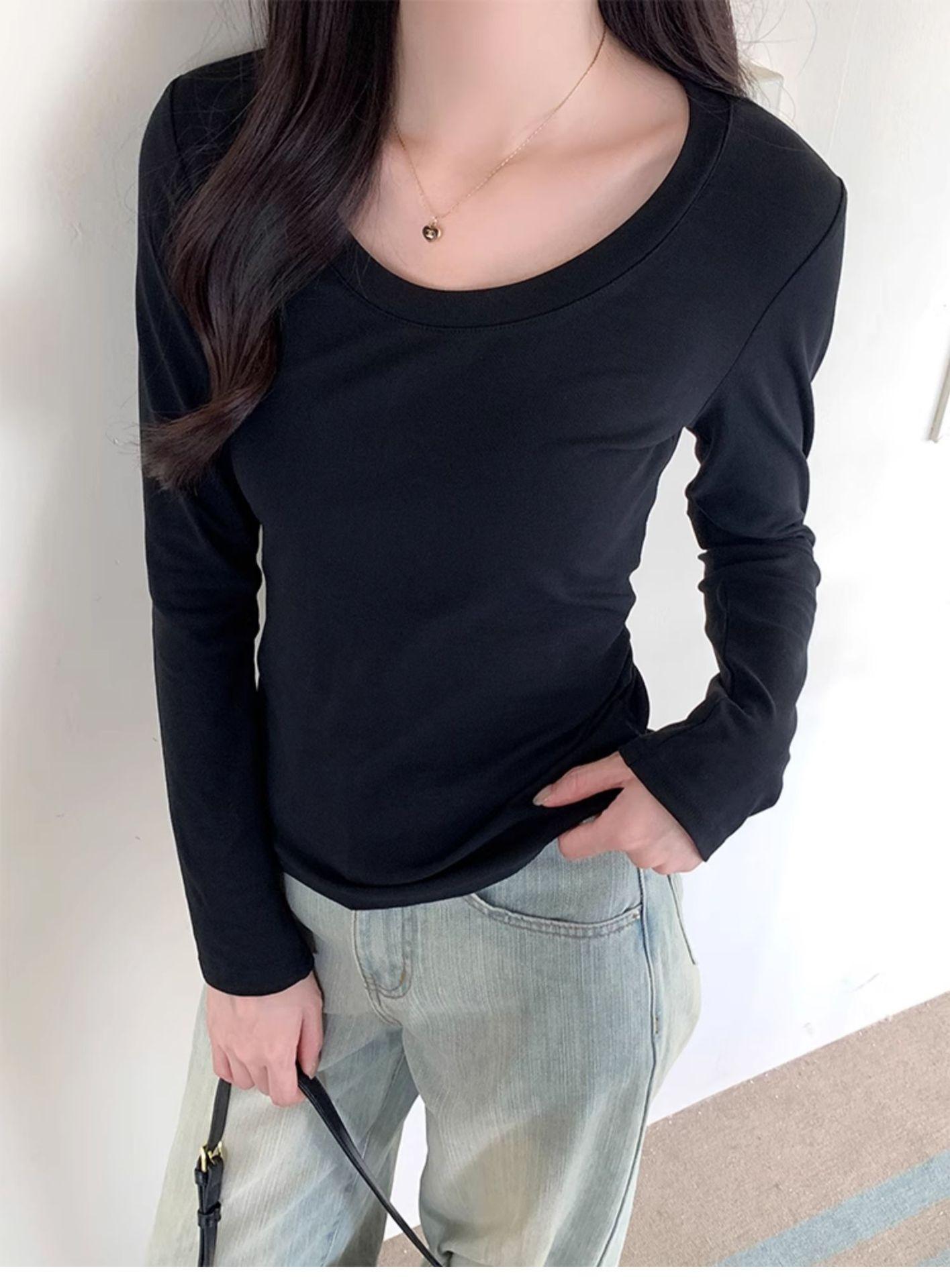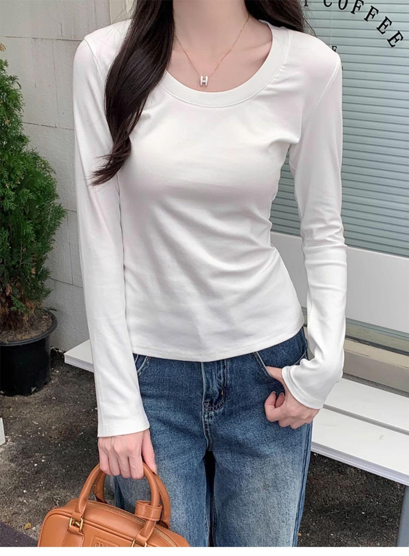 Playera de Algodón de 40 Hilos de Manga Larga con Hombro Regular Nuevo Cuello Redondo Básico Slim Color Sólido Trendy Base Top Adelgazante