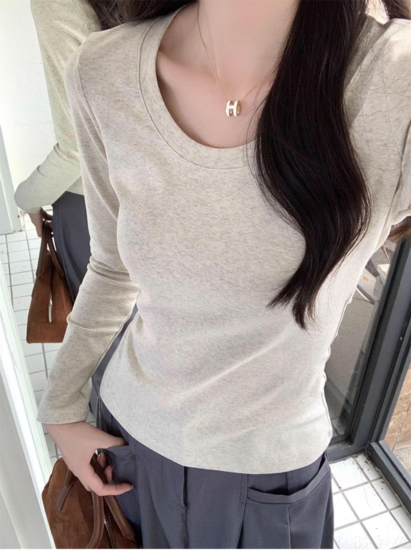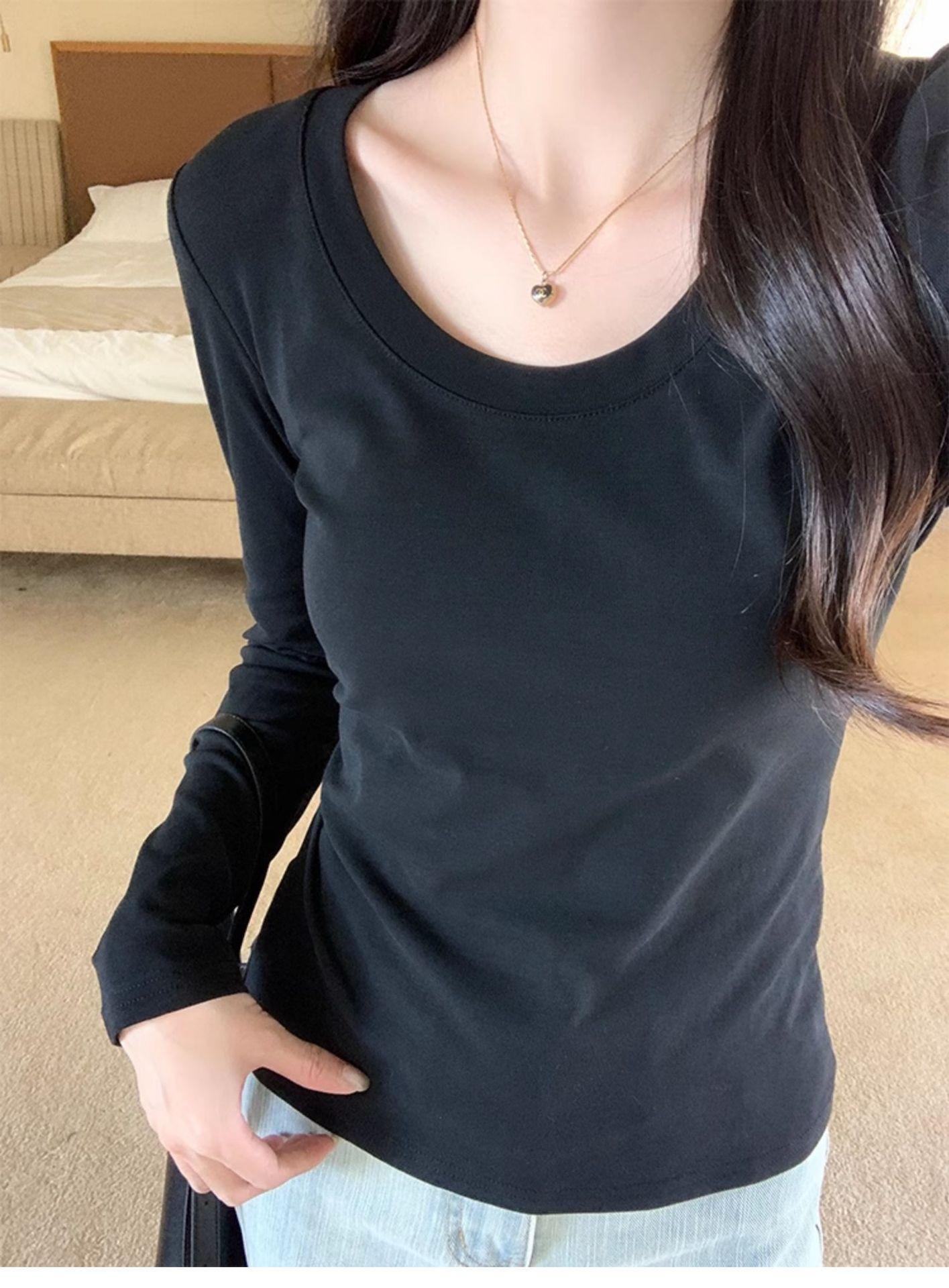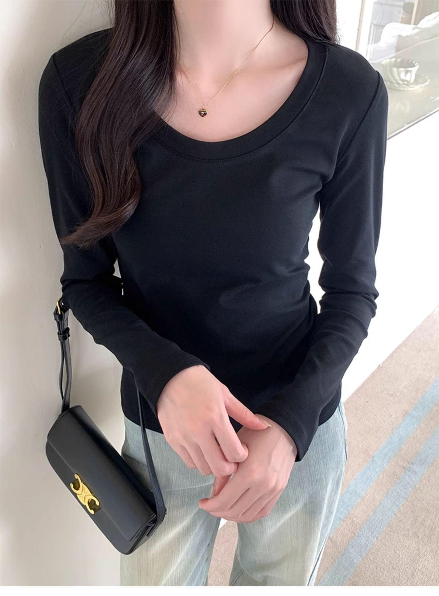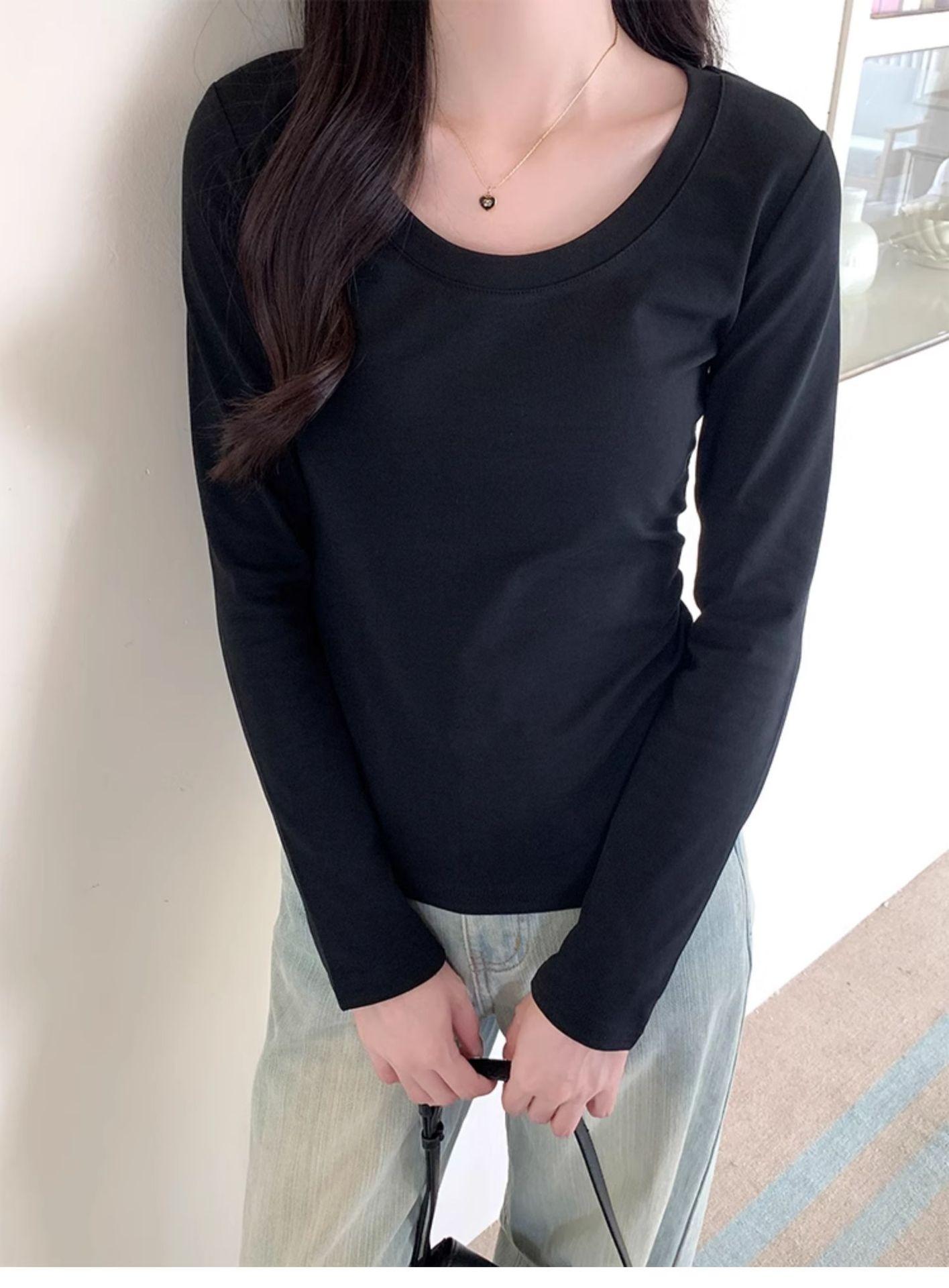 Playera de Algodón de 40 Hilos de Manga Larga con Hombro Regular Nuevo Cuello Redondo Básico Slim Color Sólido Trendy Base Top Adelgazante