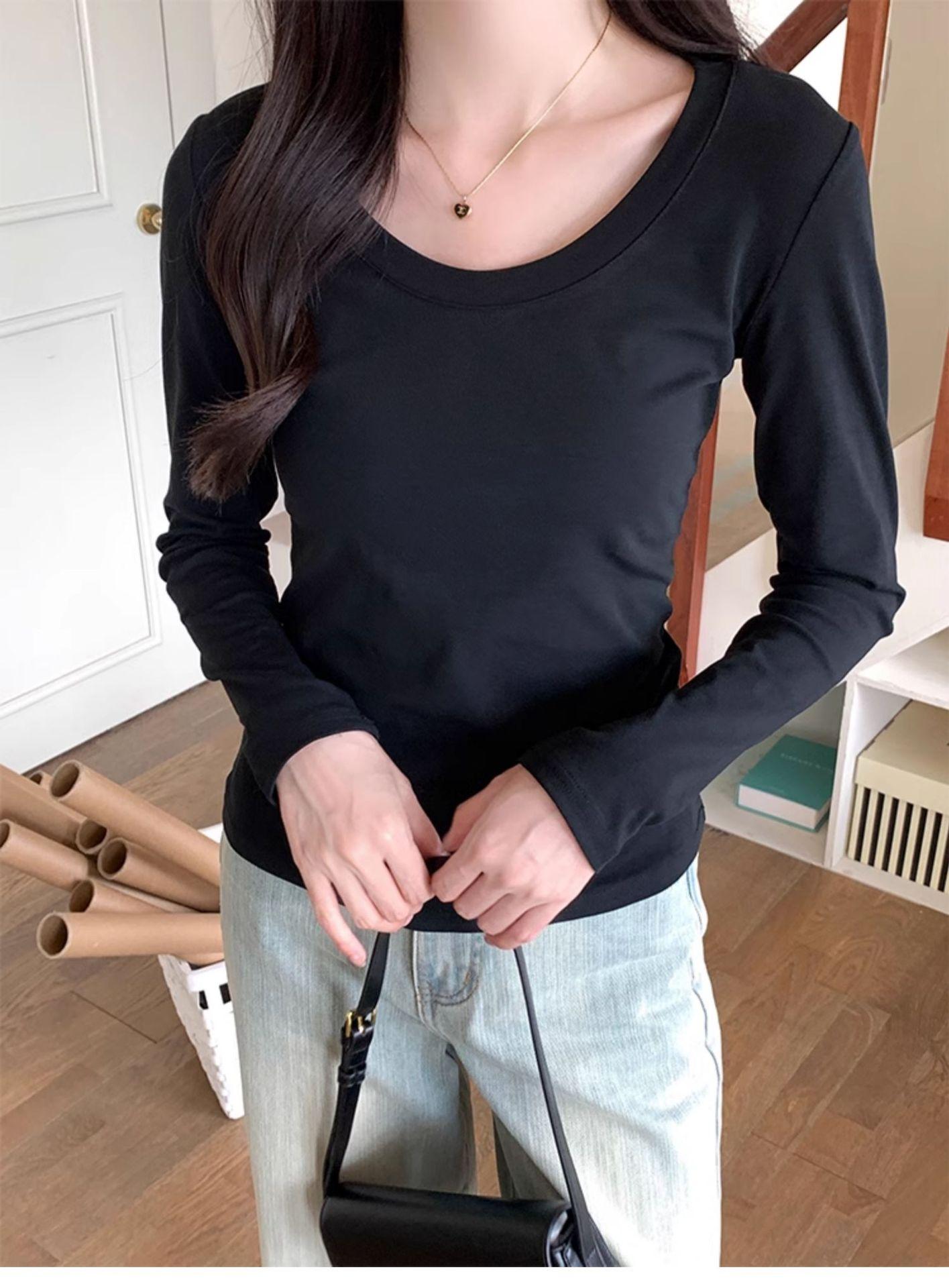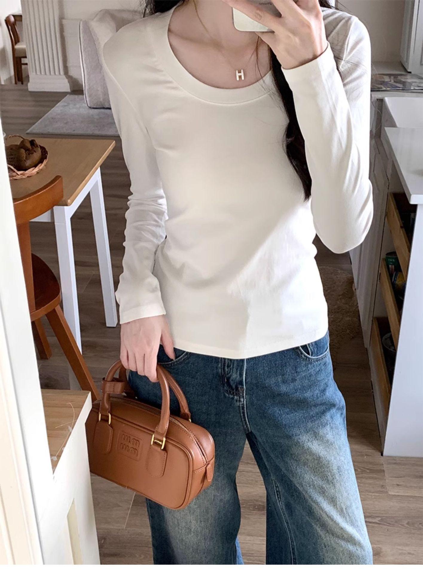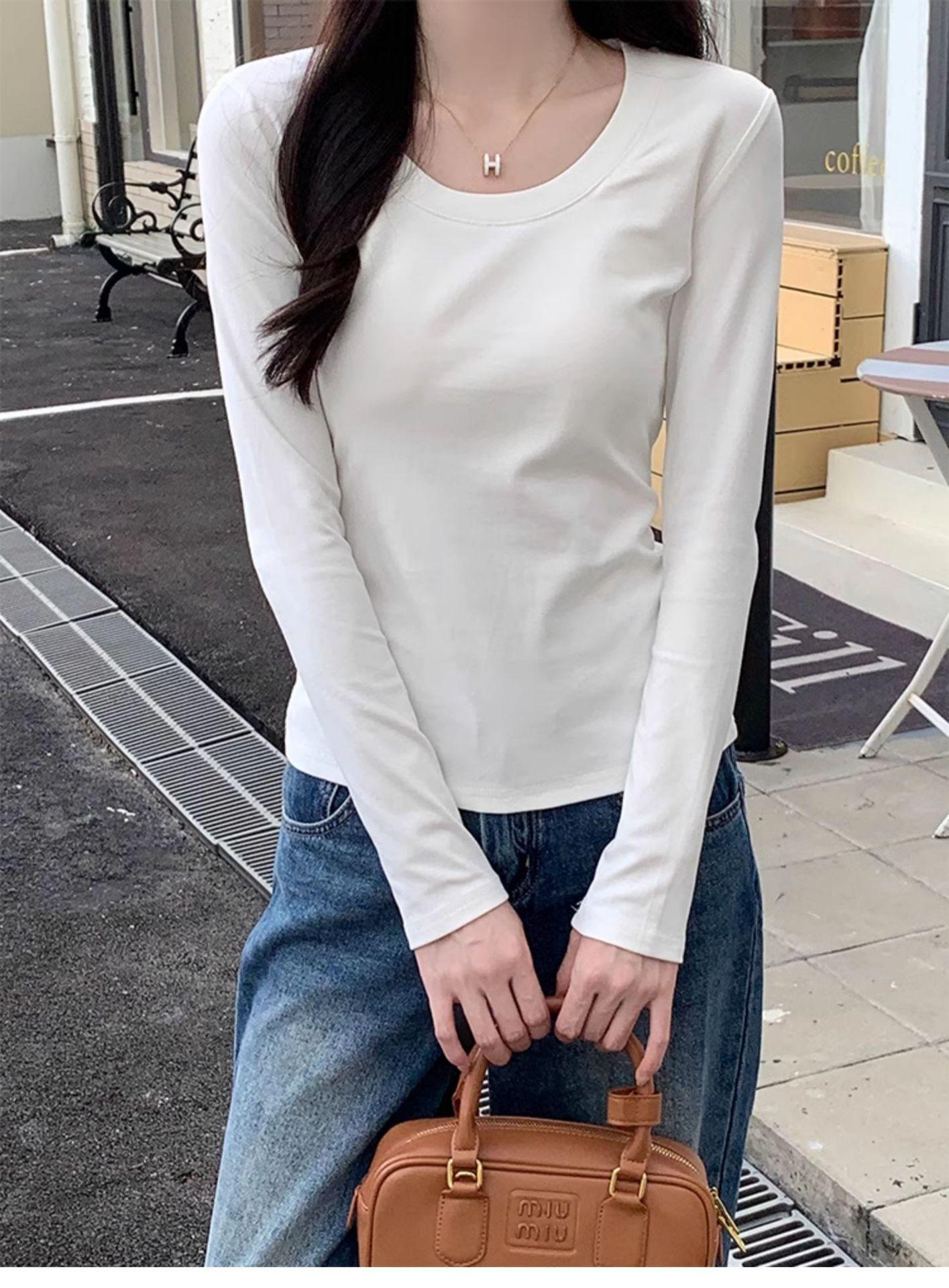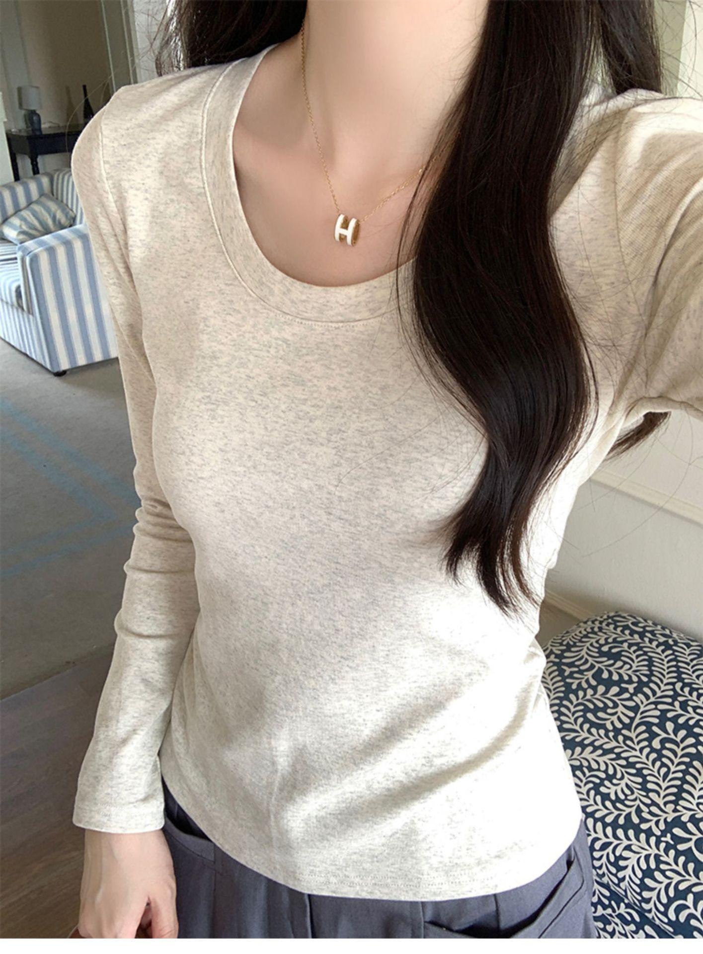 Playera de Algodón de 40 Hilos de Manga Larga con Hombro Regular Nuevo Cuello Redondo Básico Slim Color Sólido Trendy Base Top Adelgazante