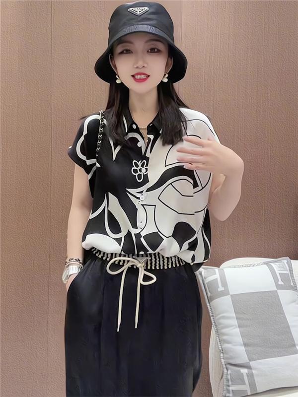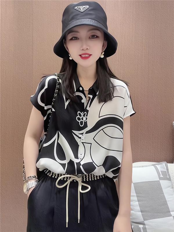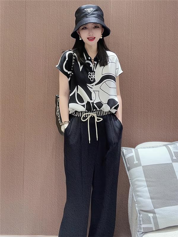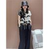 Camisa Delgada de Solapa a Color Block de Manga Corta Traje de Pantalones Anchos Sueltos para Mujer Verano Europeo Casual Moda Deportiva Conjunto de Dos Piezas