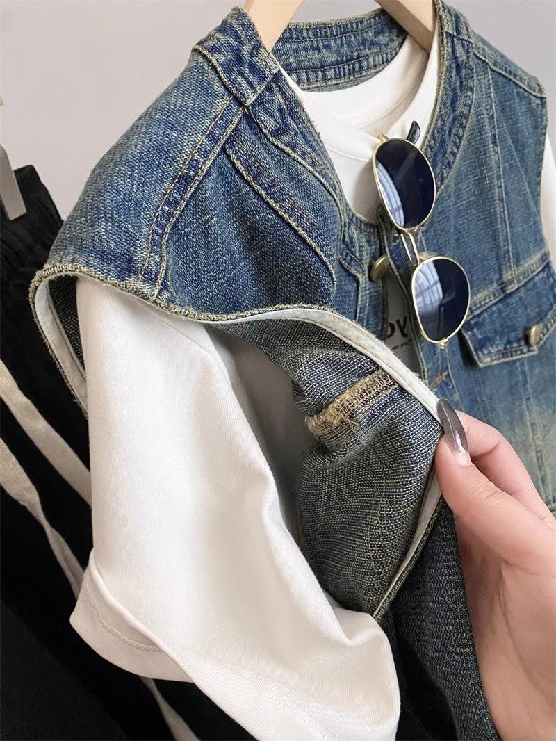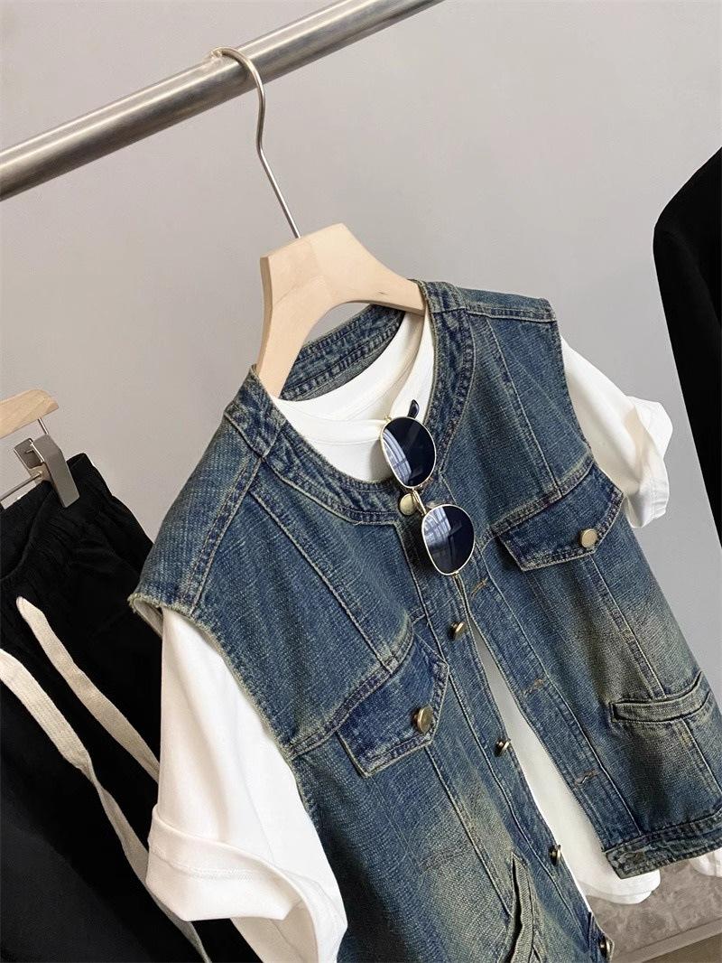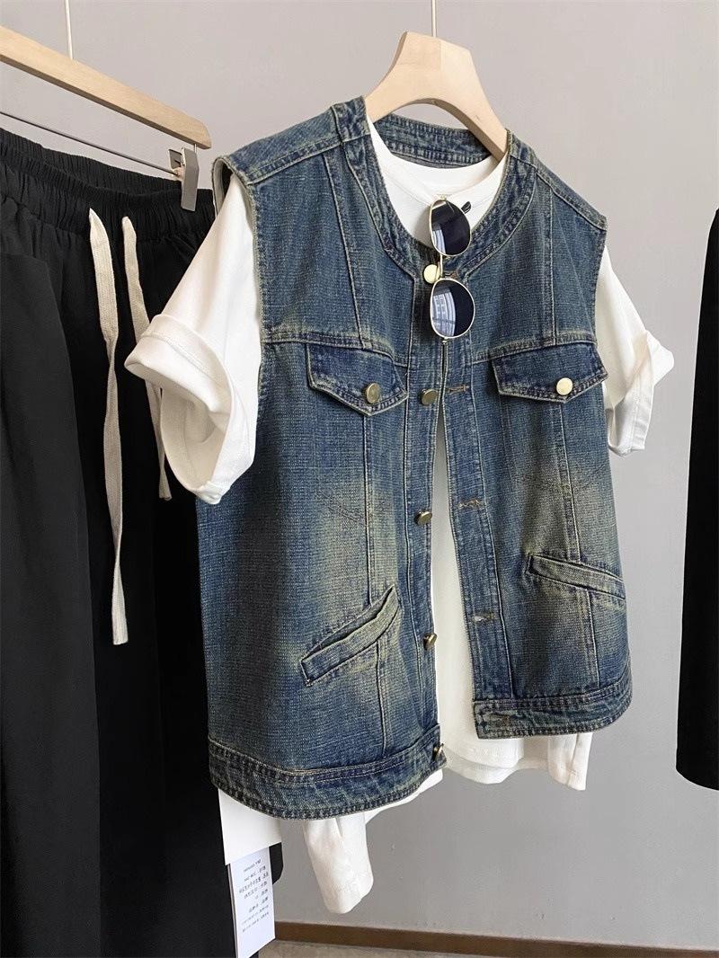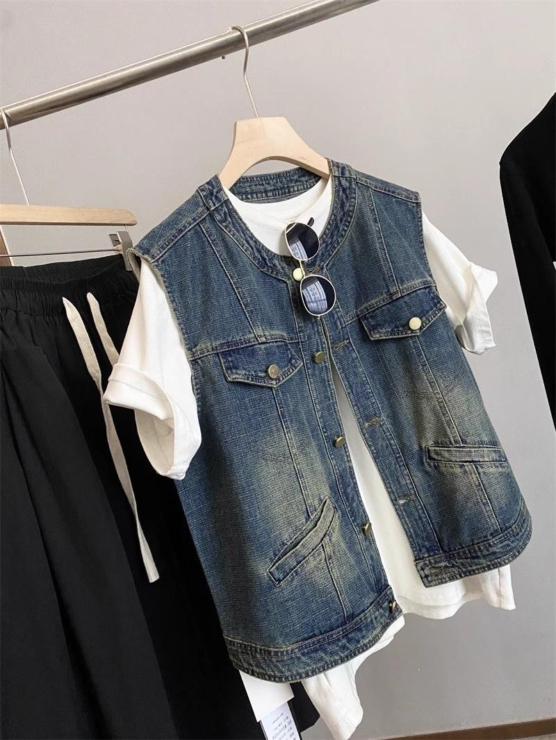 Chaleco de Mezclilla con Bolsillo Lavado Vintage para Mujer Diseño de Primavera y Otoño Sensación Apilado Sin Mangas Casual Winch Chaleco Top