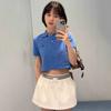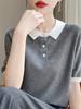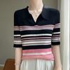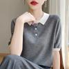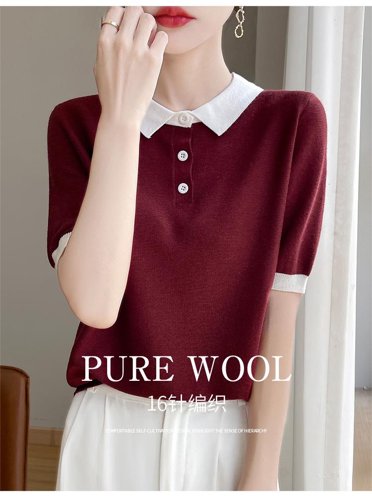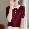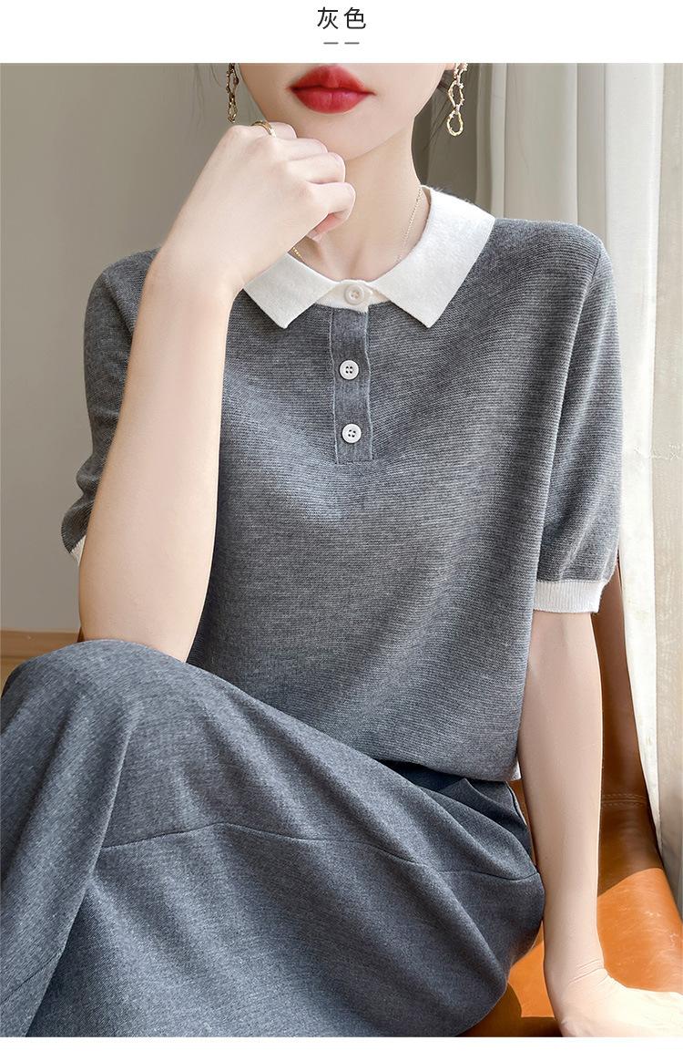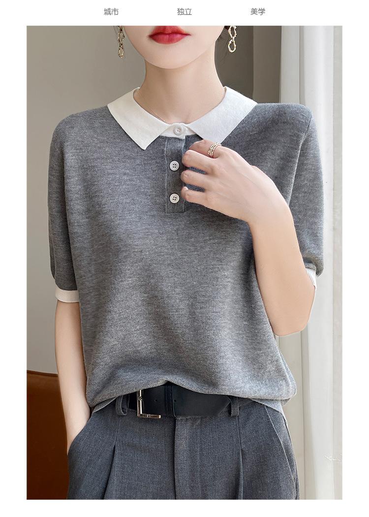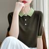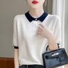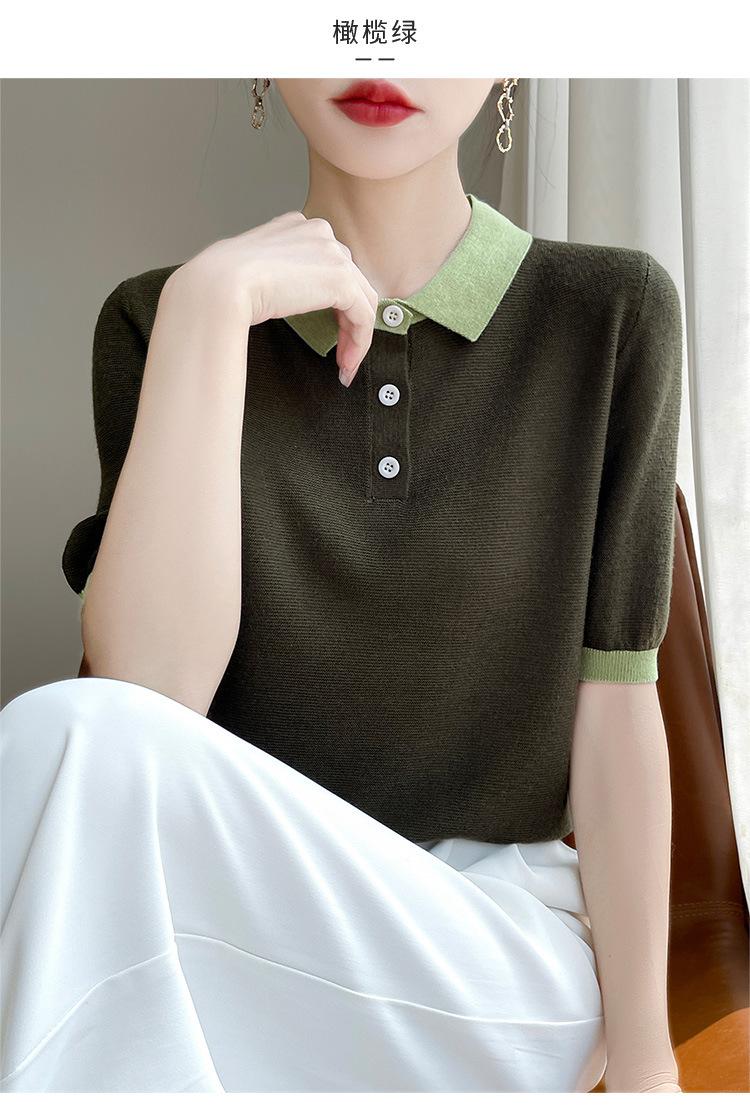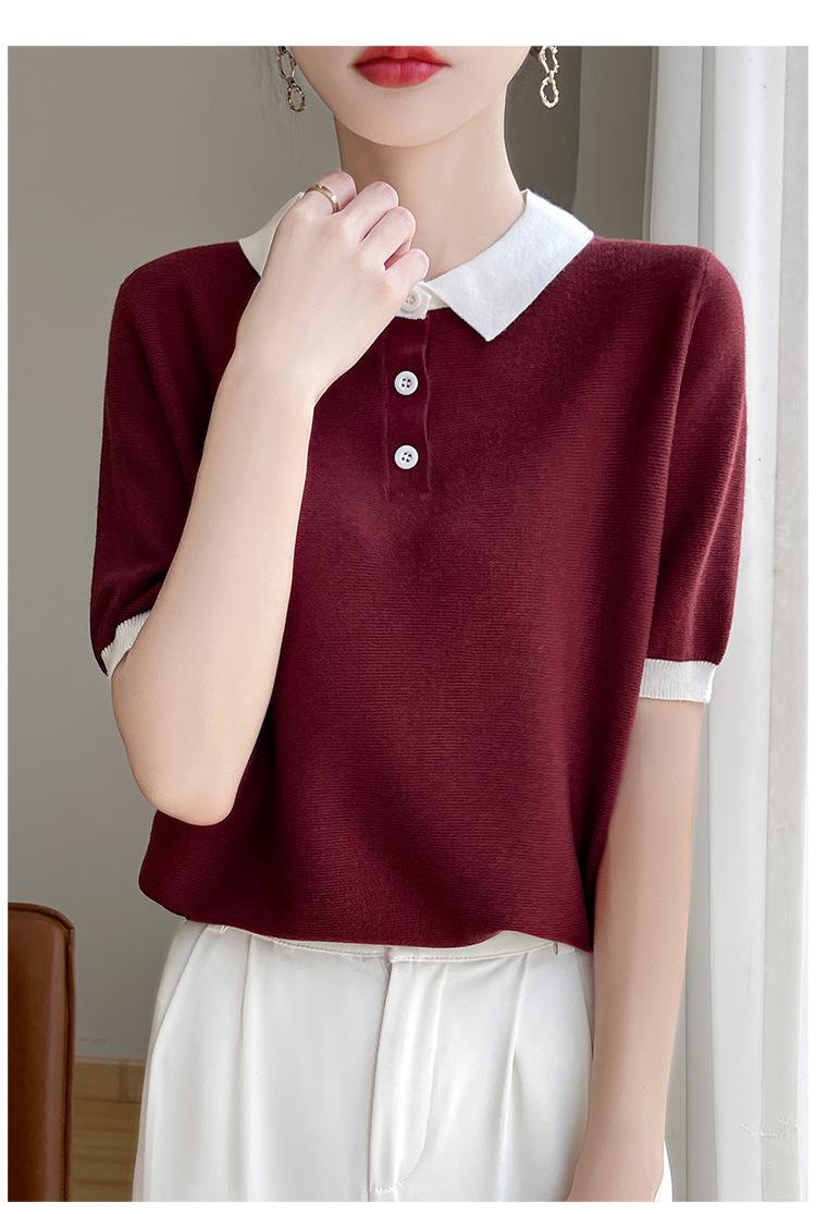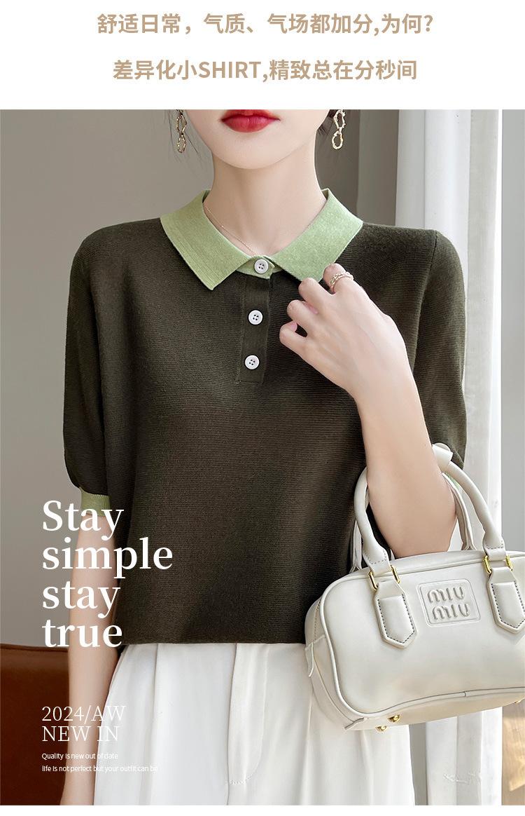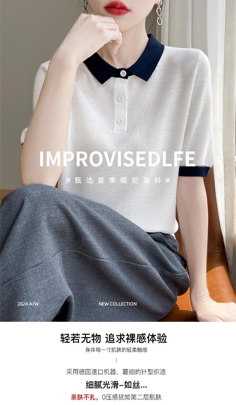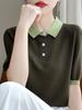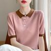 Playera Tejida de Manga Corta con Cuello Polo Elegante Casual 2024 Verano Nueva Versátil Reductora de Edad Delgada Color Contrastante Top Básico