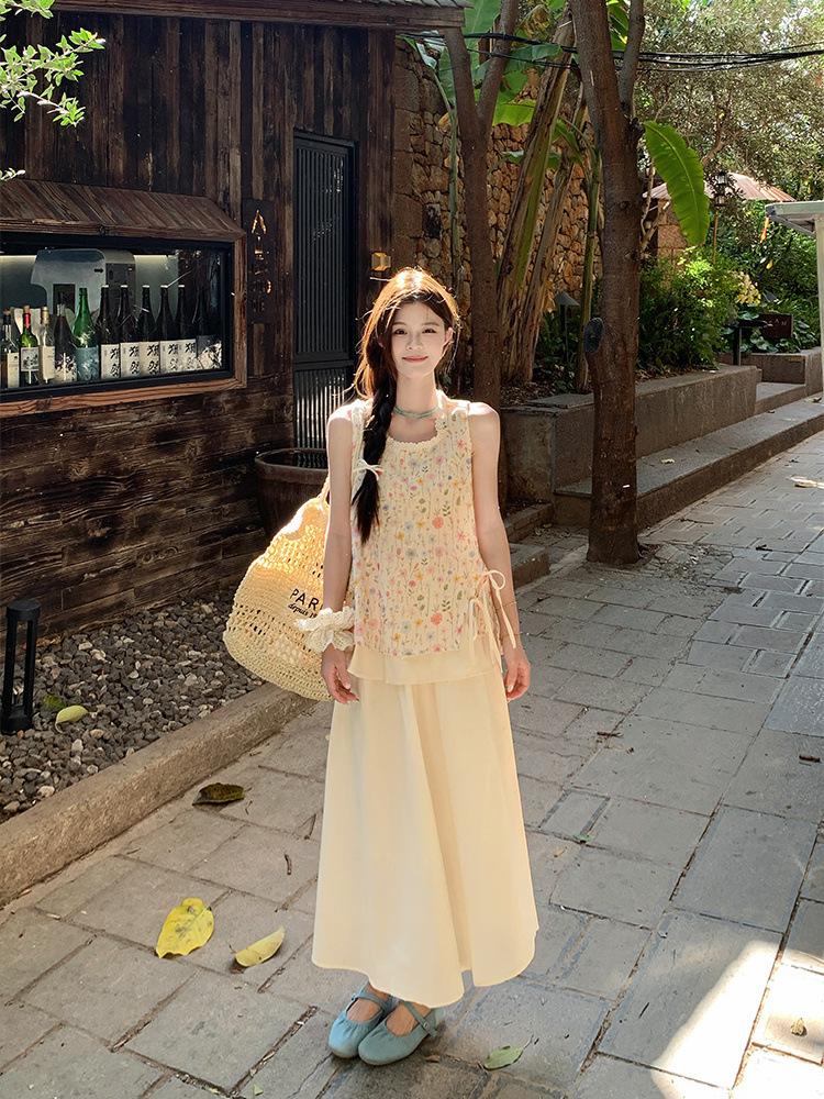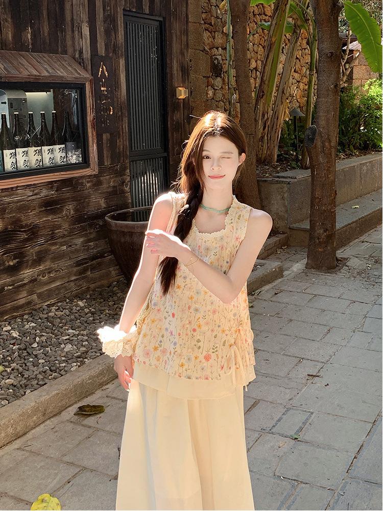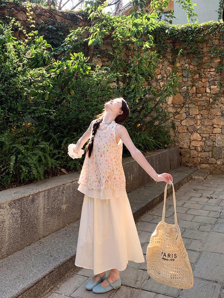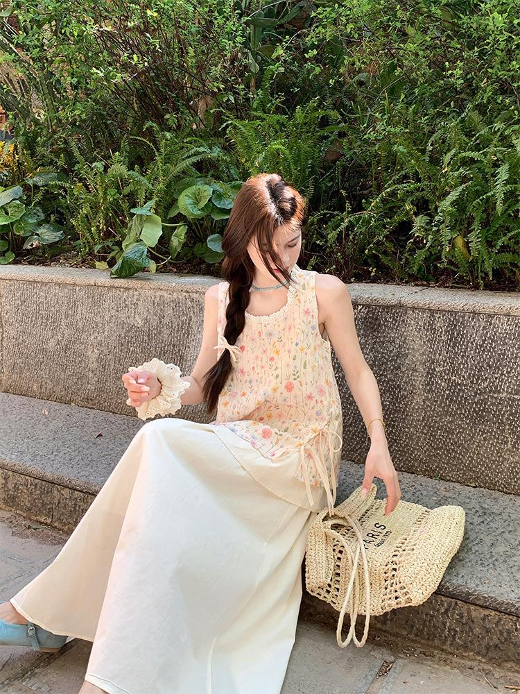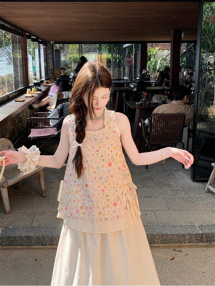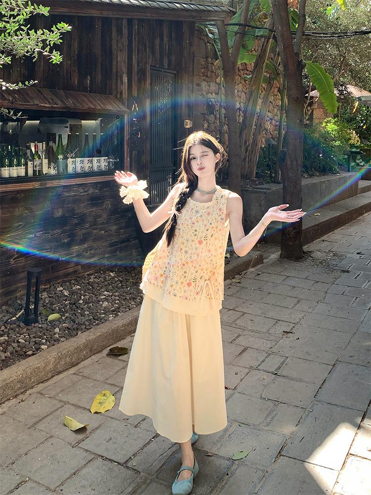Traje de Moda de Niña Dulce y Gentil para Mujer Chaleco Suelto sin Mangas con Flores para Mujer Falda de Verano de Cintura Alta Conjunto de Dos Piezas