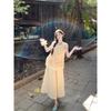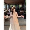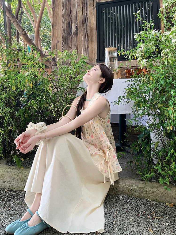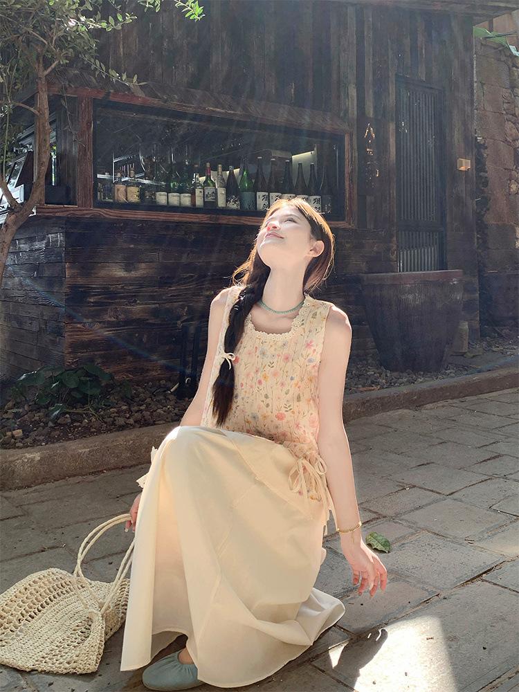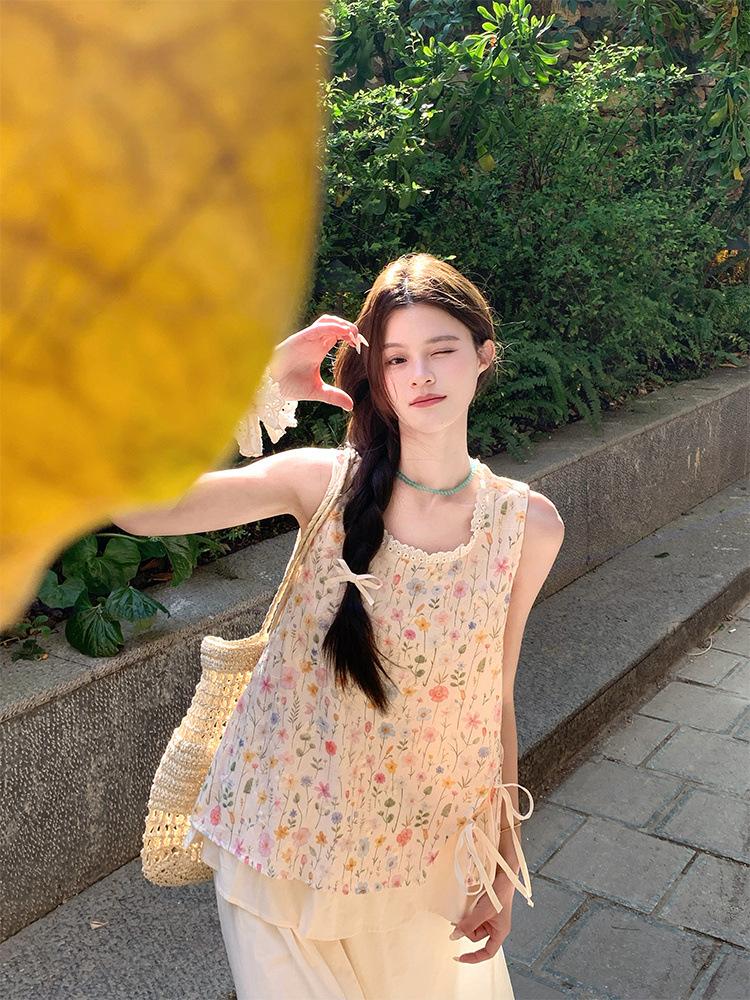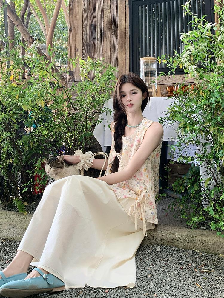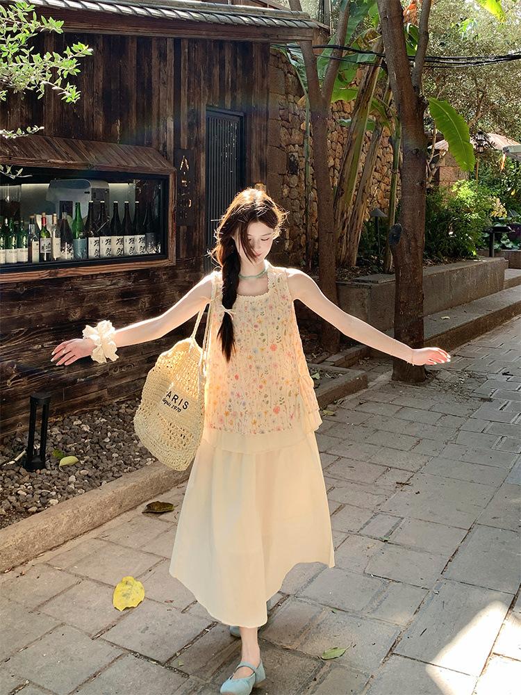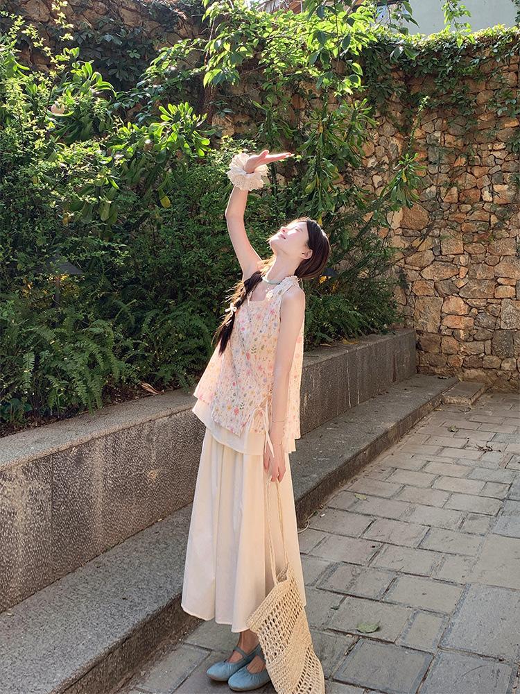 Traje de Moda de Niña Dulce y Gentil para Mujer Chaleco Suelto sin Mangas con Flores para Mujer Falda de Verano de Cintura Alta Conjunto de Dos Piezas