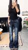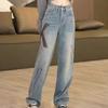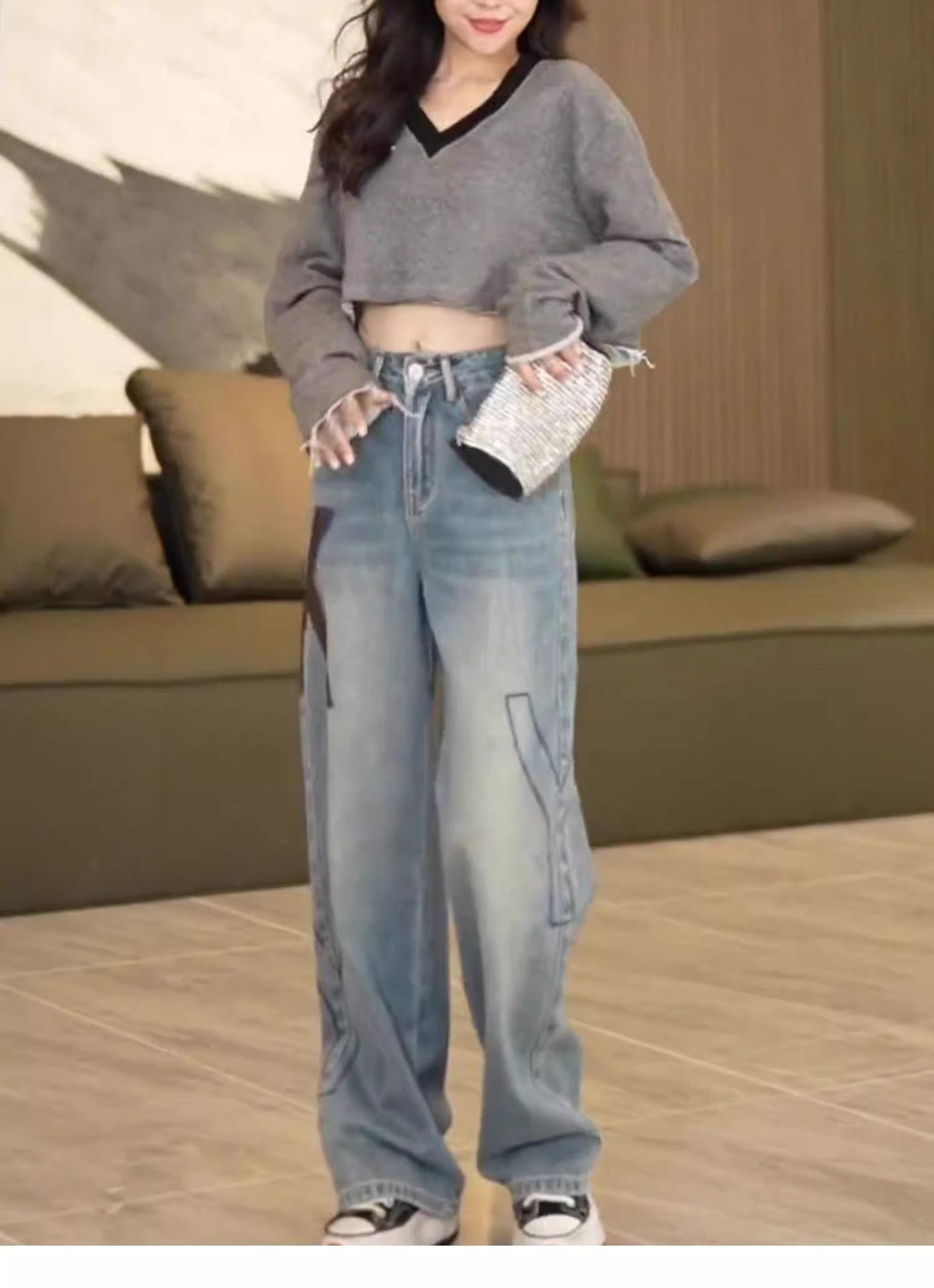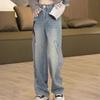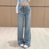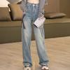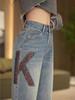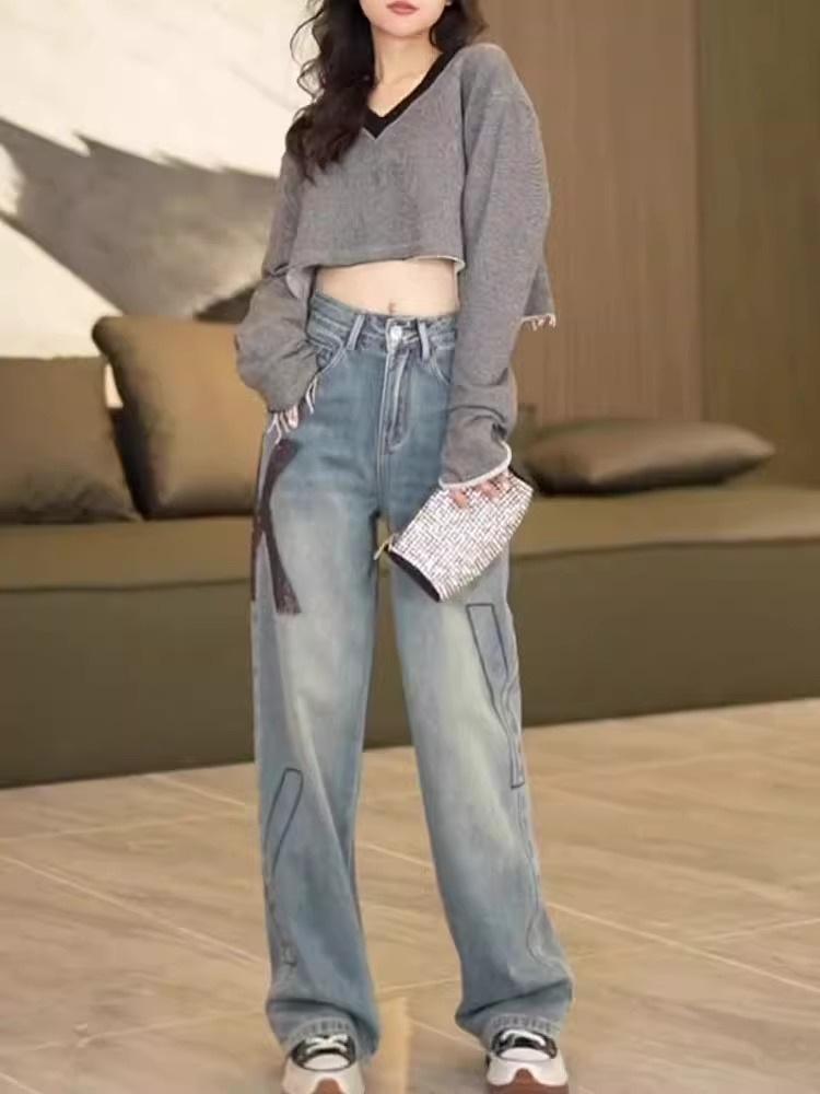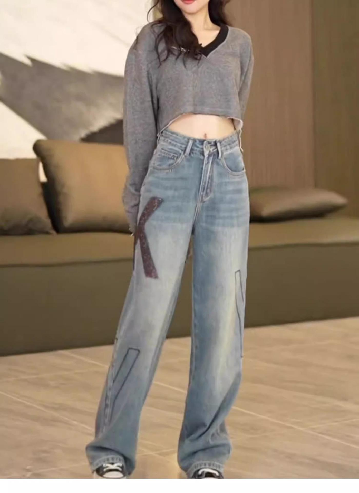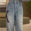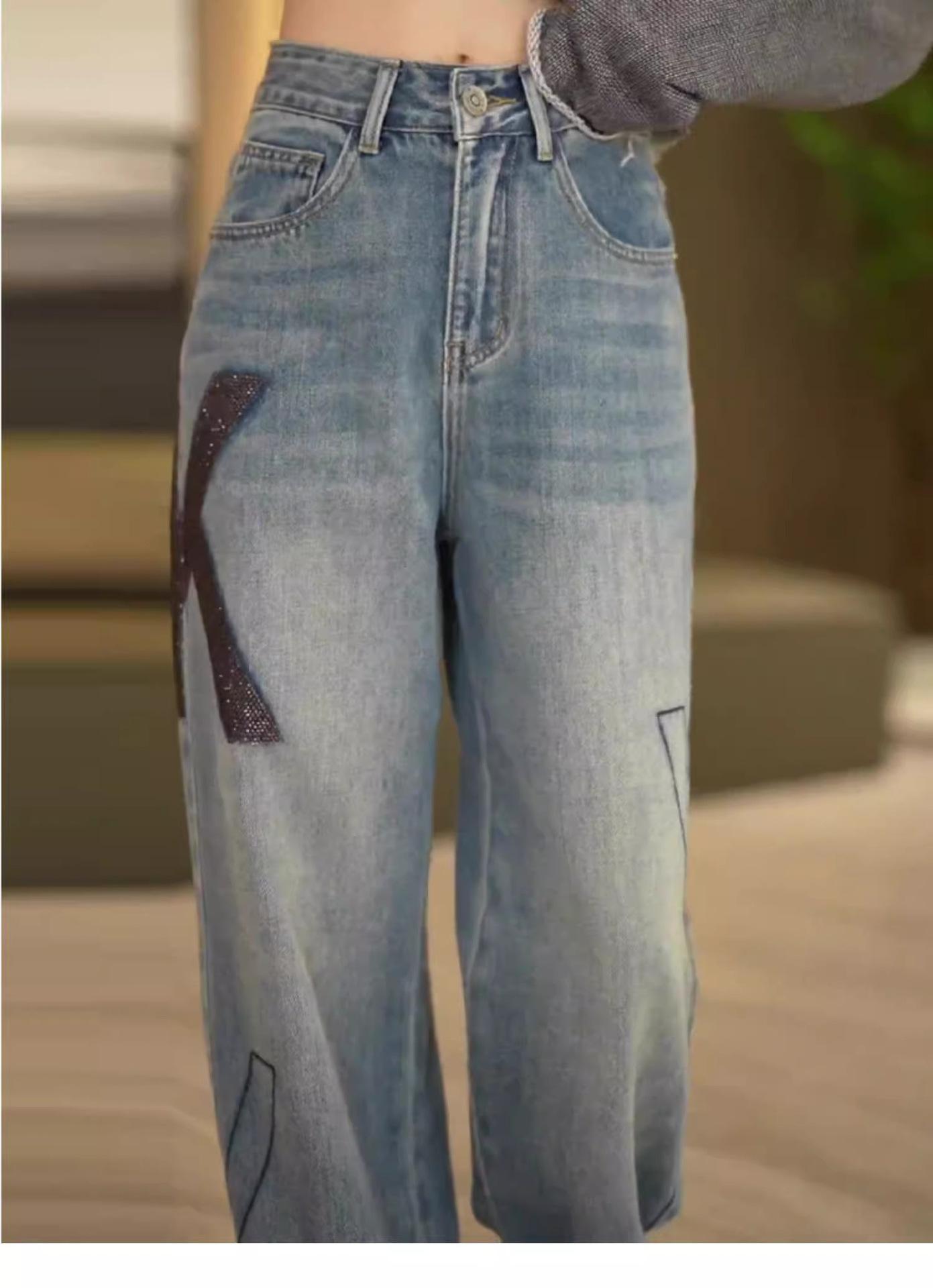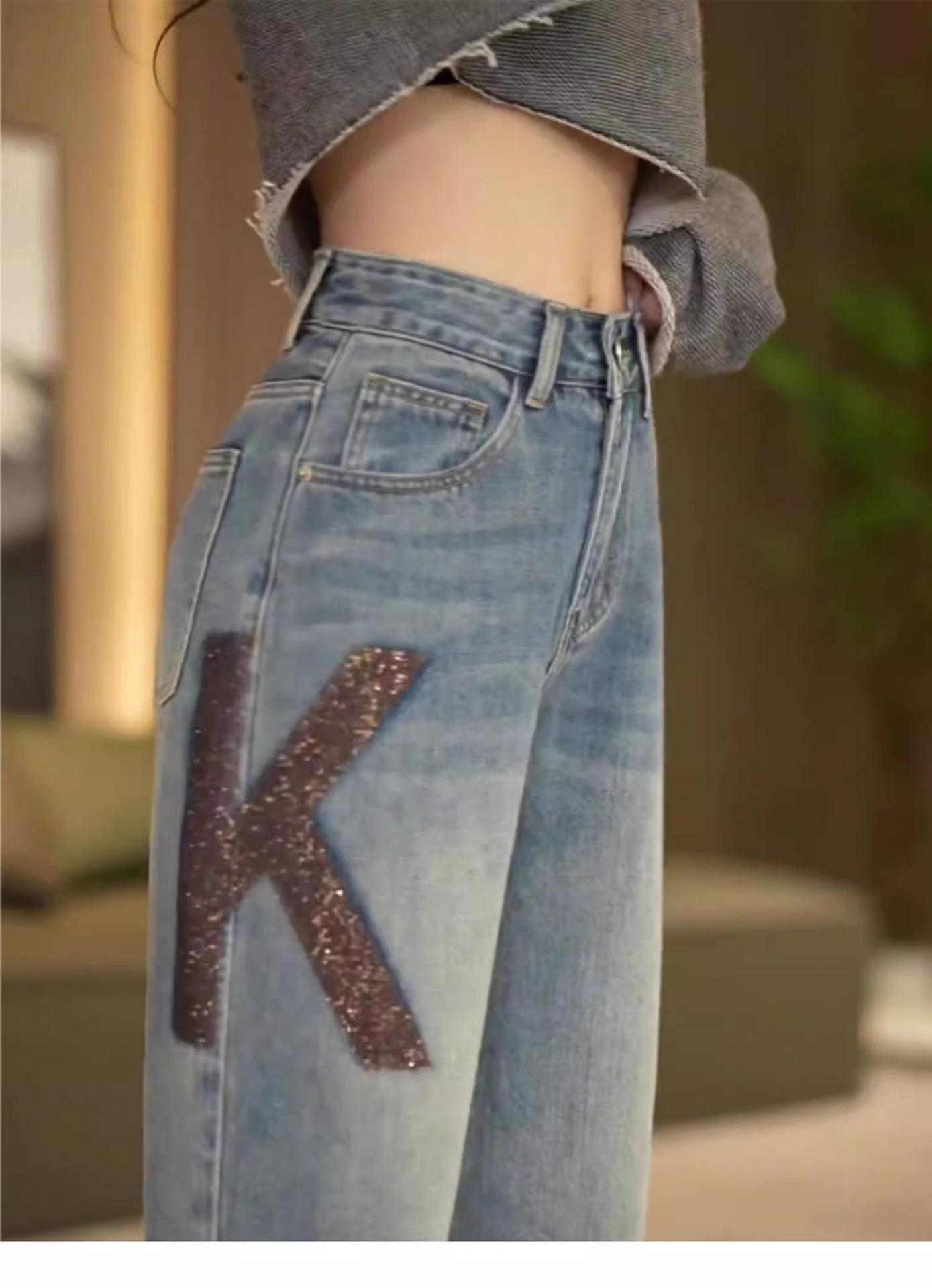 Jeans Rectos de Diamantes Calientes de Letras de Alta Gama 2025 Otoño Nuevo Cintura Alta Slim Modernos Pierna Ancha