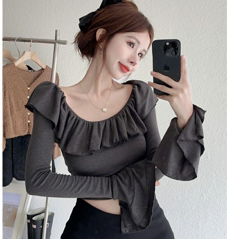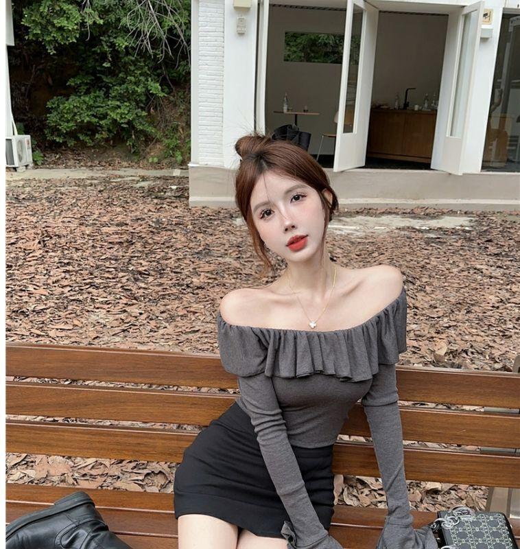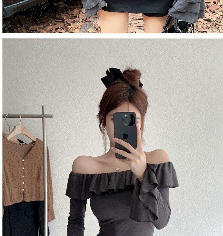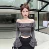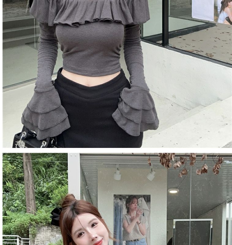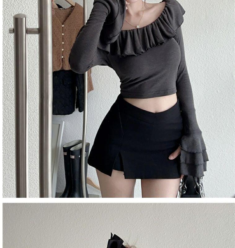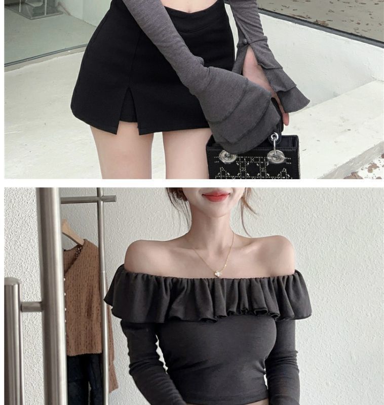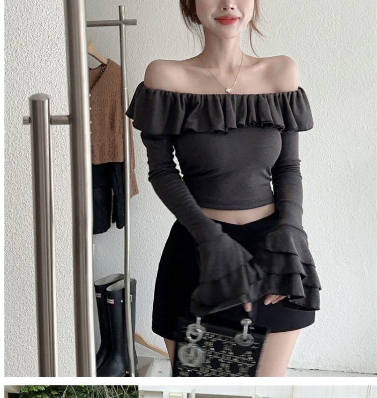 [Venta al por mayor transfronteriza] Top de un hombro con volantes Pure Desire, manga acampanada, sexy, hombros descubiertos, camiseta de manga larga, camisa básica