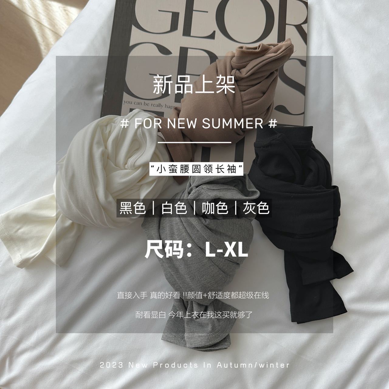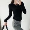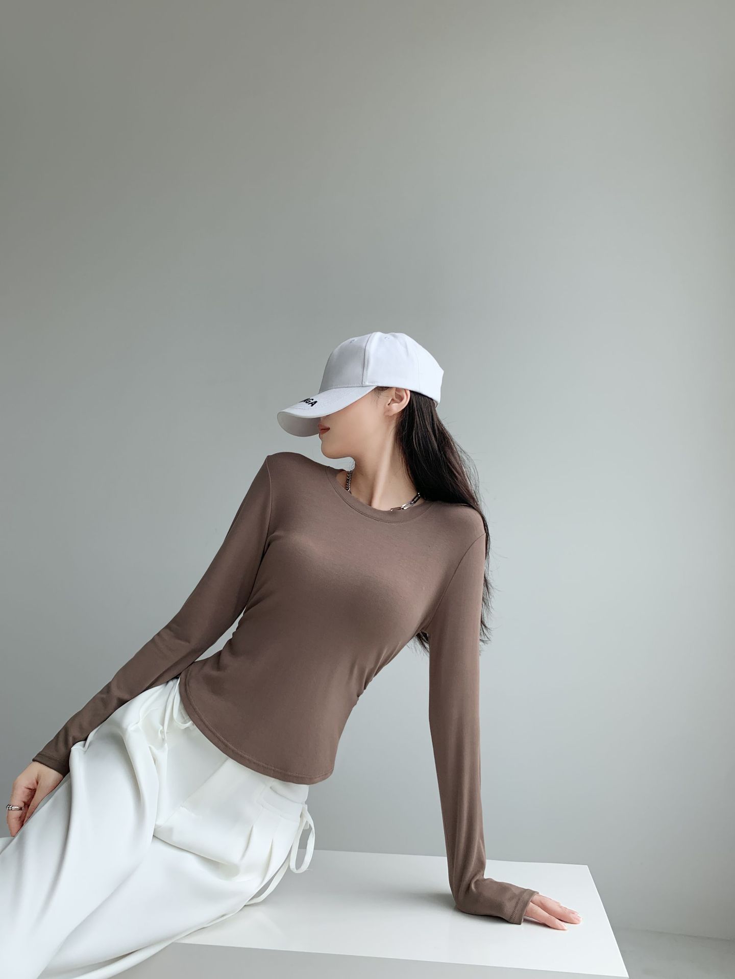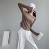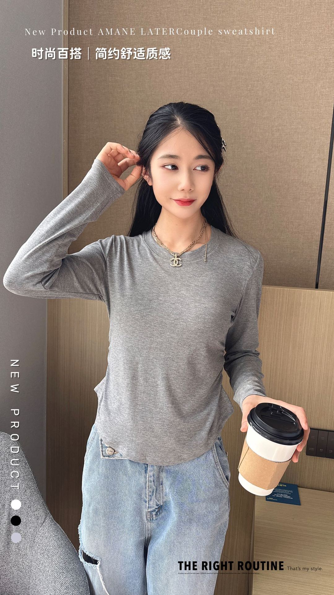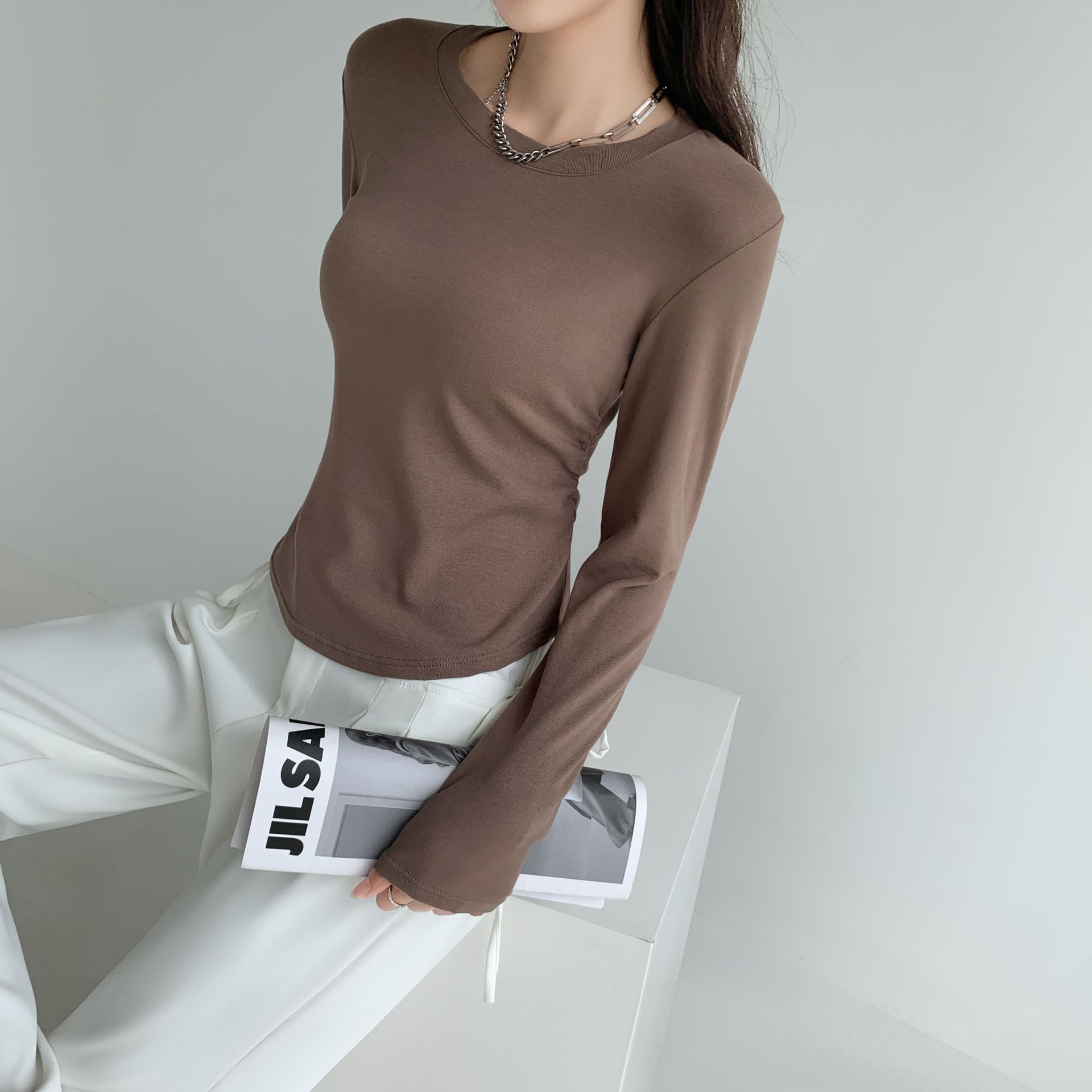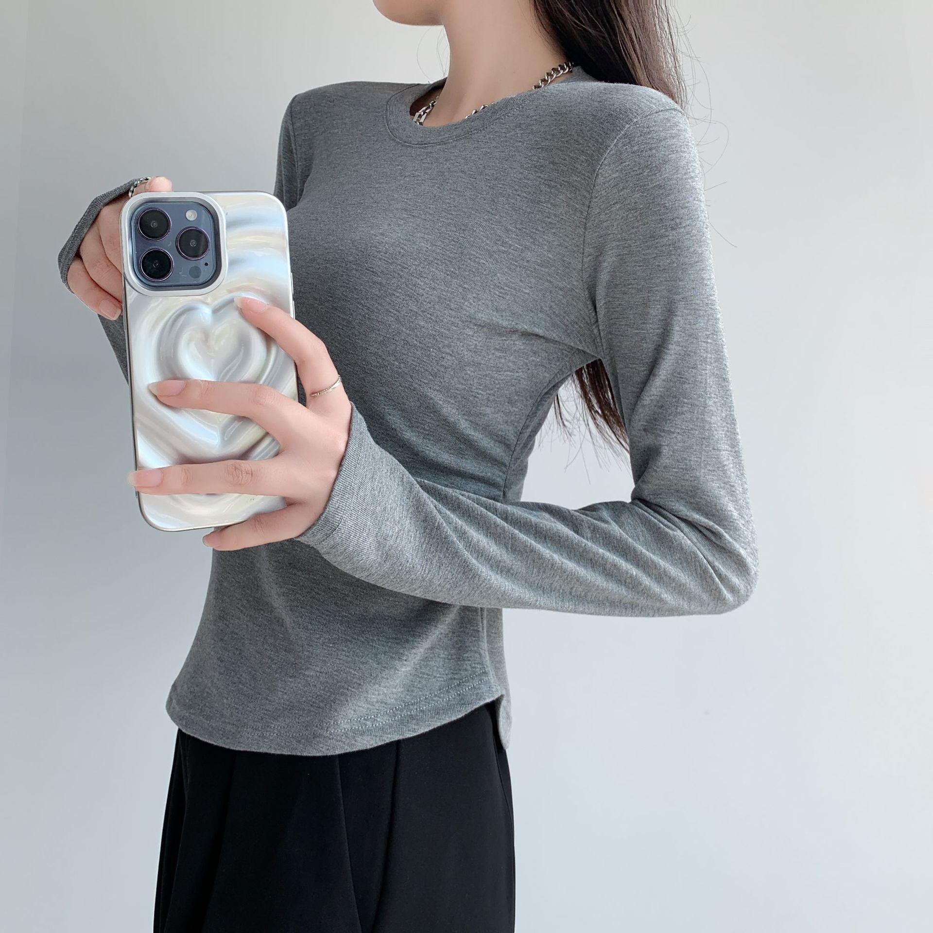 Cuello Redondo Cintura Elástica Color Sólido Hombro Regular Top Corto Ajustado para Mujer Camiseta Base Otoño Nuevo Estilo