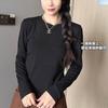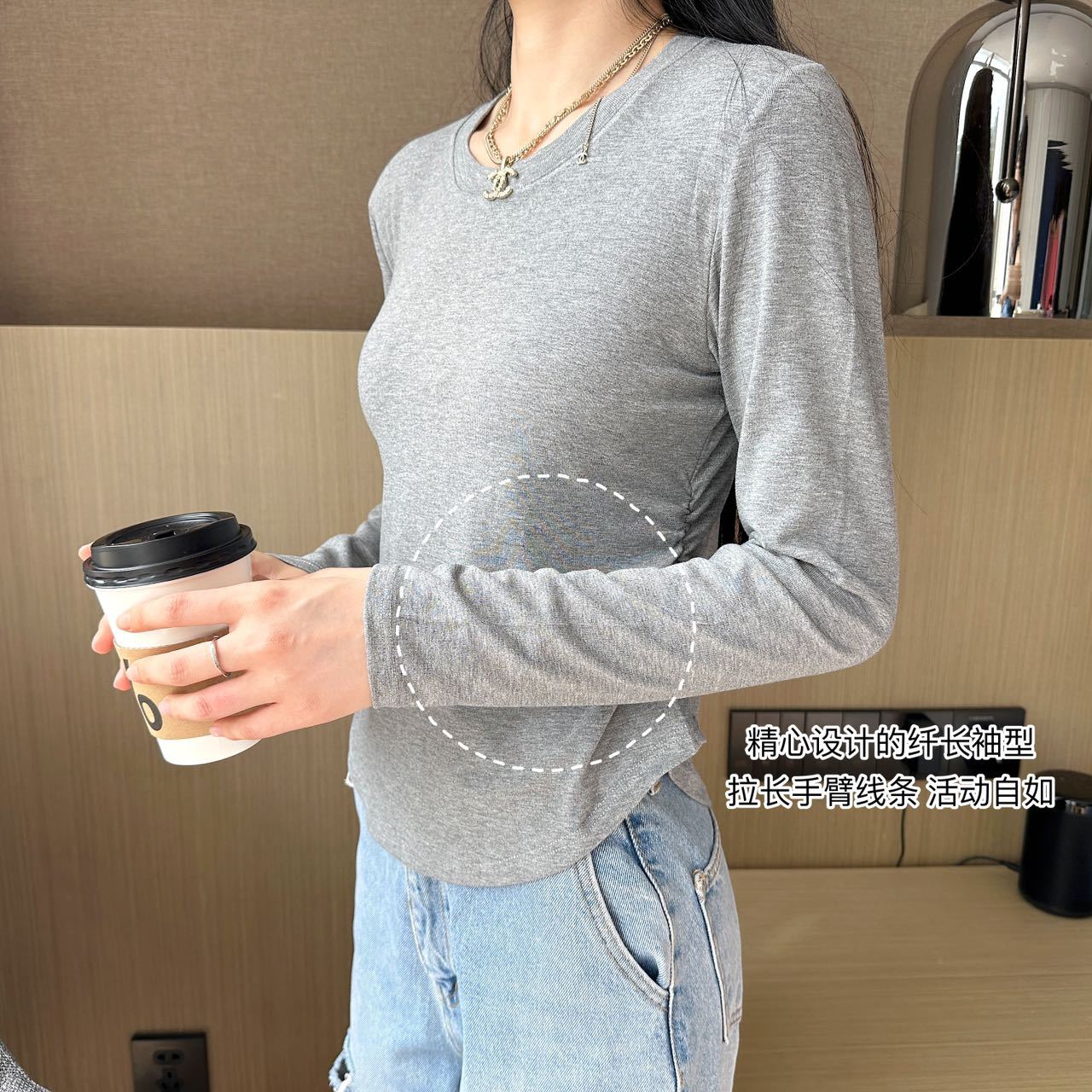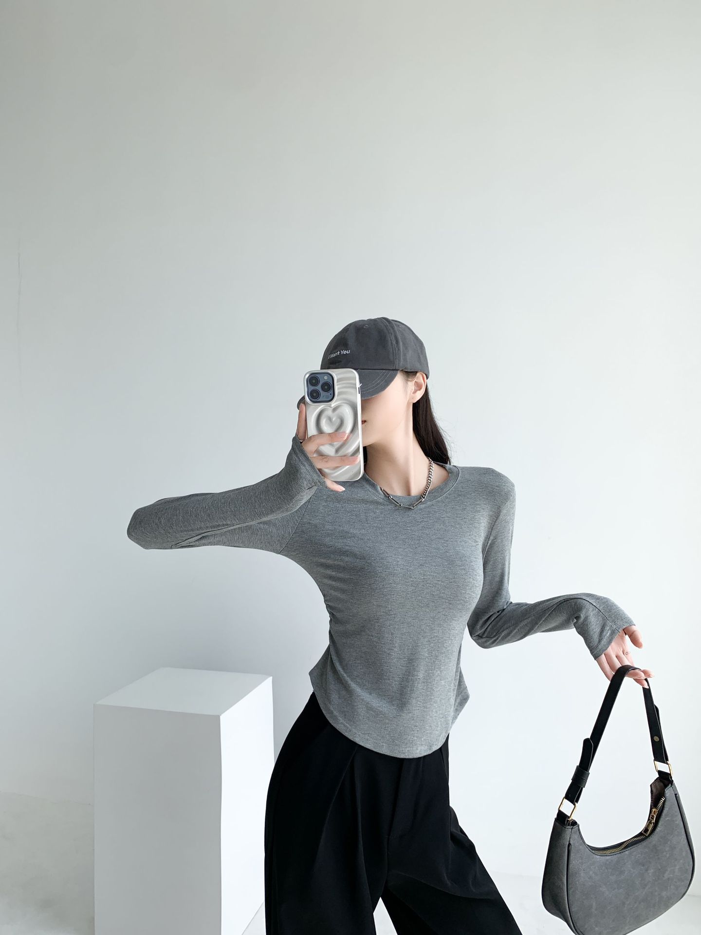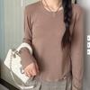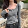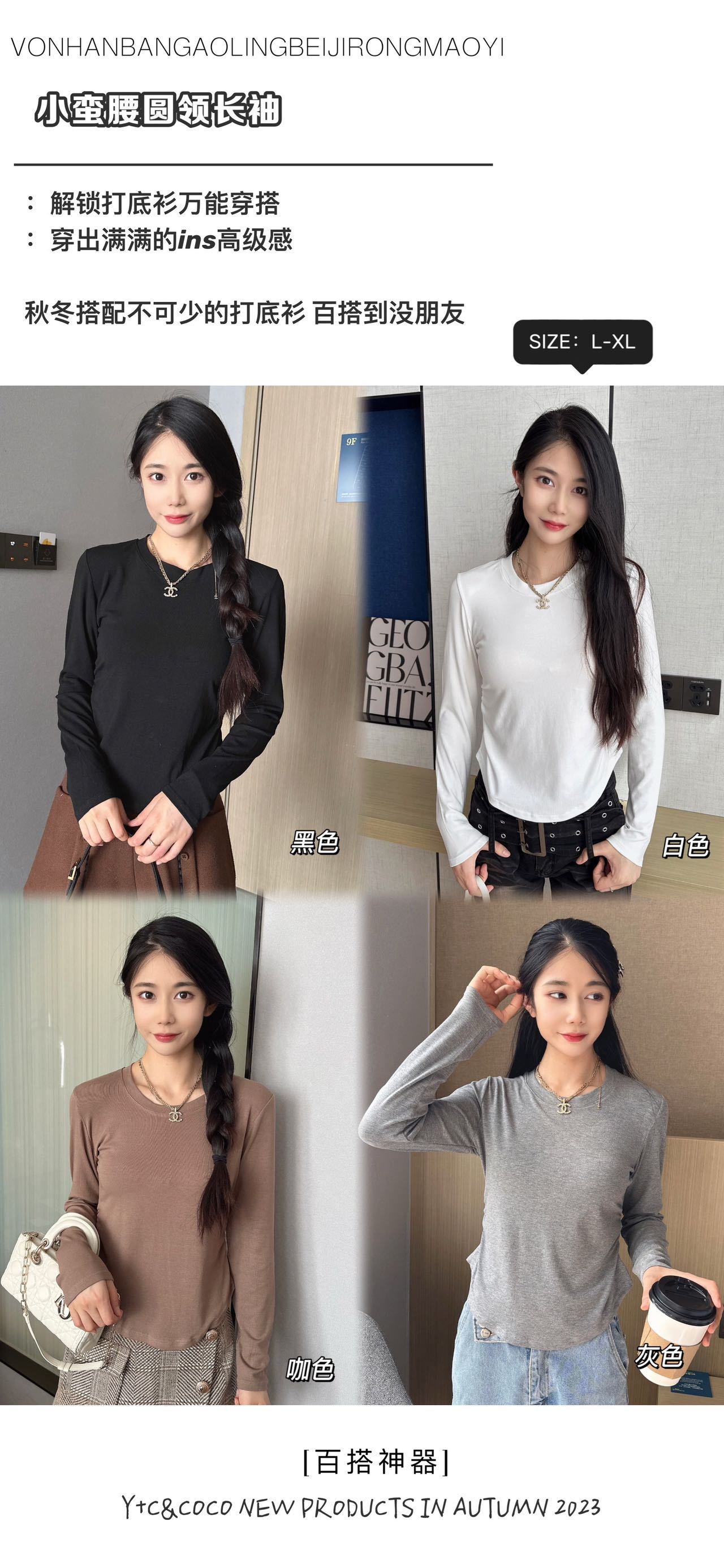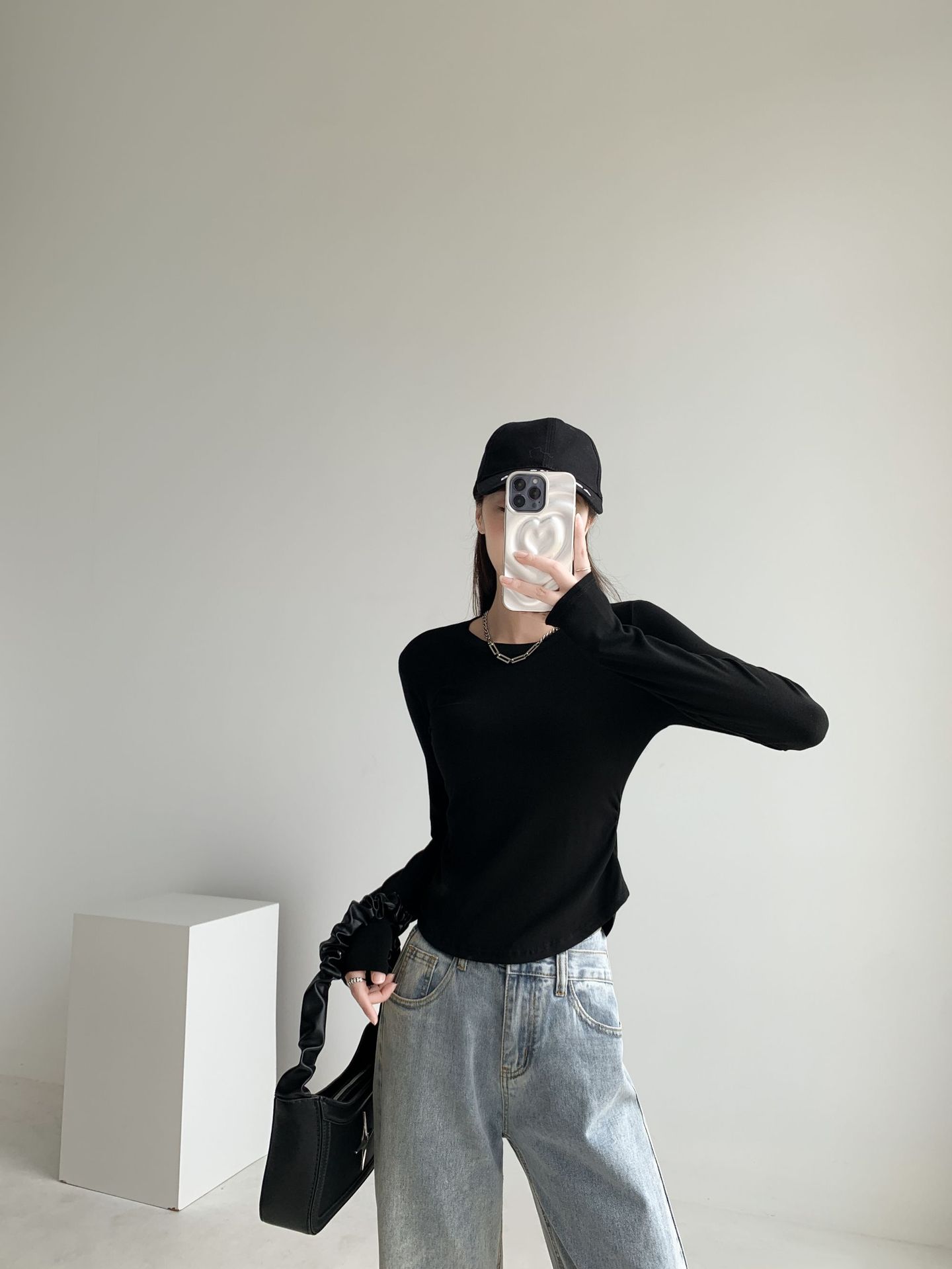 Cuello Redondo Cintura Elástica Color Sólido Hombro Regular Top Corto Ajustado para Mujer Camiseta Base Otoño Nuevo Estilo