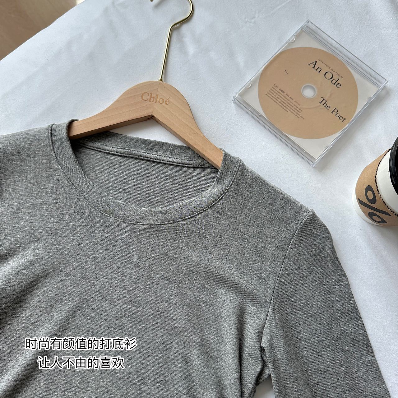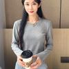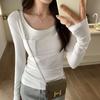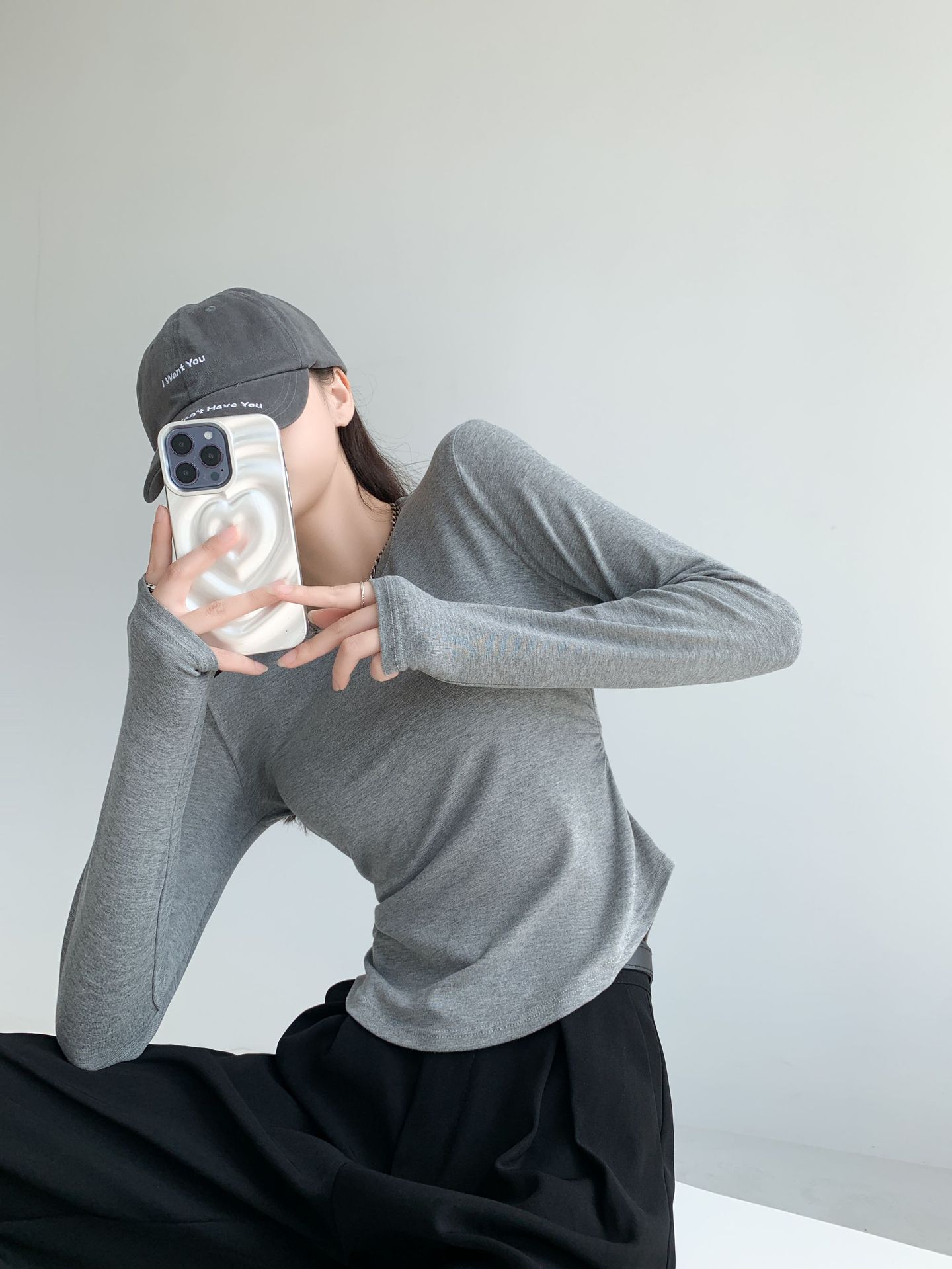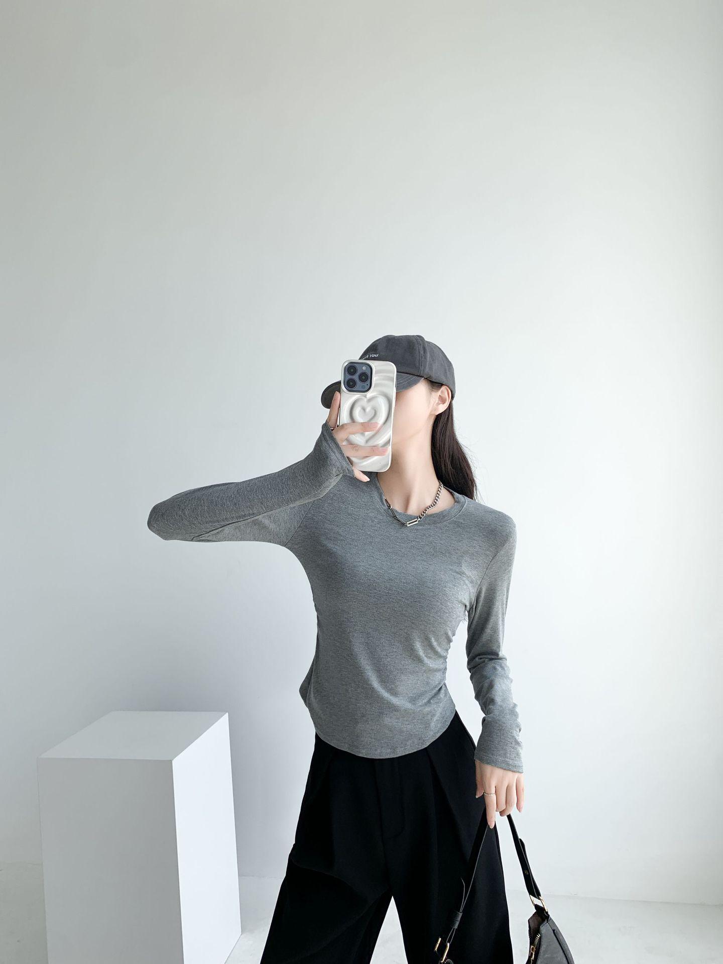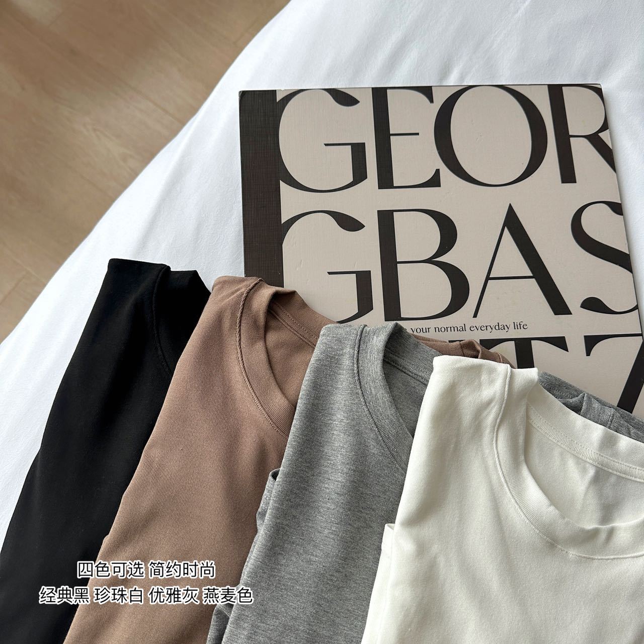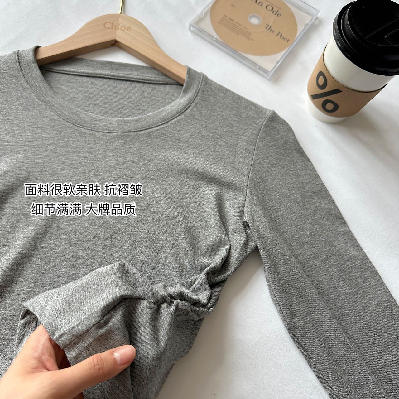 Cuello Redondo Cintura Elástica Color Sólido Hombro Regular Top Corto Ajustado para Mujer Camiseta Base Otoño Nuevo Estilo