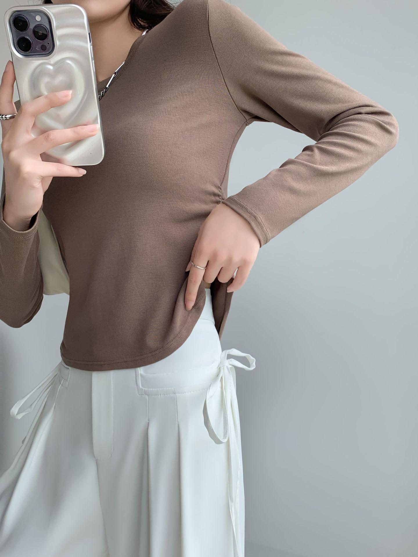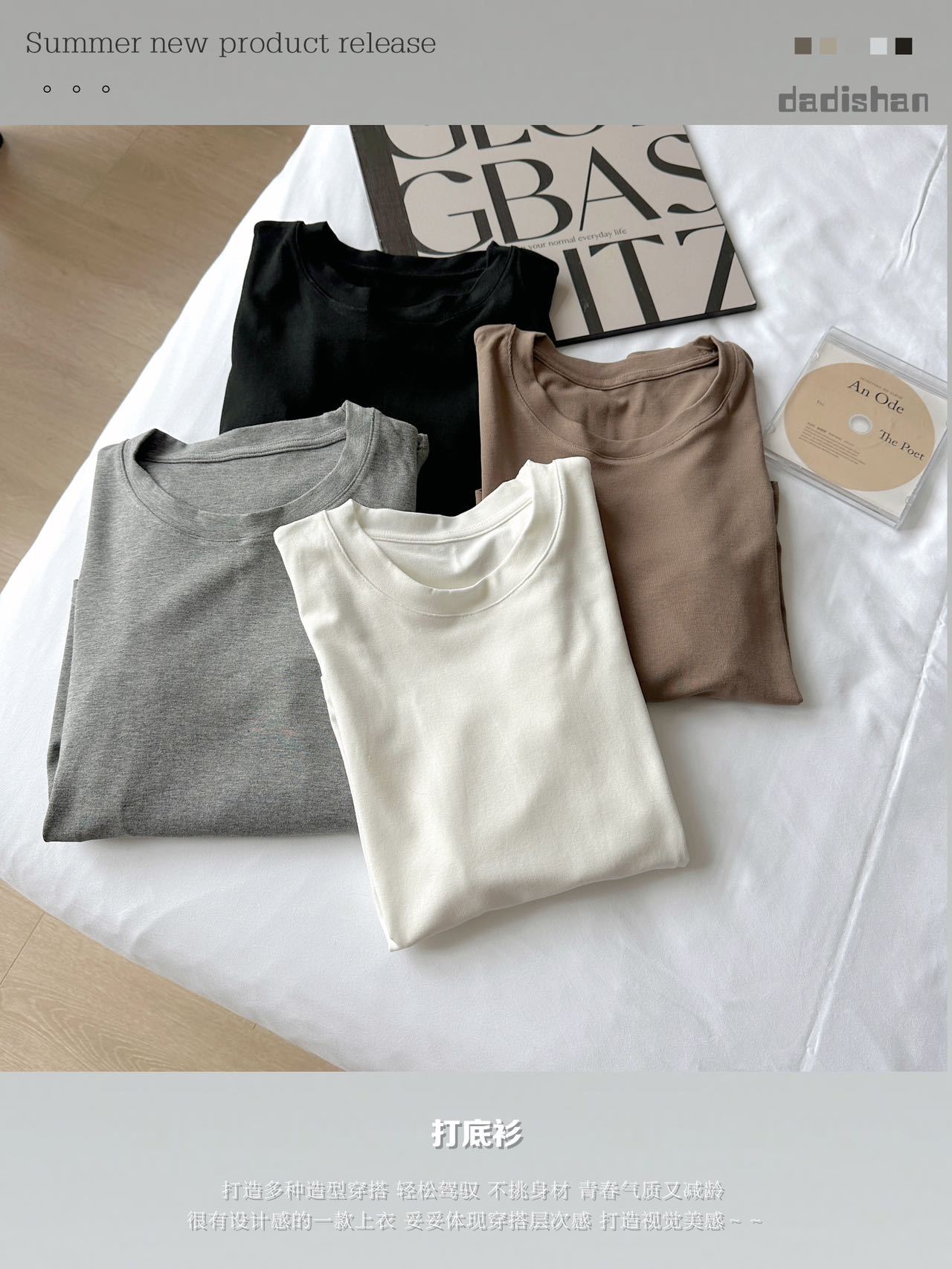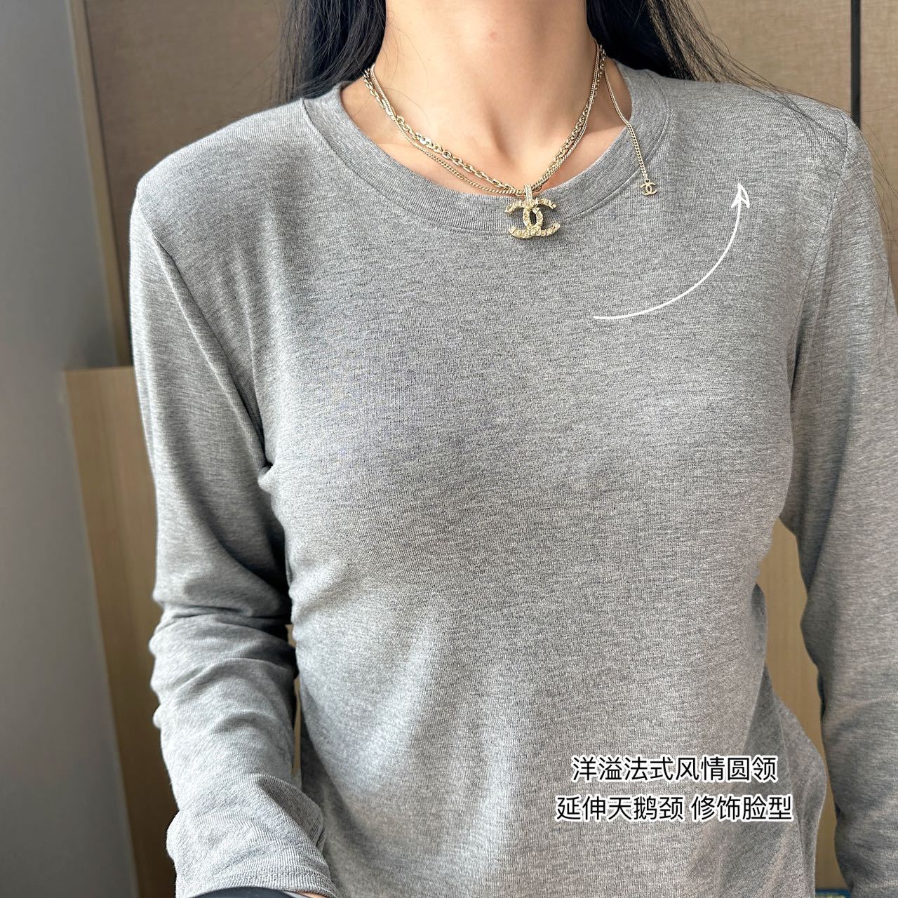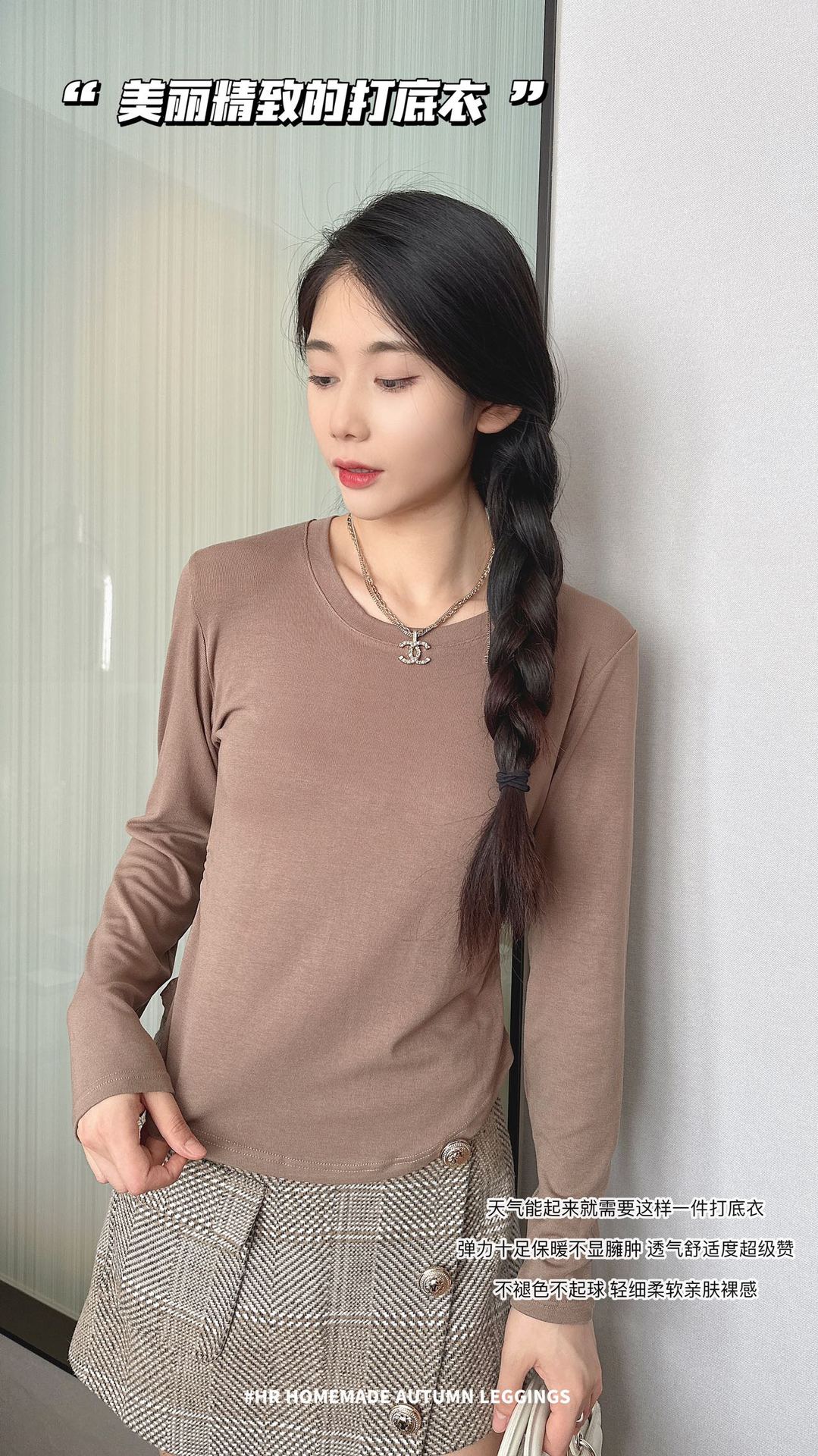 Cuello Redondo Cintura Elástica Color Sólido Hombro Regular Top Corto Ajustado para Mujer Camiseta Base Otoño Nuevo Estilo