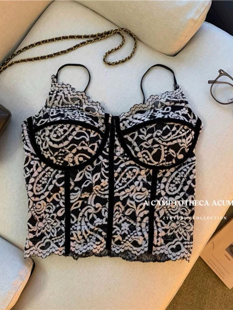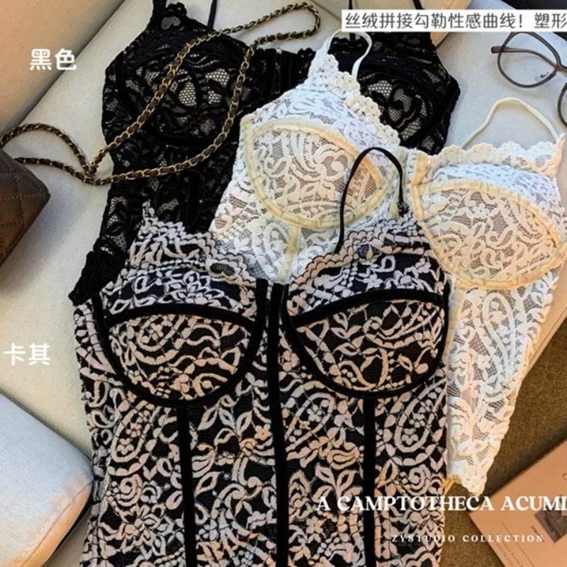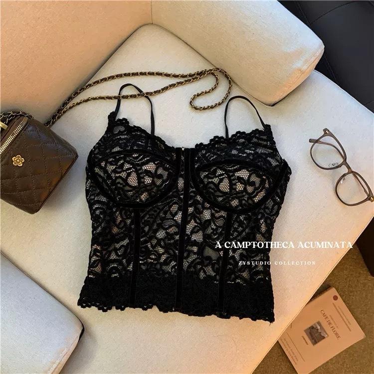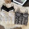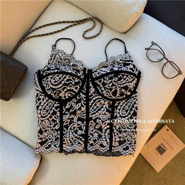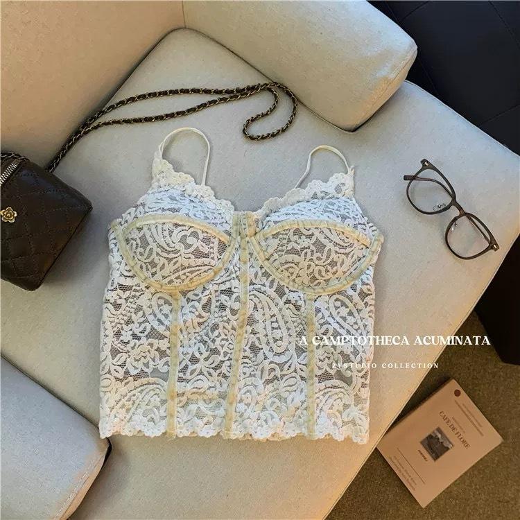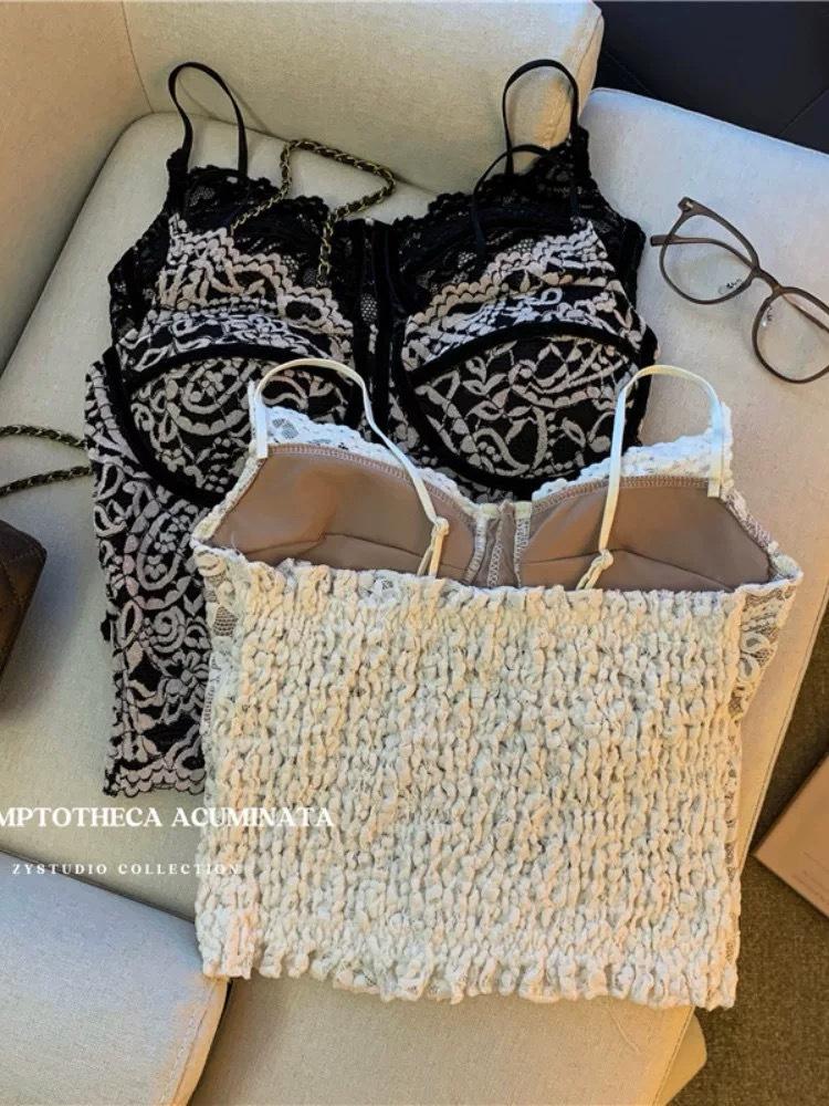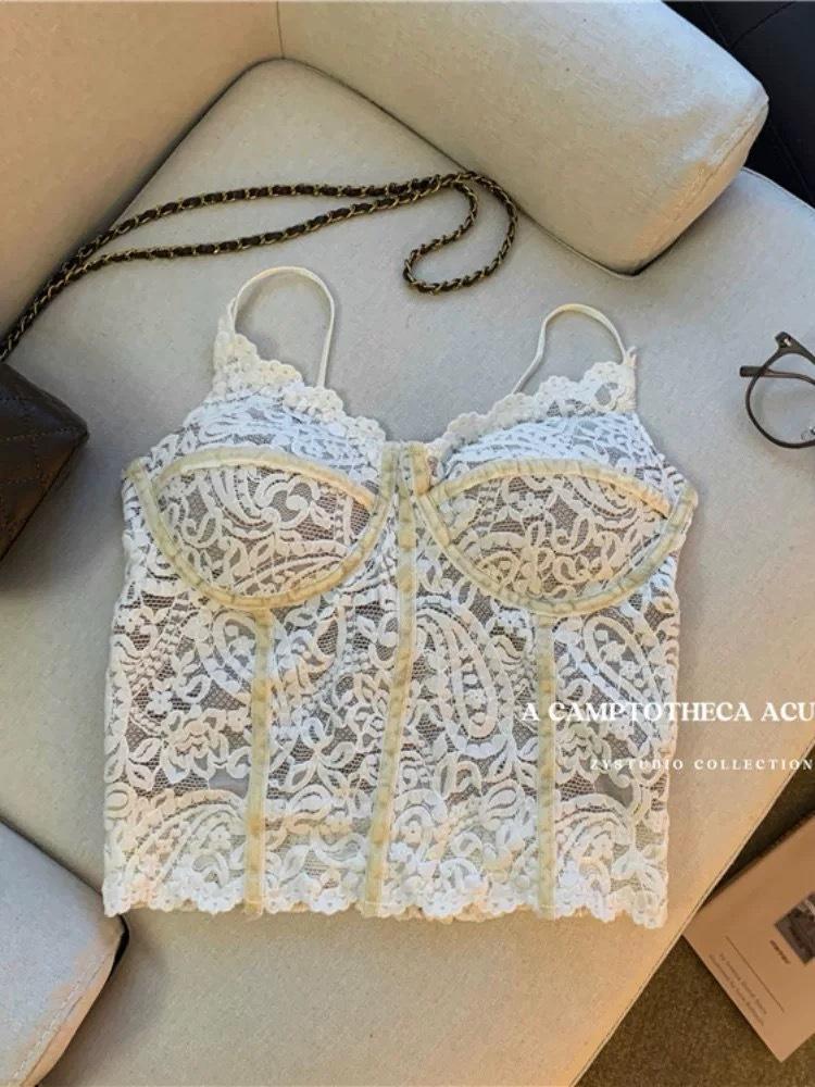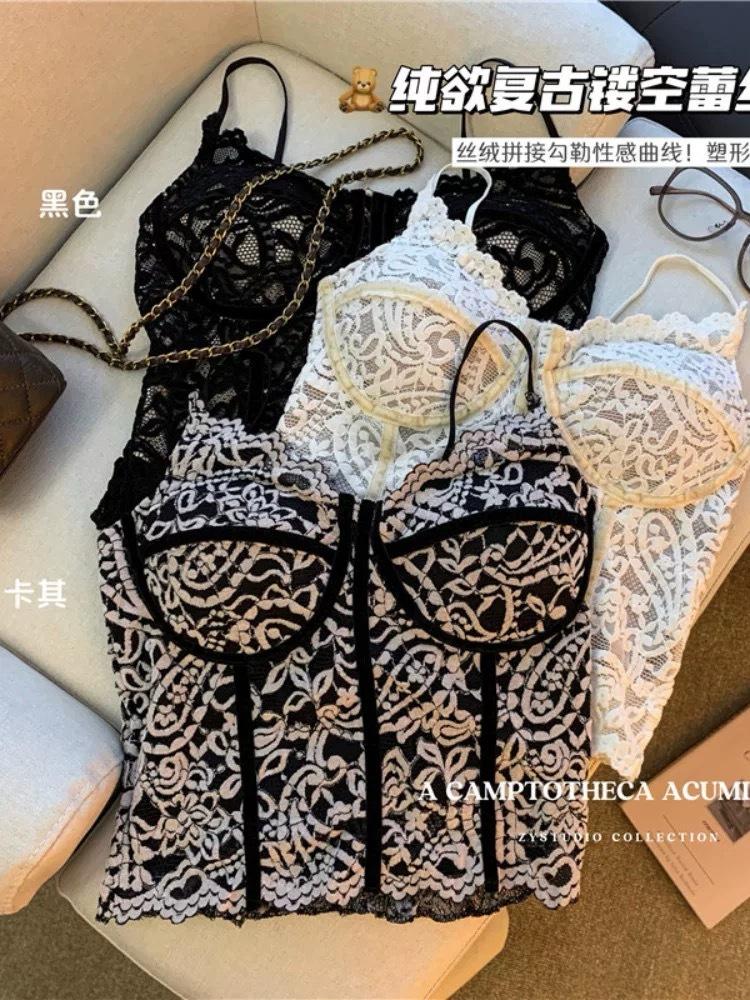Camisola de Encaje Bordado Francés Hermosa Espalda Íntimos Básicos para Mujer con Almohadillas para el Busto Look Adelgazante Top Exterior