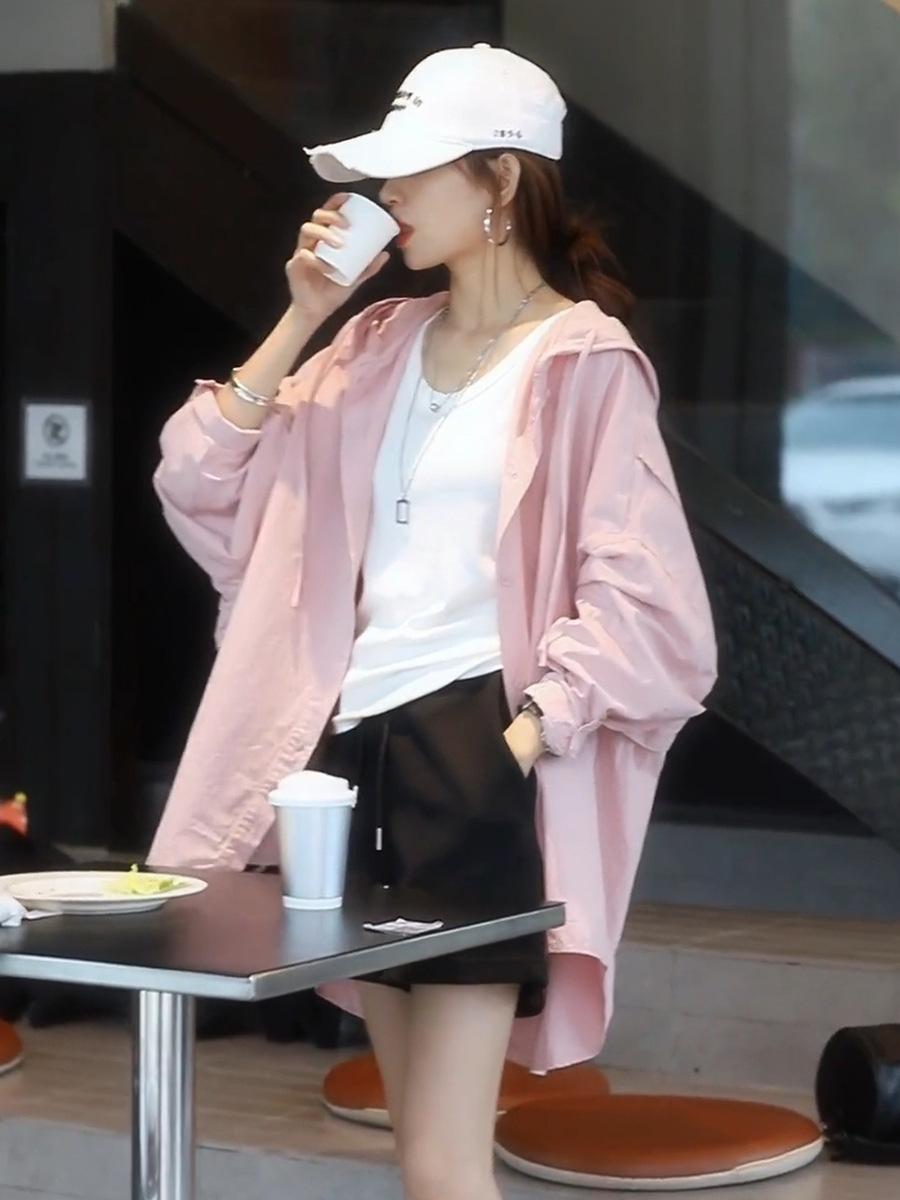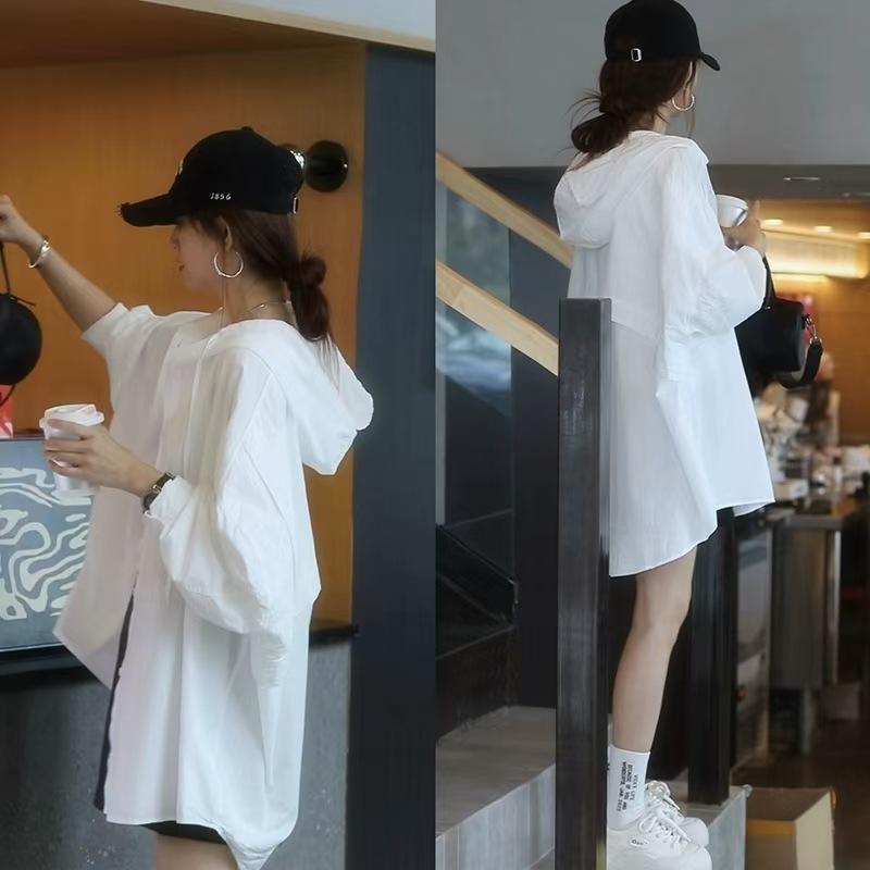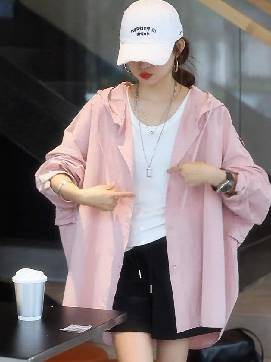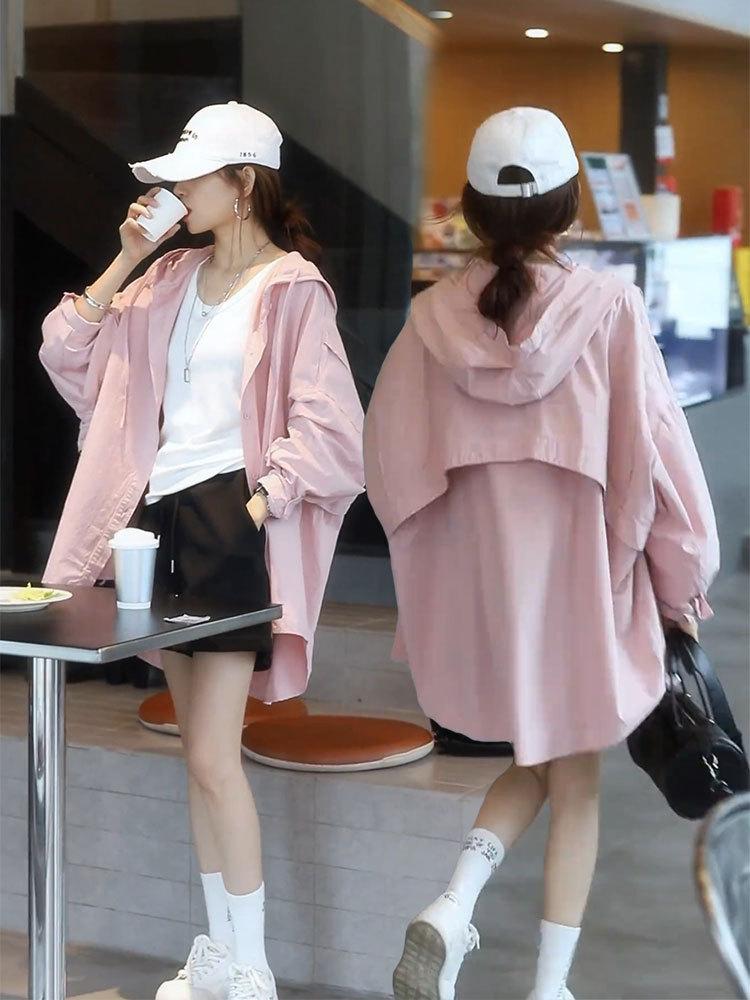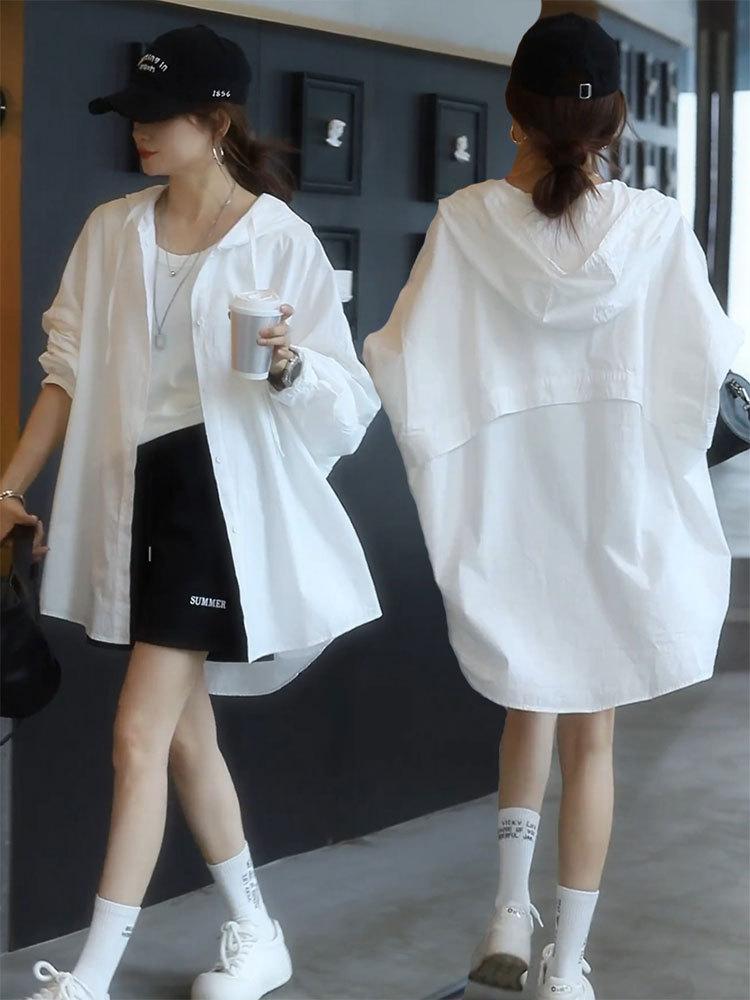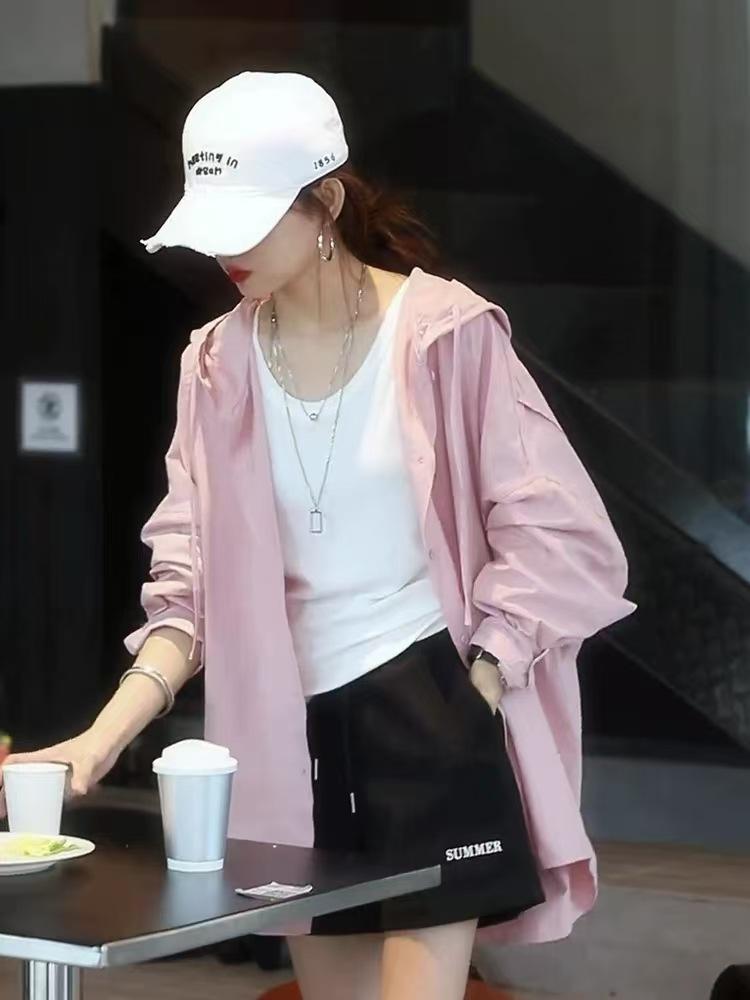 Camiseta holgada casual de gran tamaño con capucha para mujer Primavera y Verano Nuevo estilo coreano Ropa de protección solar Chaqueta de camisa versátil y a la moda para mujer