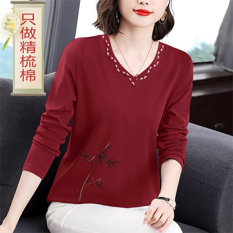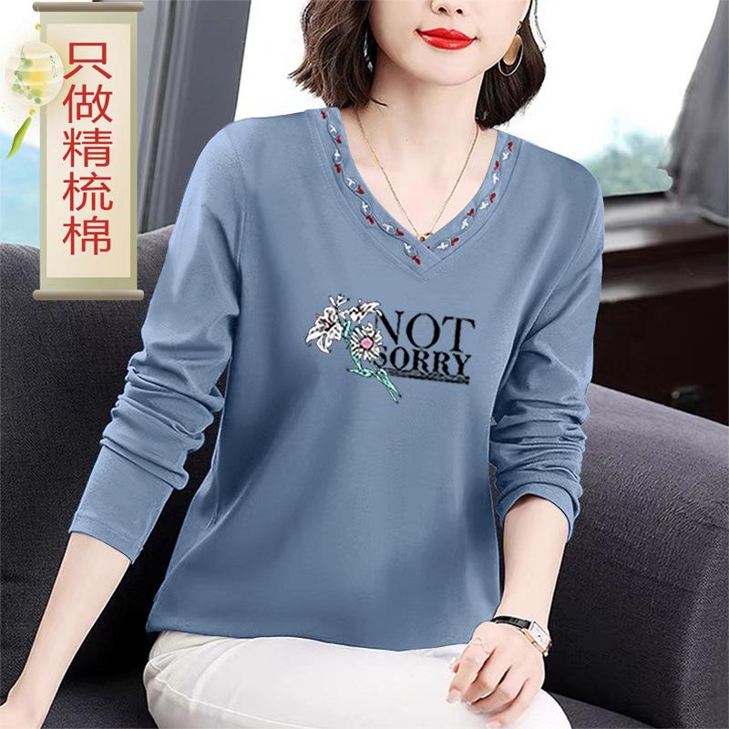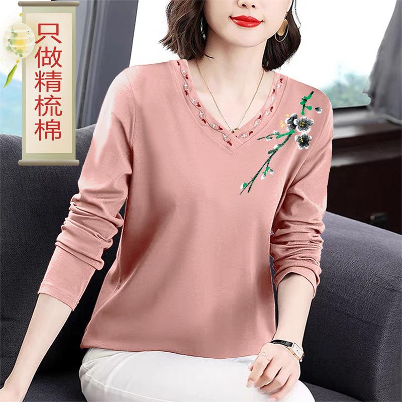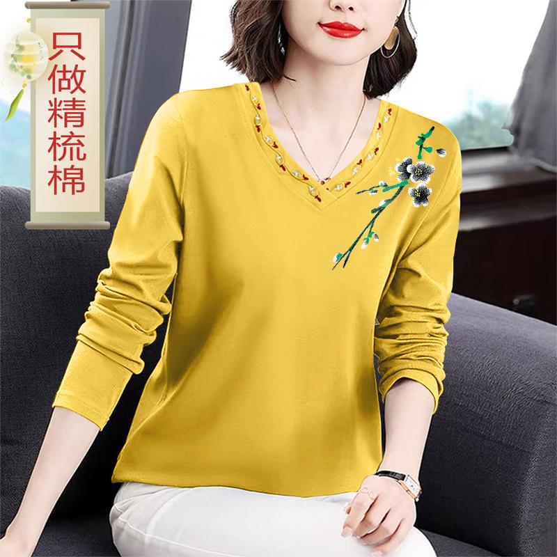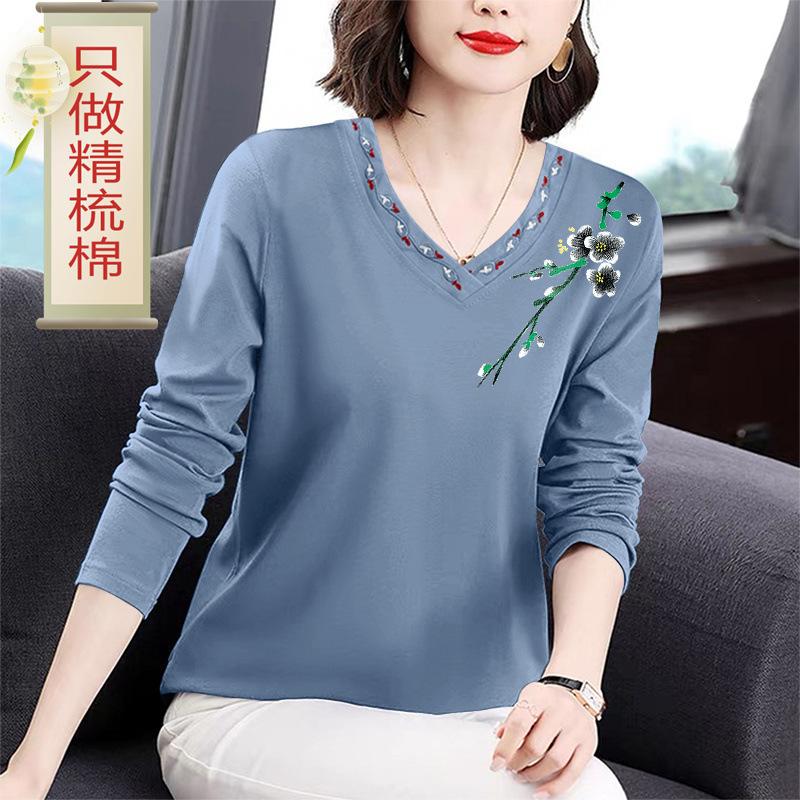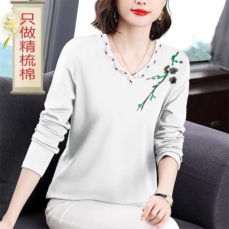 Camisa de manga larga algodón ropa de mujer primavera y otoño estilo occidental decoración joven madre cuerpo algodón camisa base cuello bordado top