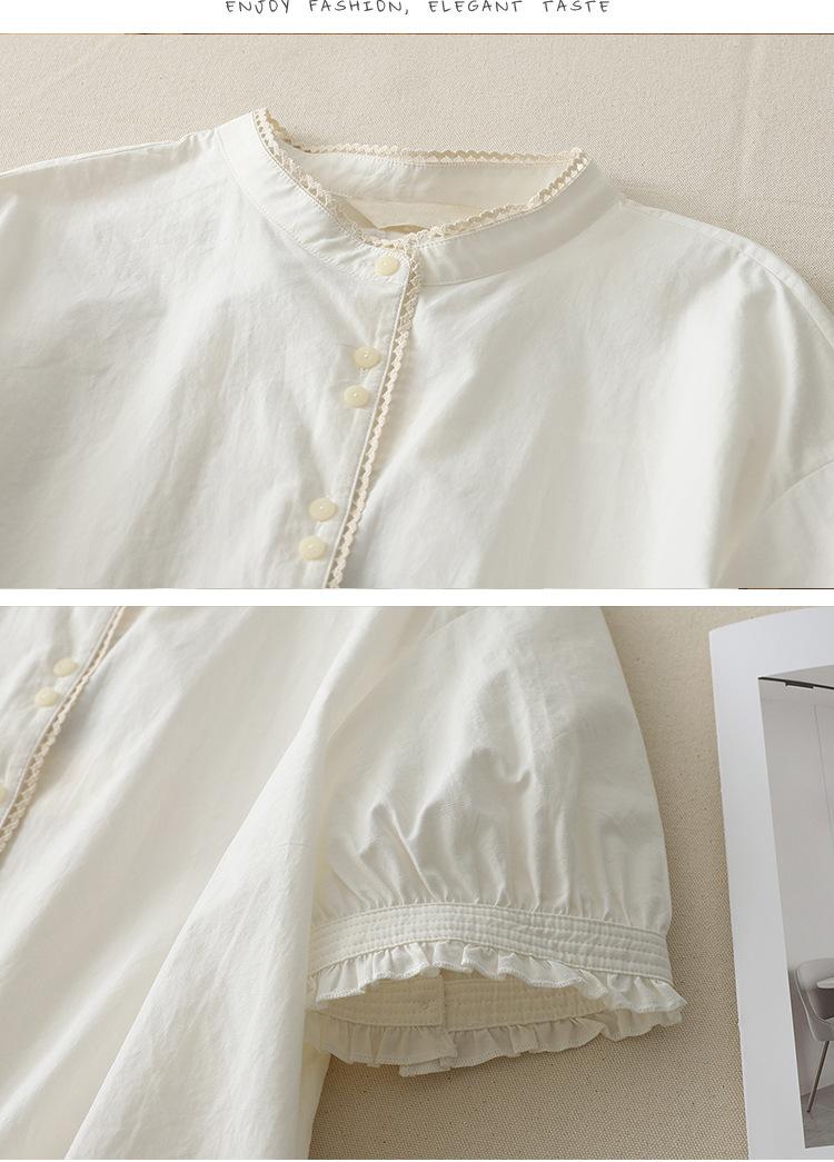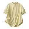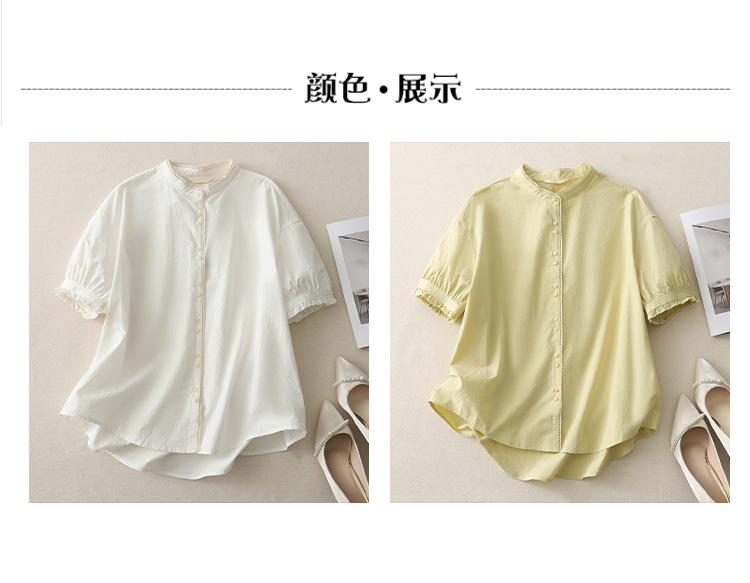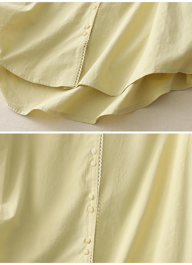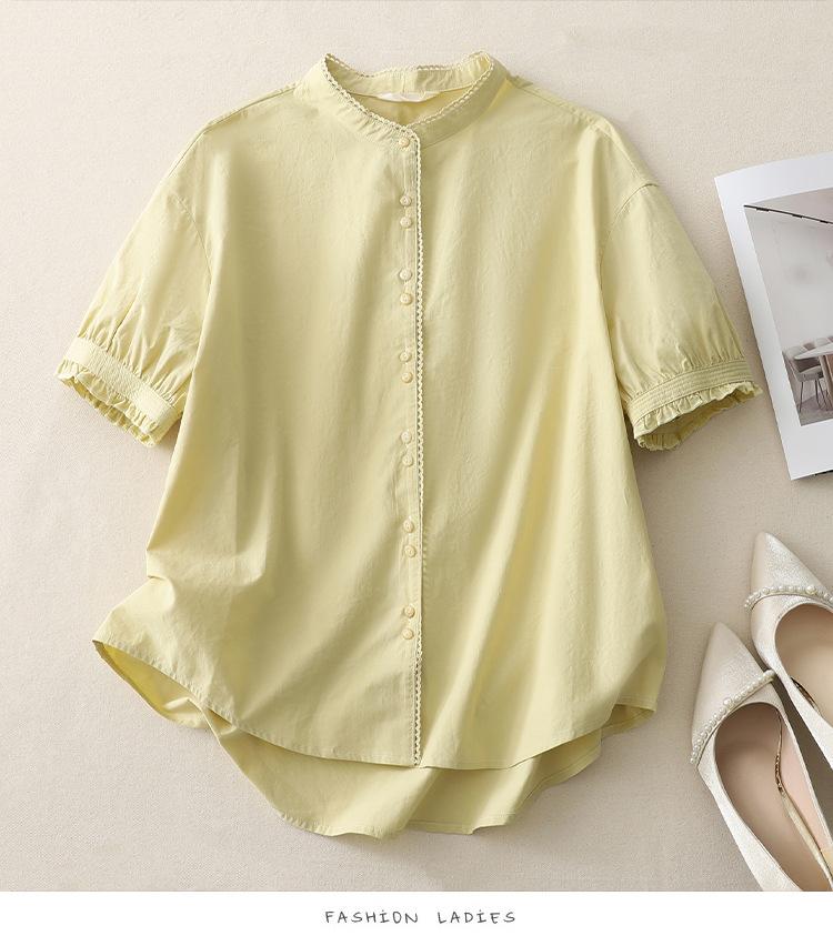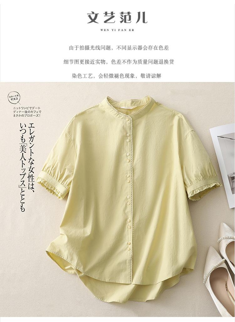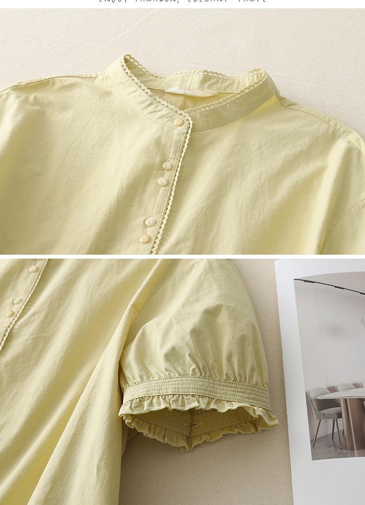 Foto Real# Camisa de Manga Corta Amarilla Fresca Estilo Japonés para Mujer Diseño de Algodón Puro Nicho con Encaje Camisa de Cuello Redondo para Verano