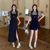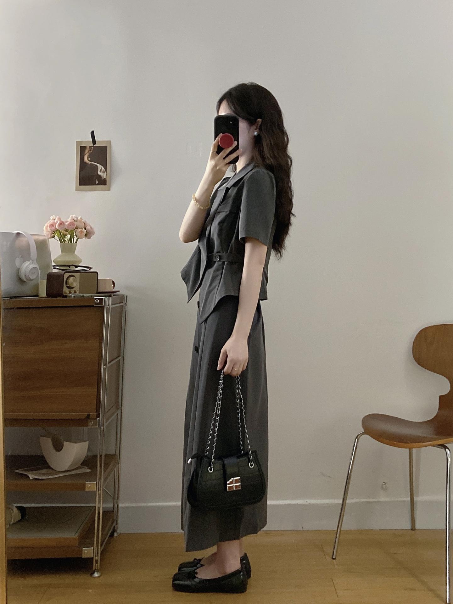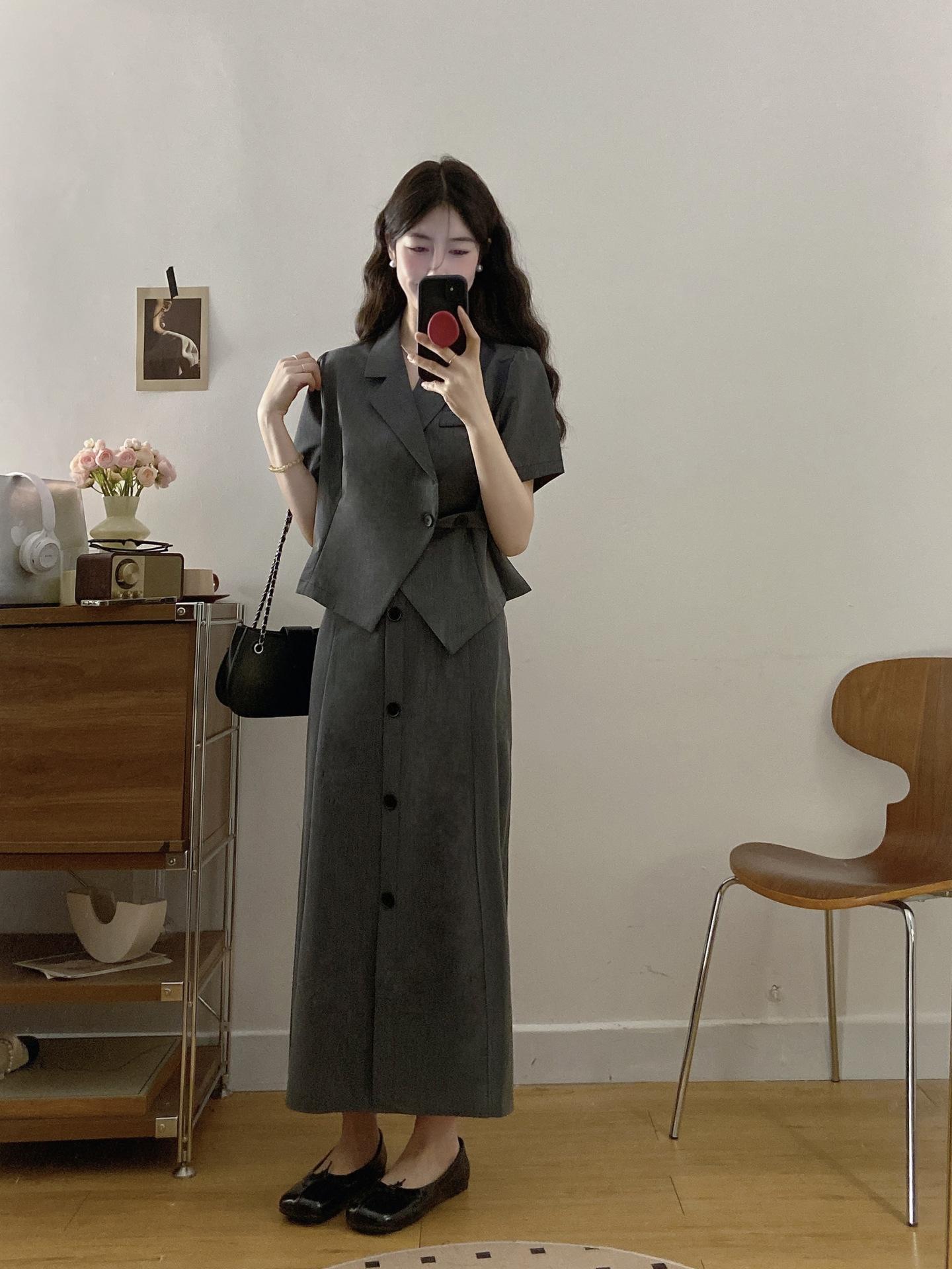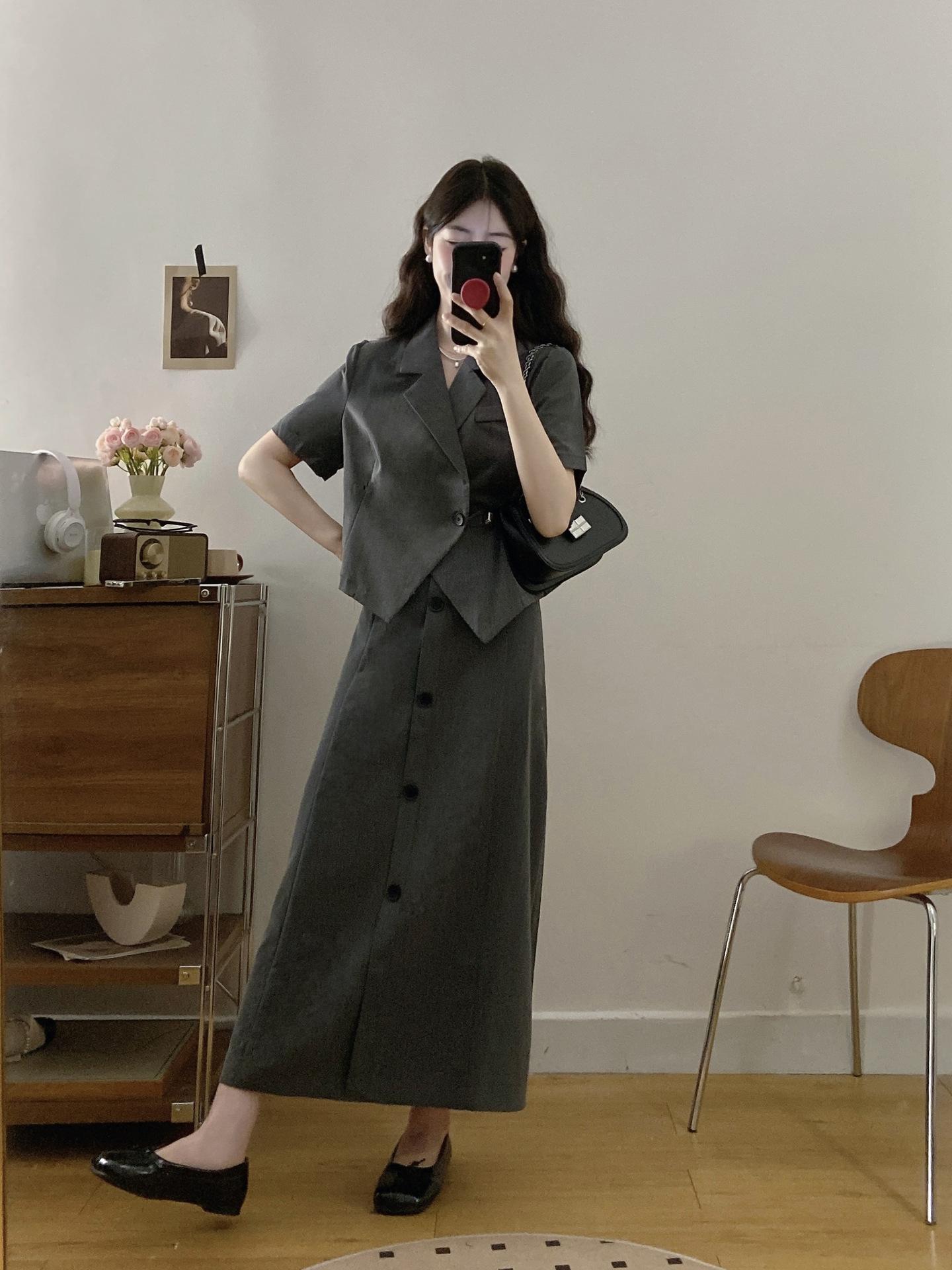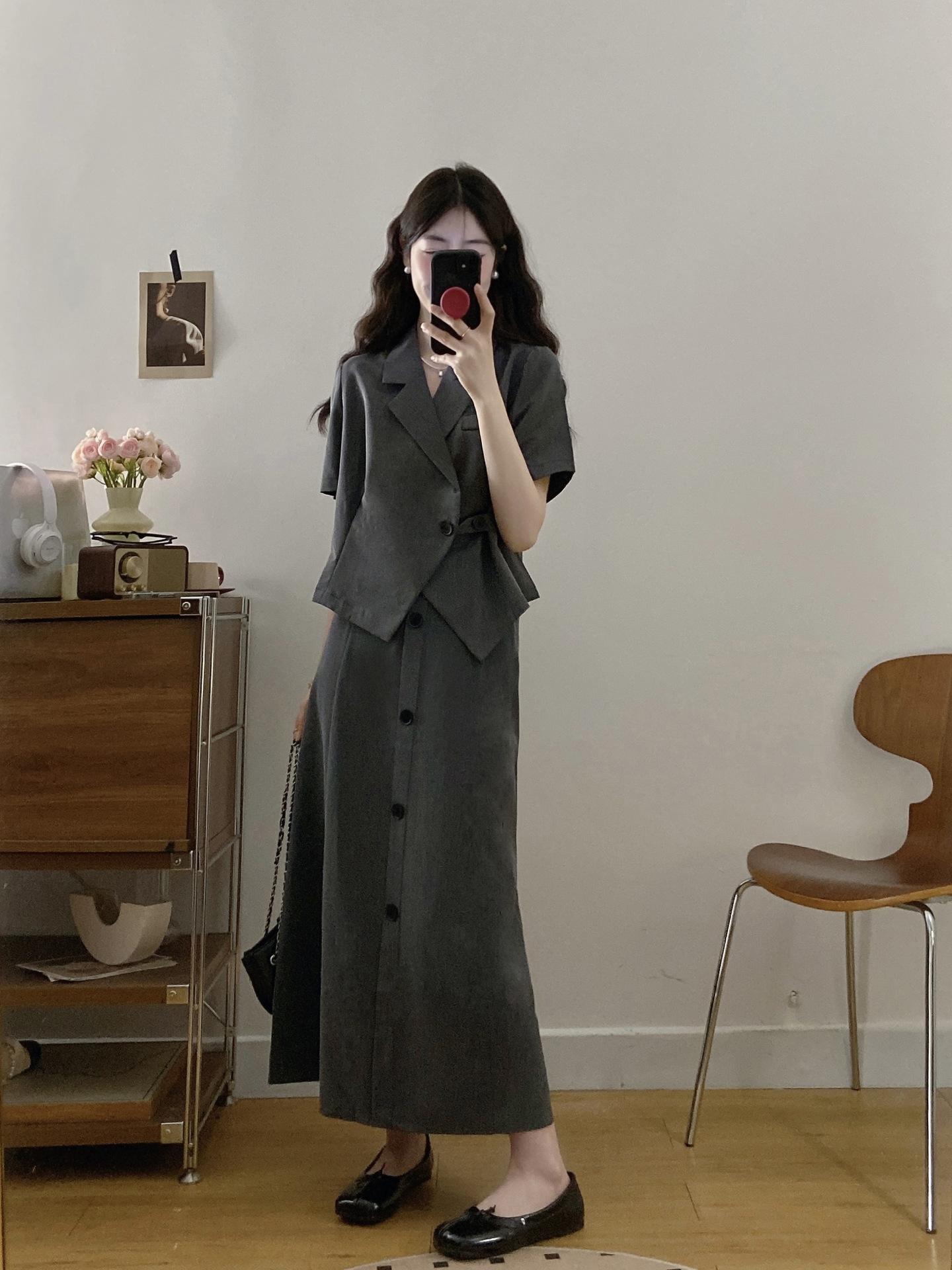 Talla grande Mujer gordita Elegante Top de Traje de Manga Corta Falda de Cintura Alta Verano Nuevo Adelgazante Commuter Conjunto de Dos Piezas