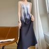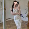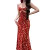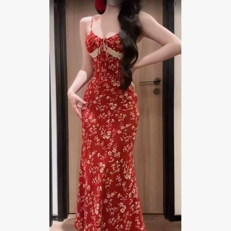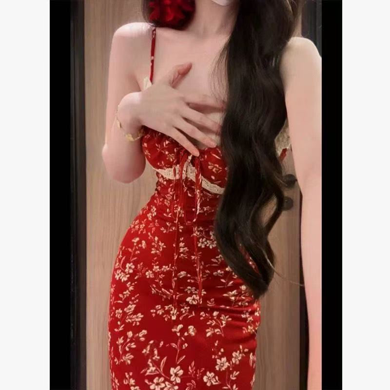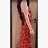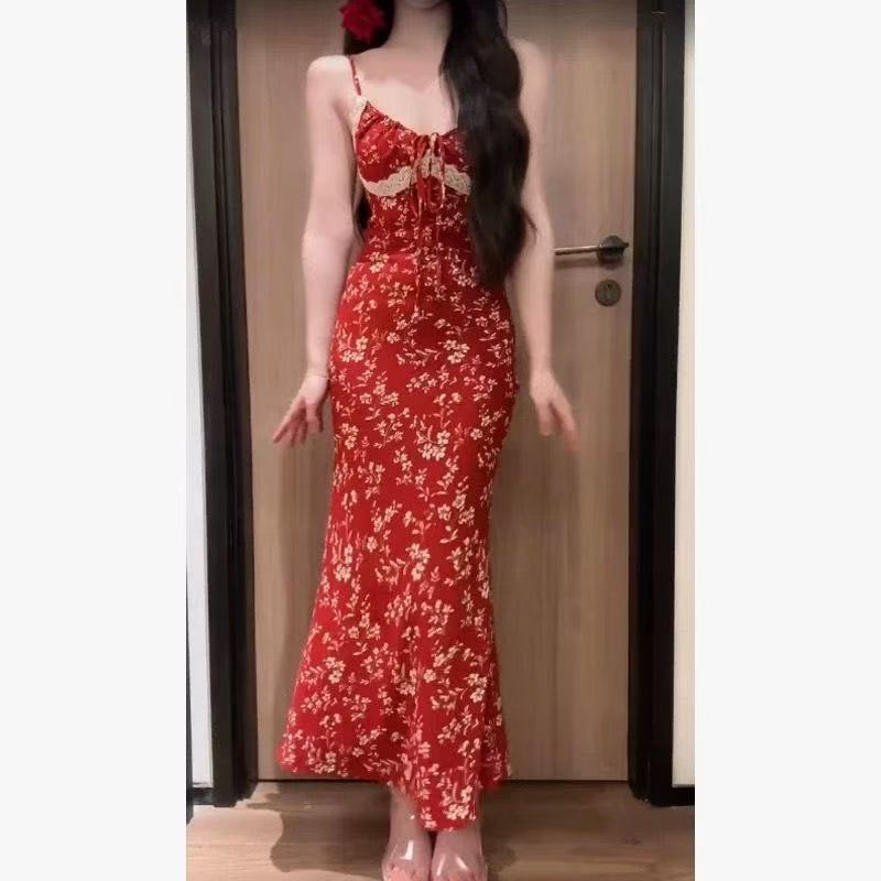 Vestido Floral Rojo con Tirantes para Mujer Verano Retro Temperamento Cintura Adelgazante Falda Cadera Nueva Falda Larga Francesa